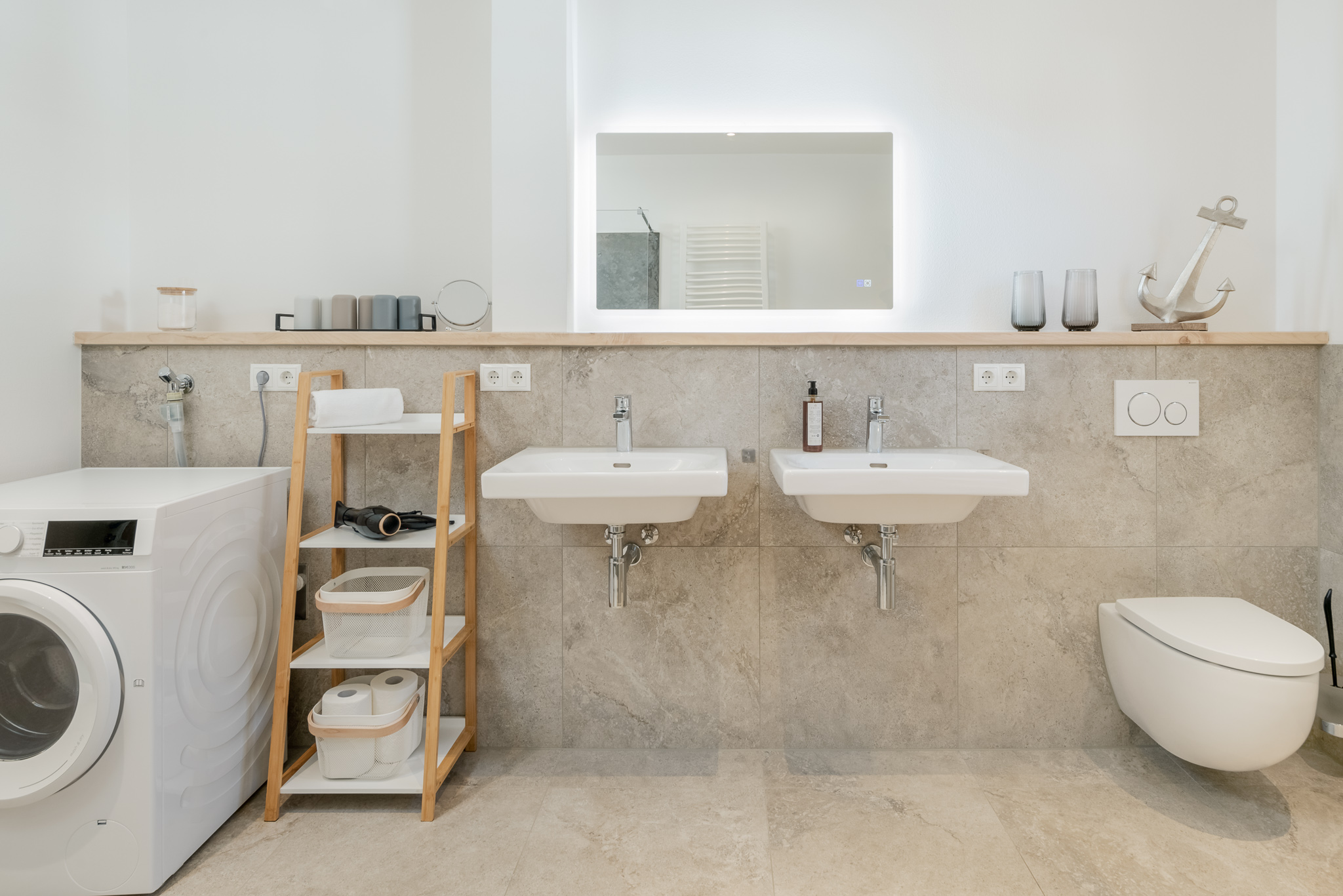 Für Deinen Komfort stellen wir frische Handtücher sowie alle wichtigen Dinge wie Duschgel und Shampoo zur Verfügung. Im Badezimmer findest Du außerdem einen Waschtrockner, sodass Du deine Wäsche bequem vor Ort erledigen kannst.