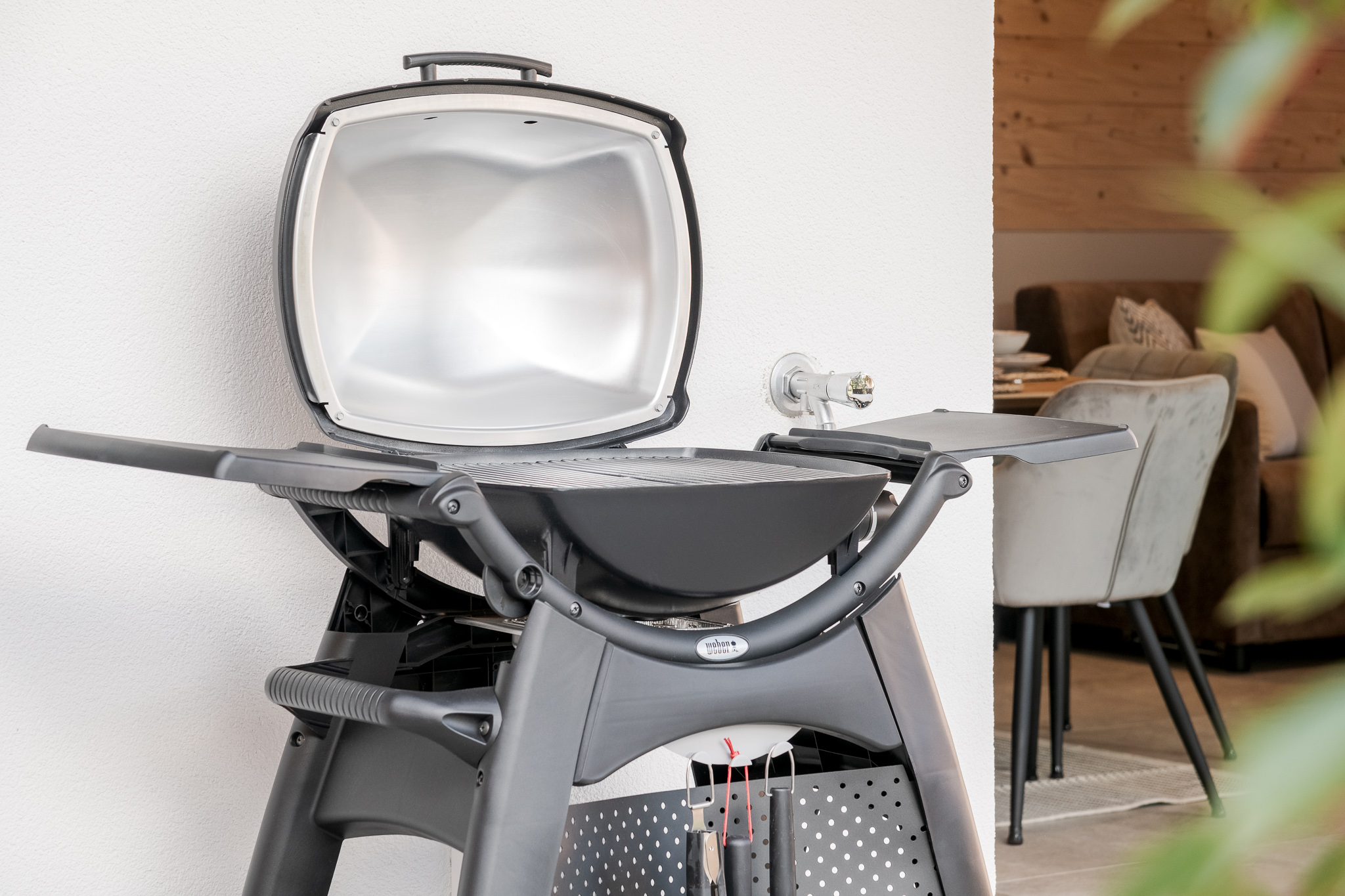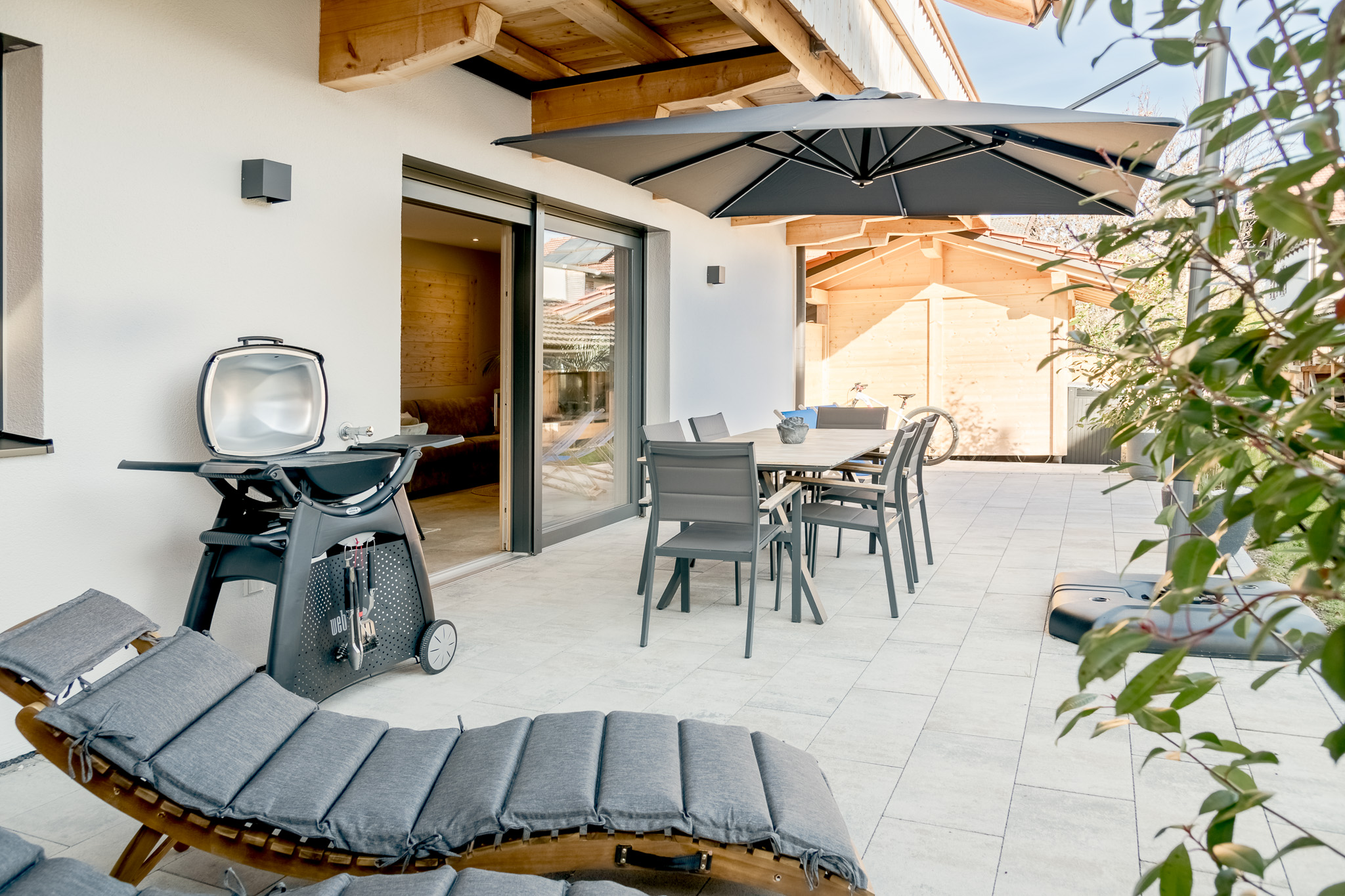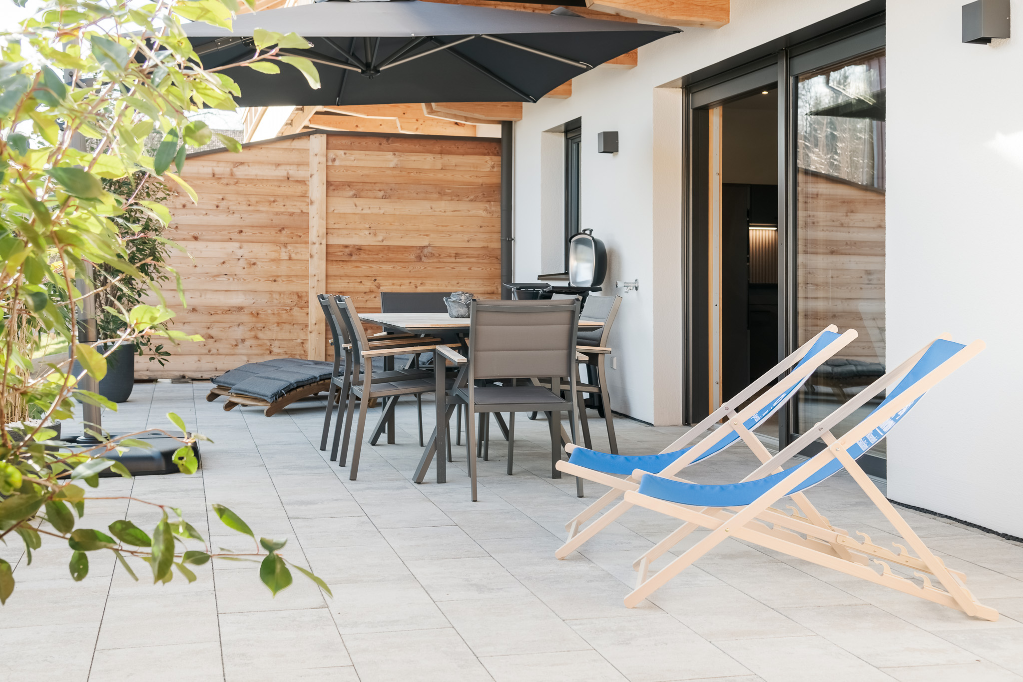 Auf der Terrasse erwarten Dich weitere Sitzmöglichkeiten, Liegestühle zum relaxen und ein Weber-Grill für gemütliche Abende.