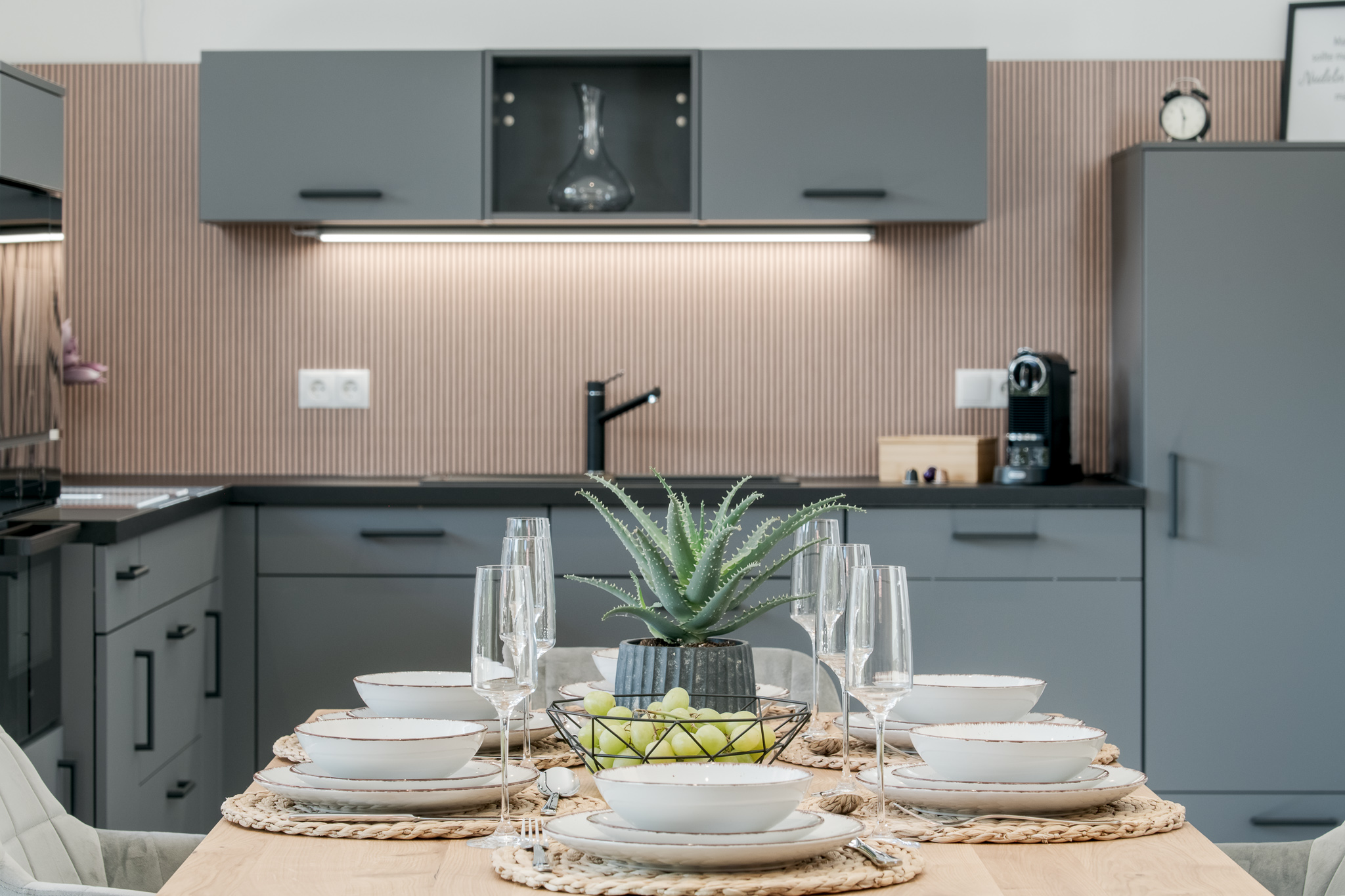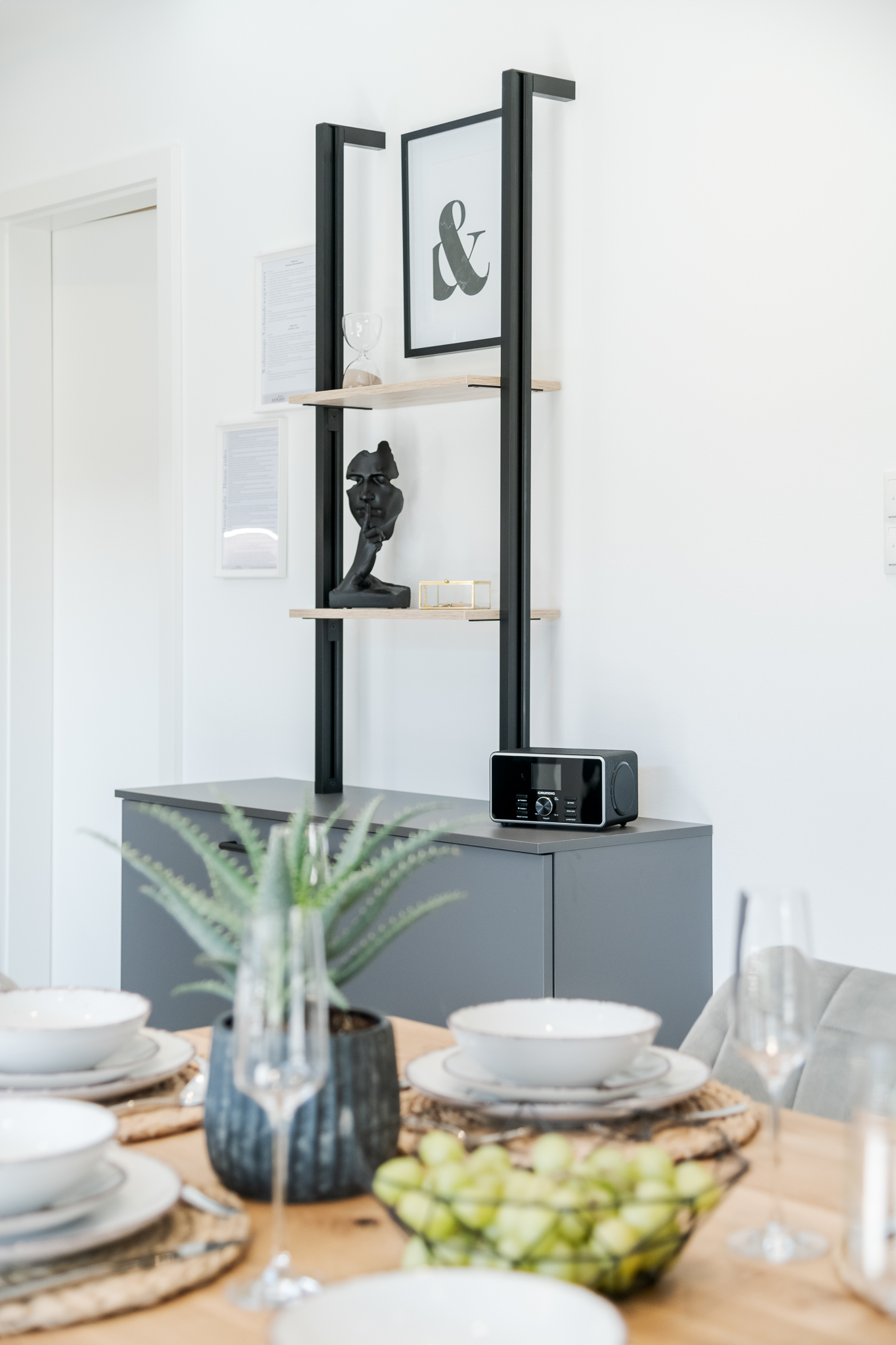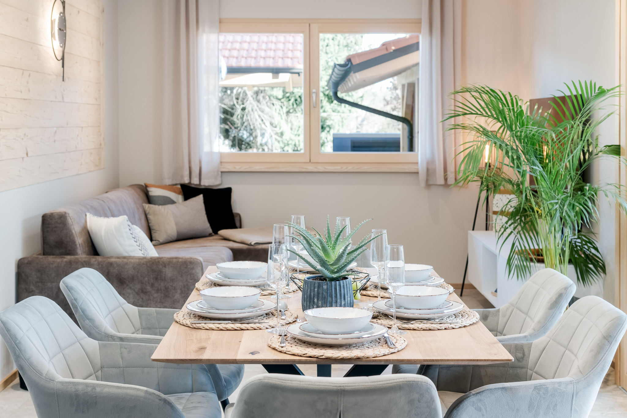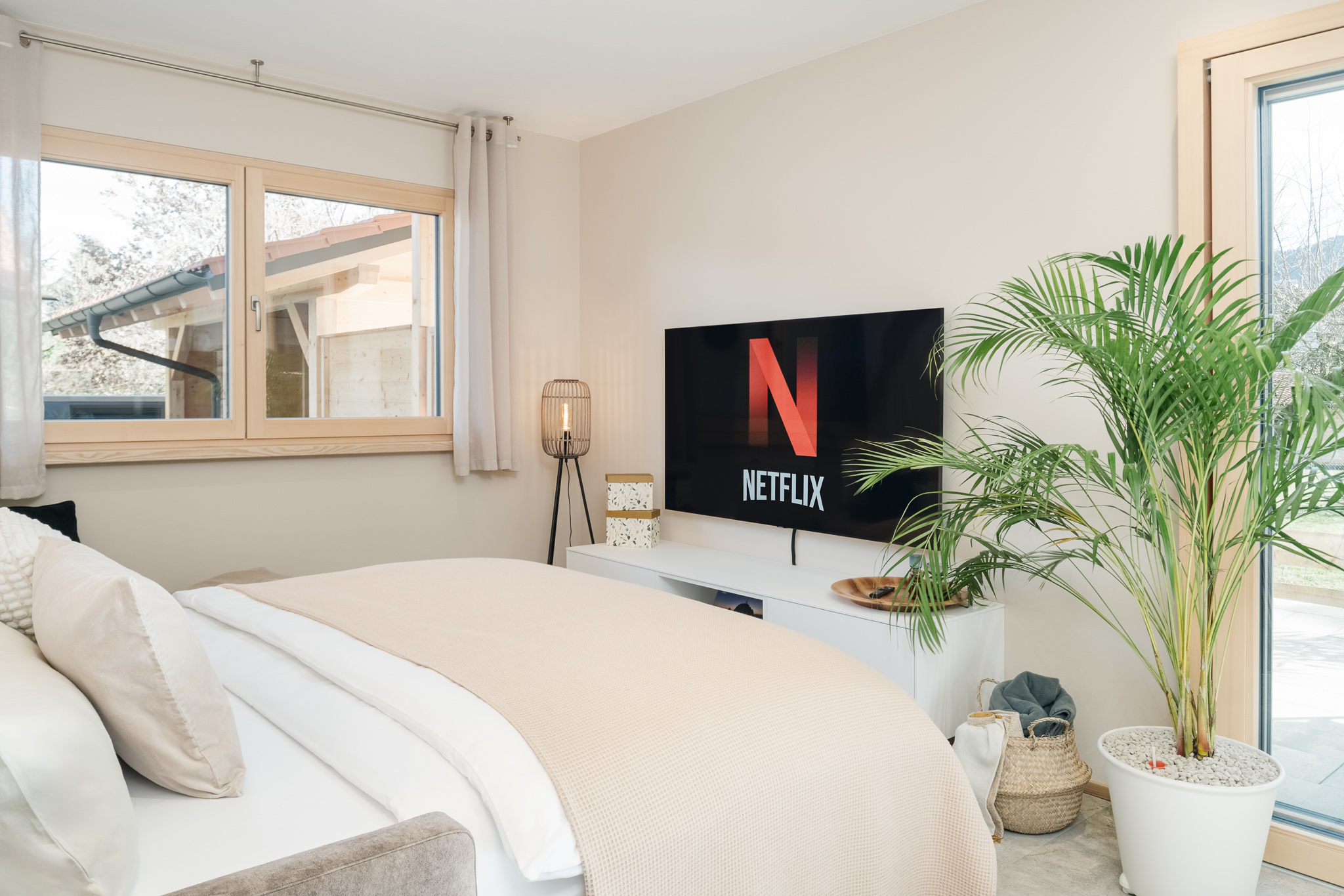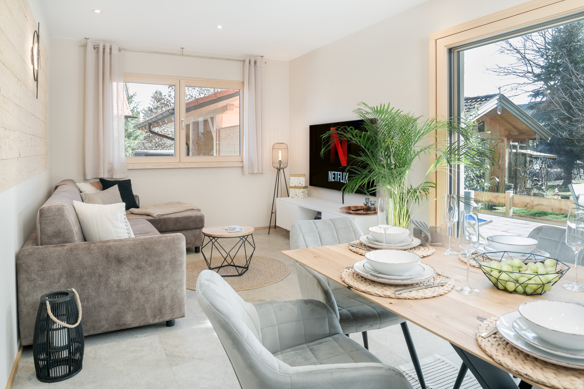 Darüber hinaus verfügt die Wohnung über einen Essbereich für 6 Personen. Entspann Dich anschließend im gemütlichen Ambiente, das mit einem 65-Zoll-Smart-TV inkl. NETFLIX und Internet-TV in UHD-Qualität ausgestattet ist. Genieße Deine Lieblingssendungen und Filme in bester Bildqualität.