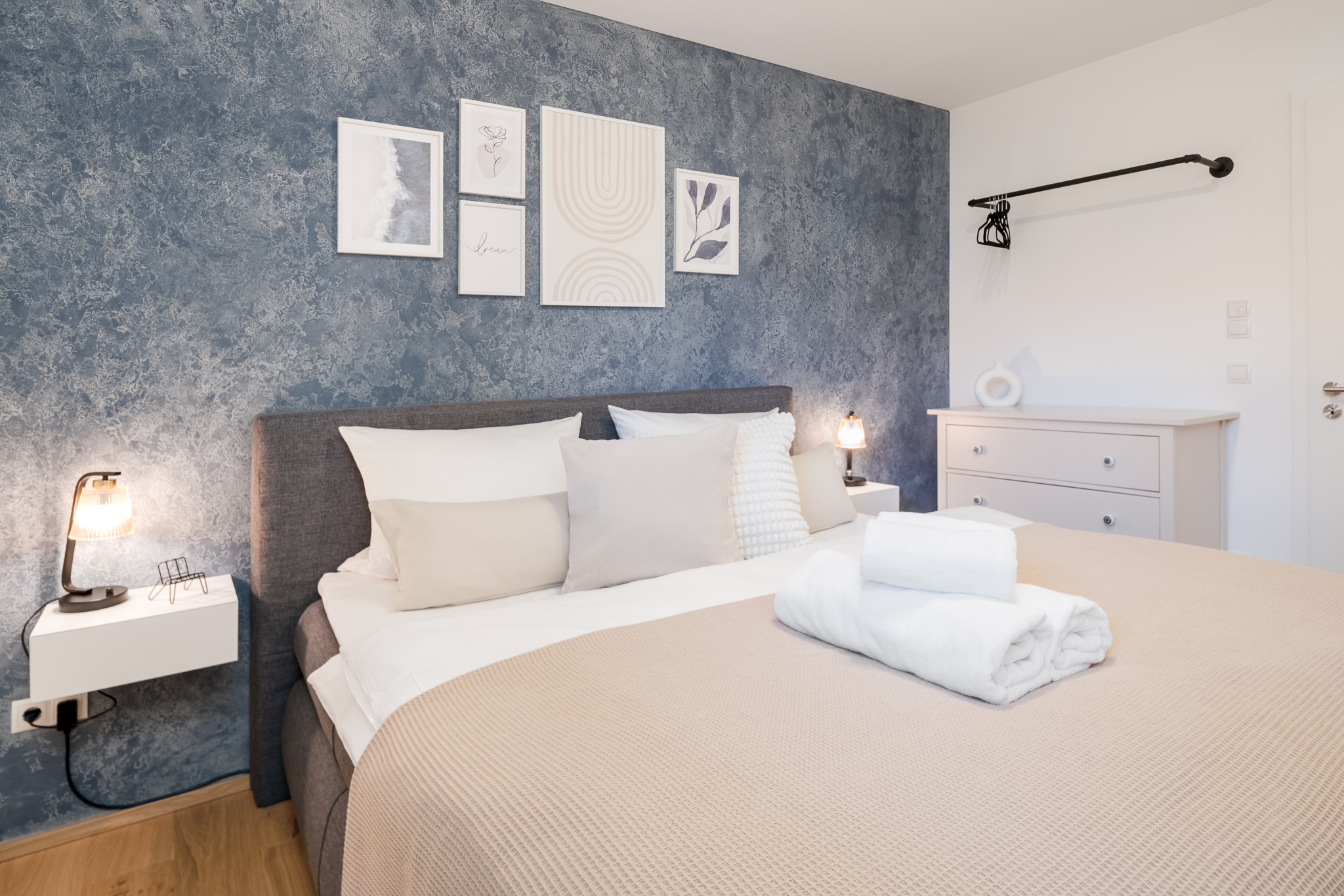 Damit Dein Schlaf erstklassig ist, warten auf Dich im Schlafzimmer ein gemütliche Boxspring Doppelbetten mit Bettwaren auf Hotelniveau. Des Weiteren wurde bei dem Schlafsofa eine hochwertige Ausführung mit extra Schlaffunktion gewählt.