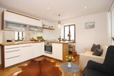 Die Küche ist mit Kühlschrank, Geschirrspüler, Induktionsherd ausgestattet – Mikrowelle und Gefriertruhe stehen im Flur.