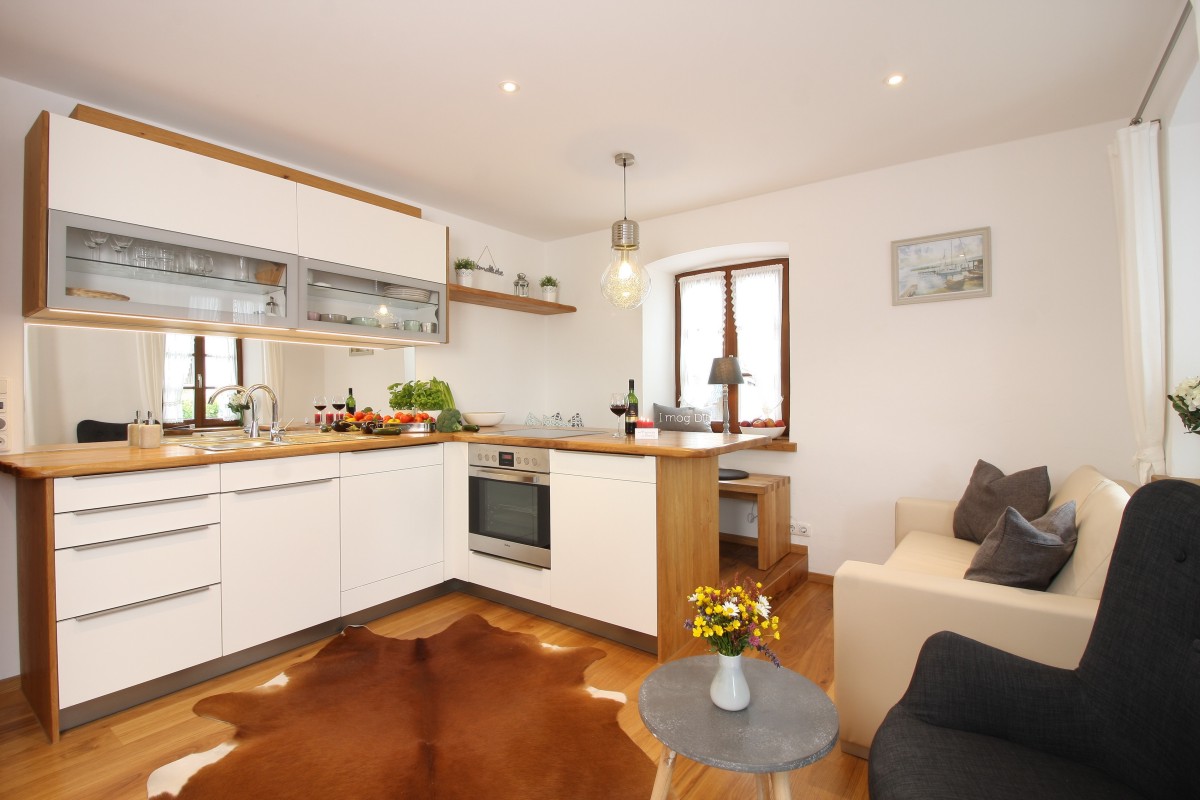 Die geräumige Ferienwohnung im 1. OG ist im gemütlichen Landhausstil modern und hochwertig eingerichtet und hat einen eigenen Zugang zum Balkon mit herrlichem Blick auf Ufer, See und Berge.
