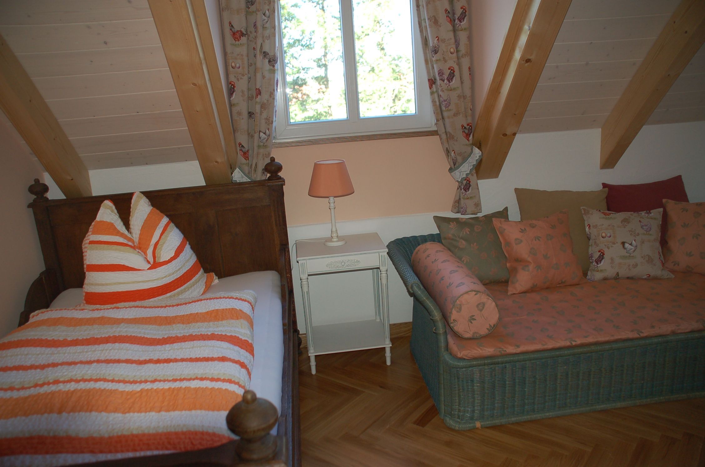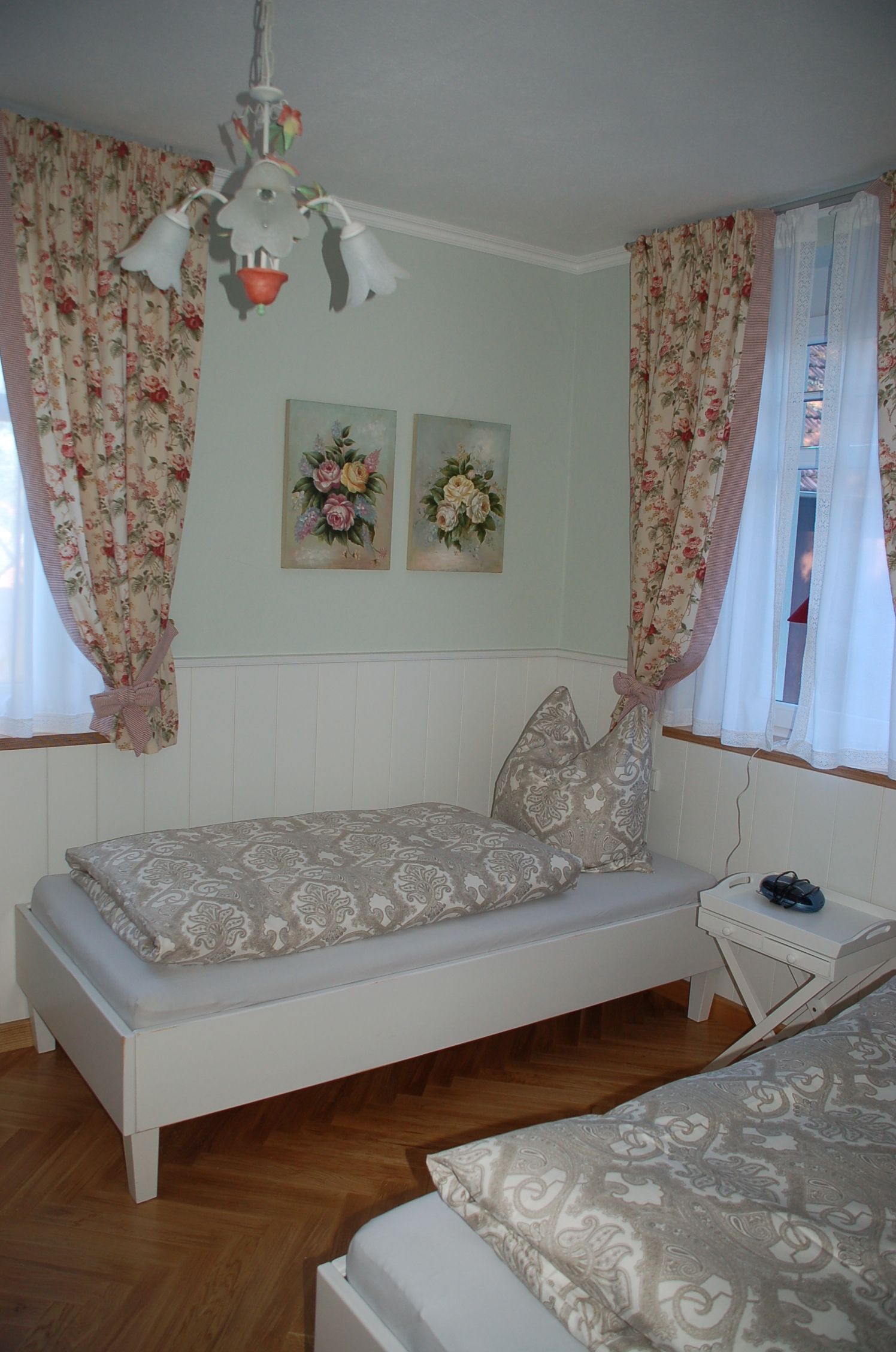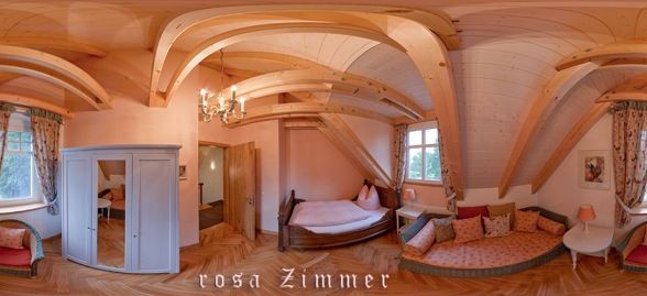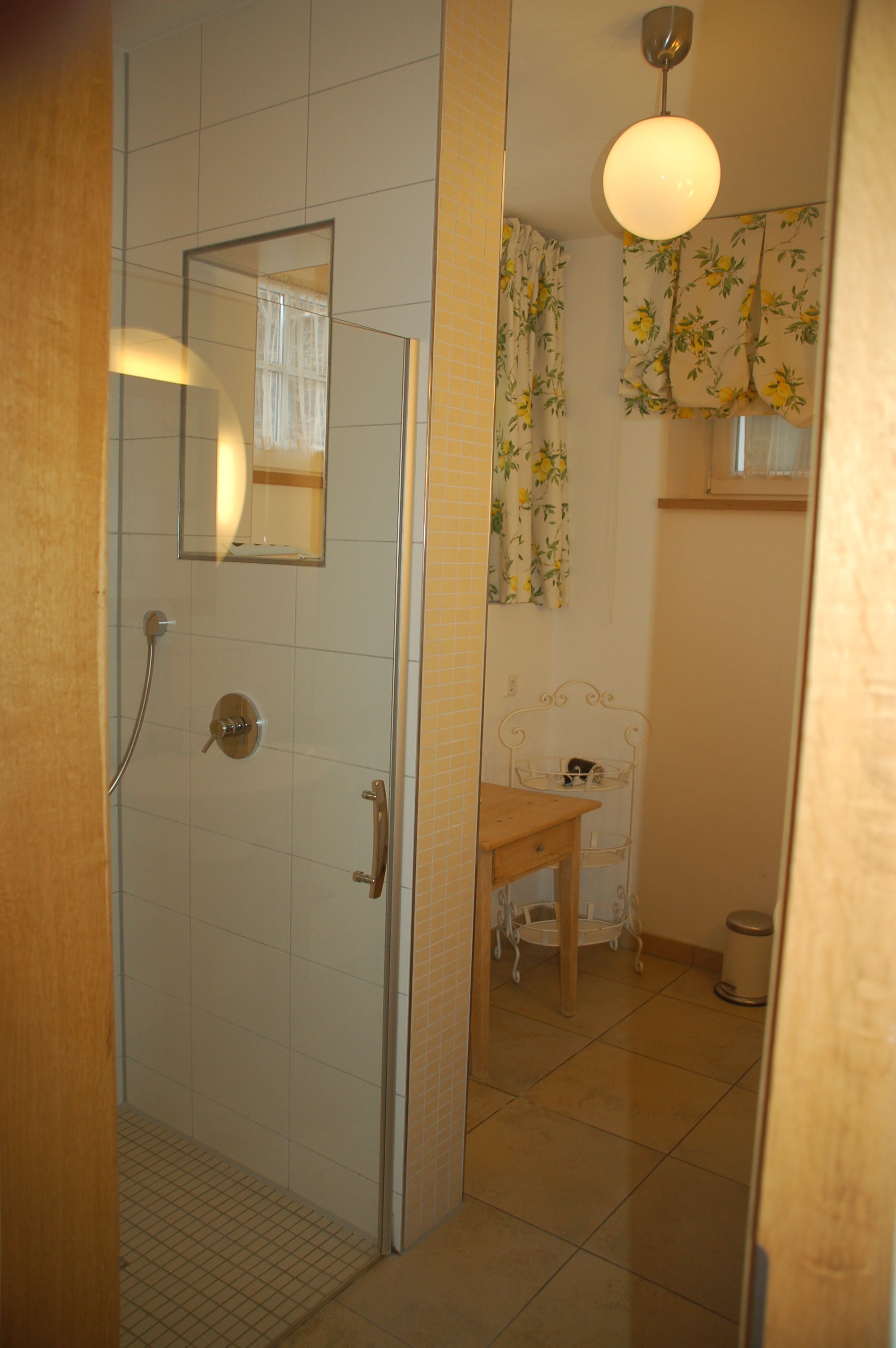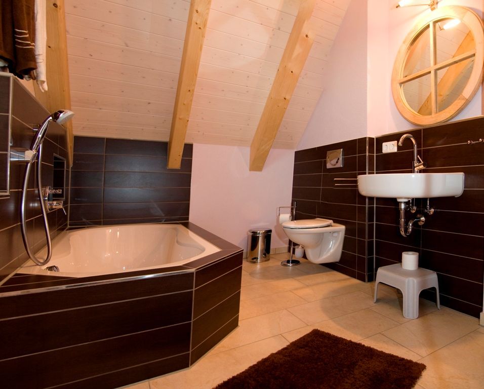 Im Erdgeschoss befindet sich neben dem Wohnbereich noch ein Schlafzimmer, desse Einelbetten zu einem Doppelbett zusammen geschoben werden können. Direkt gegenüber hat das Ergeschossbad eine ebenerdige Dusche sowie ein WC. Im Obergeschoss gibt es 3 weitere Schlafzimmer mit ganz unterschriedlichen Designs und Ausstattungen. Die Räume im OG reichen bis unter den Dachspitz. Sichtbares Dachgebälk und Fußbodenheizung in allen Räumen stehen für die hochwertige Ausstattung des mit 5 Sternen ausgezeichneten Mühlen-Chalets. Das Bad im OG bietet neben einer ebenerdigen Dusche auch eine Badewanne.