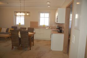 Der große Wohn-/Essbereich ist mit einer komplett ausgestatteten Küchenzeile, einem großen Esstisch und einer gemütlichen Couch bestückt. Das großzügige Badezimmer bietet eine mit dem Rollstuhl befahrbare Dusche sowie einen unterfahrbaren Waschtisch und ein WC. Direkt neben dem Badezimmer befindet sich eine weitere separate Toilette. Im Elternschlafzimmer erwartet unsere Gäste ein 180 cm breites Boxspringbett. Das Kinderschlafzimmer ist mit einem Etagenbett (2 x 200 x 90 cm) sowie einem weiteren Einzelbett (200 x 90 cm) ausgestattet.