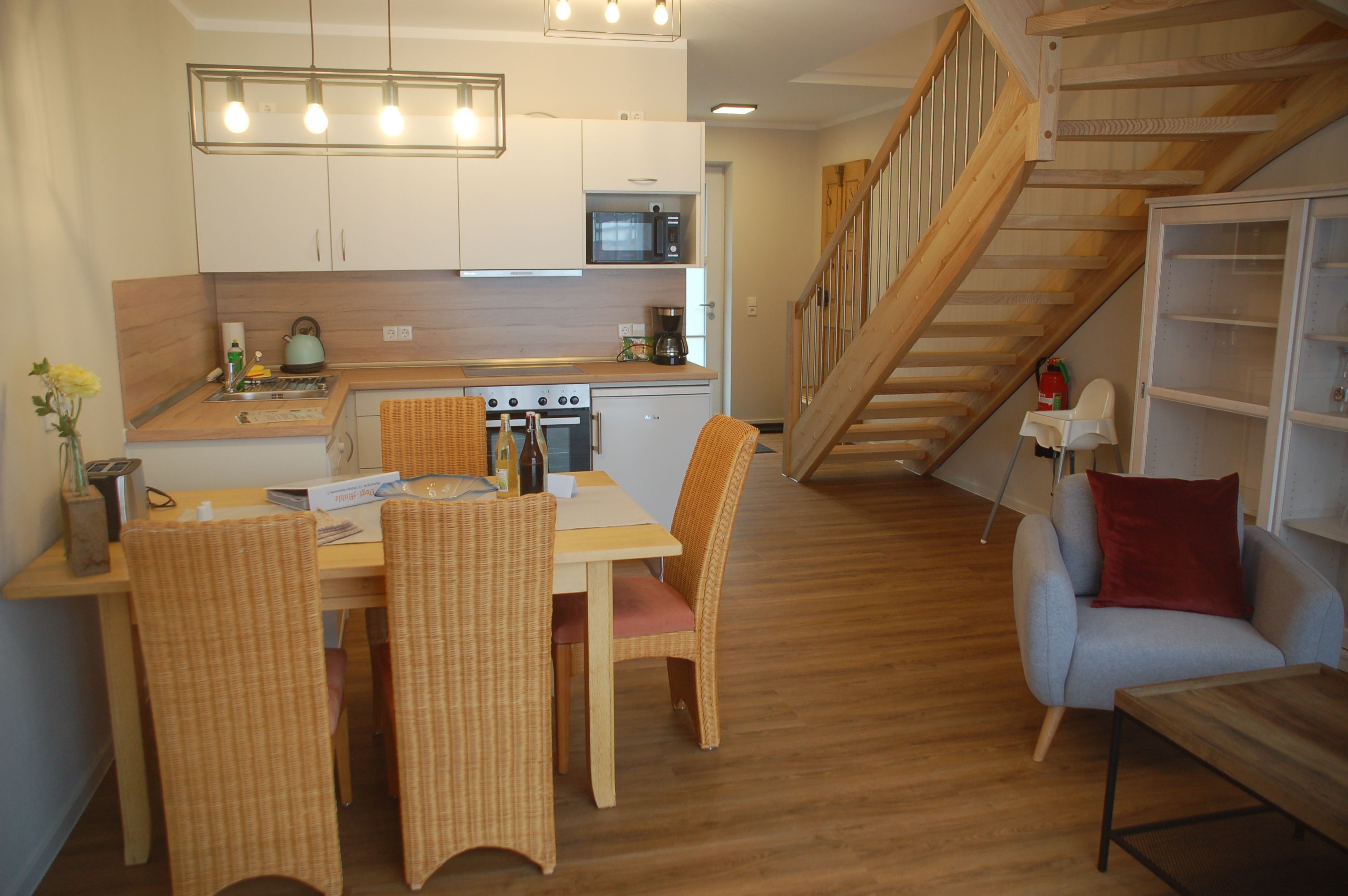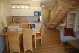 Die Maisonette Wohnungen erstrecken sich über zwei Ebenen. Im unteren Bereich befindet sich ein großzügiges Badezimmer mit schwellenloser Dusche und WC. Der große Wohn-/Essbereich ist mit einer komplett ausgestatteten Küchenzeile, einem großen Esstisch und einer gemütlichen Couch bestückt. Ein terrassenähnlicher Balkon in Süd-/West-Ausrichtung rundet die hervorragende Ausstattung ab und lädt sowohl zum Sonne genießen als auch zum Essen im Freien ein. Über eine bequem begehbare Holztreppe aus heimischem Ahorn erreichen unsere Gäste die im oberen Bereich gelegenen zwei Schlafzimmer sowie das separate WC.