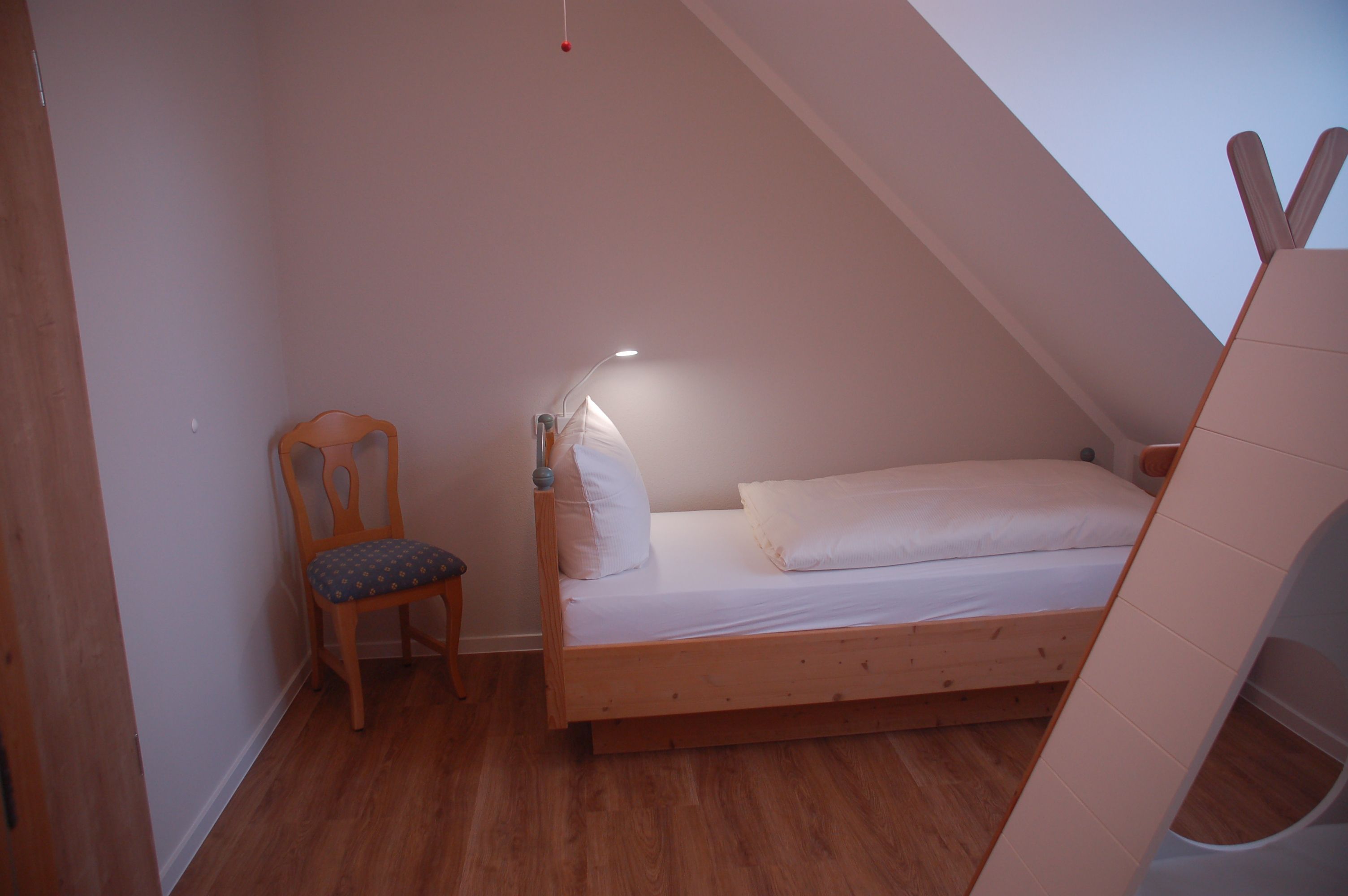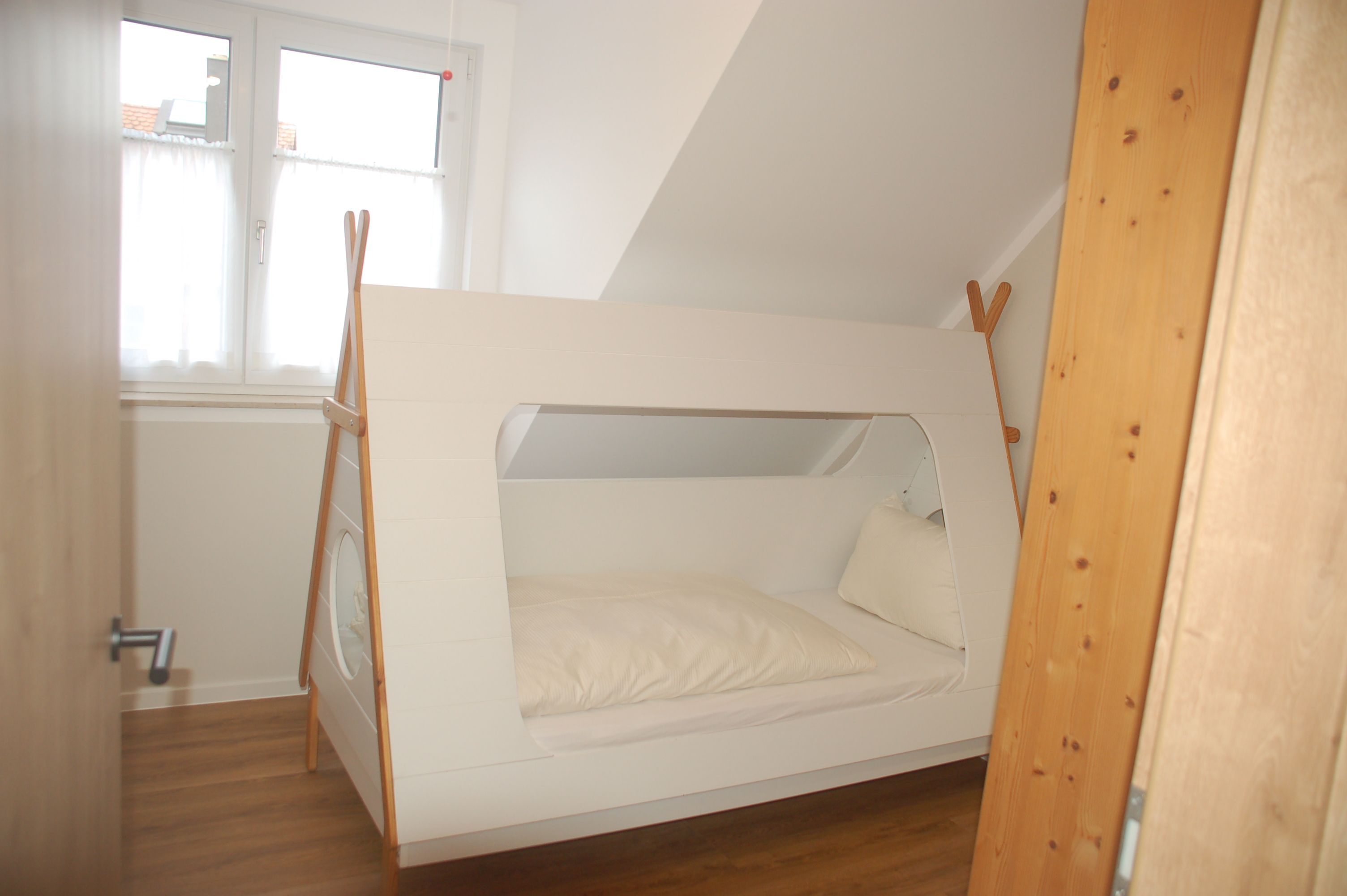 Im Kinderschlafzimmer freuen sich unsere kleinen Gäste auf ein Tipibett (200 x 90 cm). Ein zweites Bett mit ebenfalls 200 x 90 cm komplettiert die Kinderzimmerausstattung.
