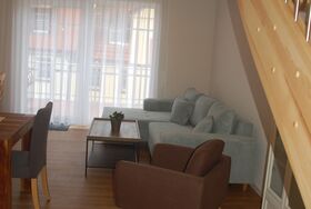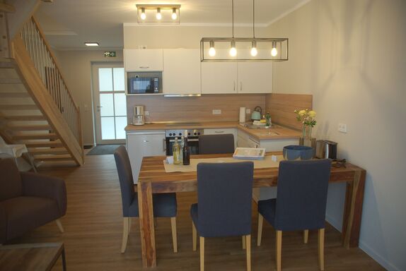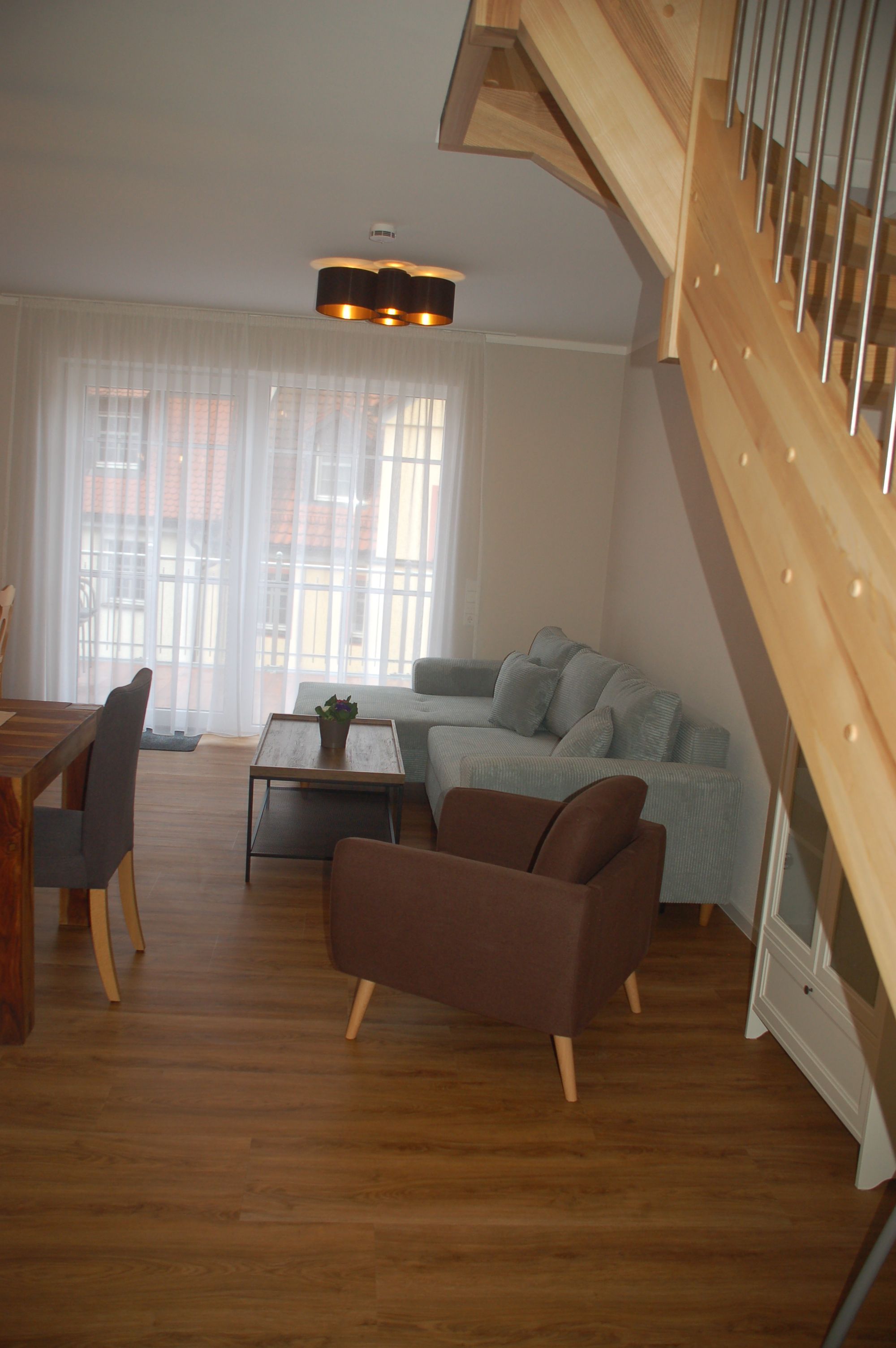 Die Maisonette Wohnungen erstrecken sich über zwei Ebenen. Im unteren Bereich befindet sich ein großzügiges Badezimmer mit schwellenloser Dusche und WC. Der große Wohn-/Essbereich ist mit einer komplett ausgestatteten Küchenzeile, einem großen Esstisch und einer gemütlichen Couch bestückt. Ein terrassenähnlicher Balkon in Süd-/West-Ausrichtung rundet die hervorragende Ausstattung ab und lädt sowohl zum Sonne genießen als auch zum Essen im Freien ein. Über eine bequem begehbare Holztreppe aus heimischem Ahorn erreichen unsere Gäste die im oberen Bereich gelegenen zwei Schlafzimmer sowie das separate WC.