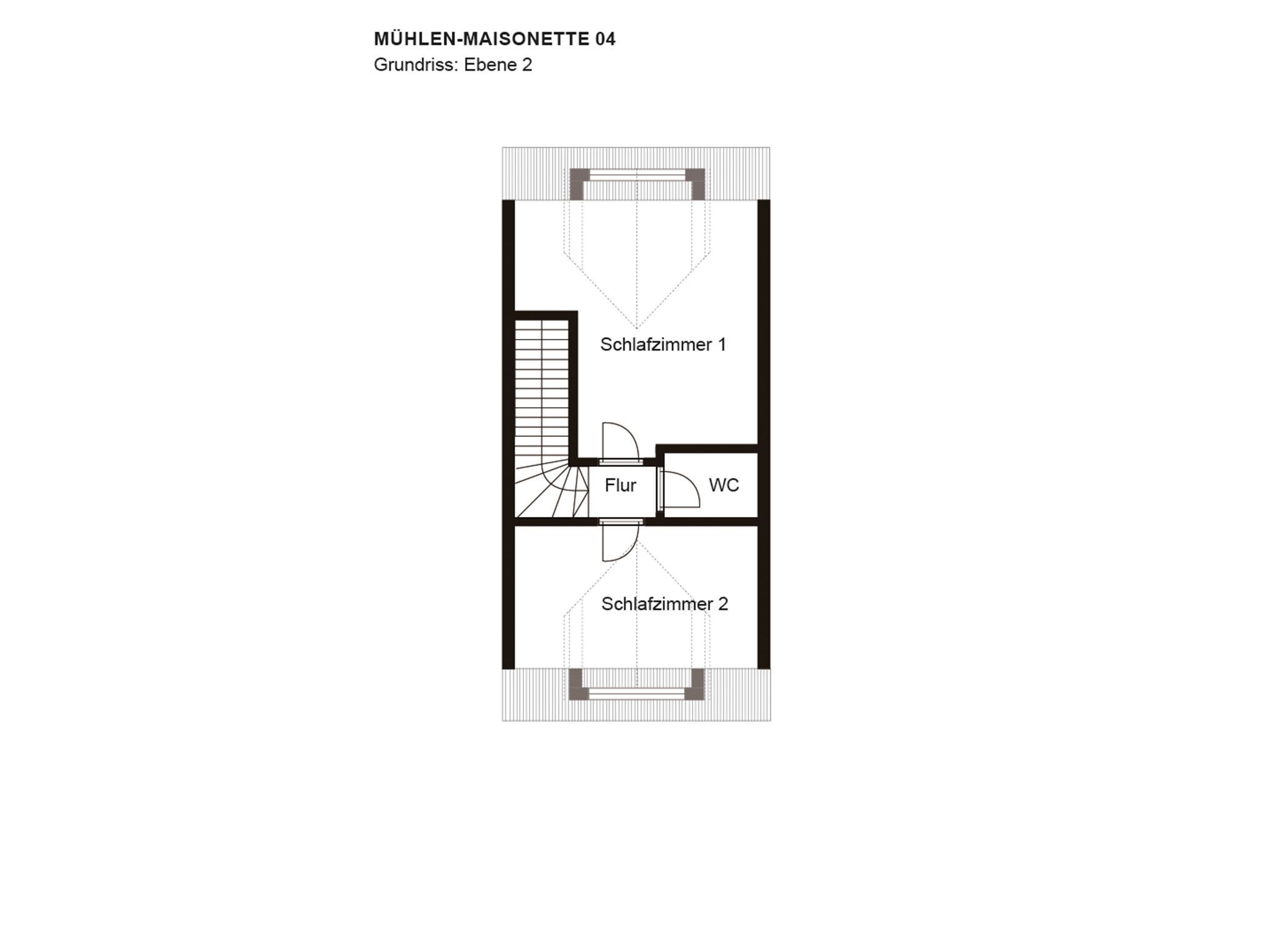Die Mühlen-Maisonette Wohnungen sind über einen überdachten Laubengang erschlossen. Jede Wohnung verfügt über einen eigenen Zugang direkt zum Laubengang und einen direkt am Laubengang positionierten Parkplatz.