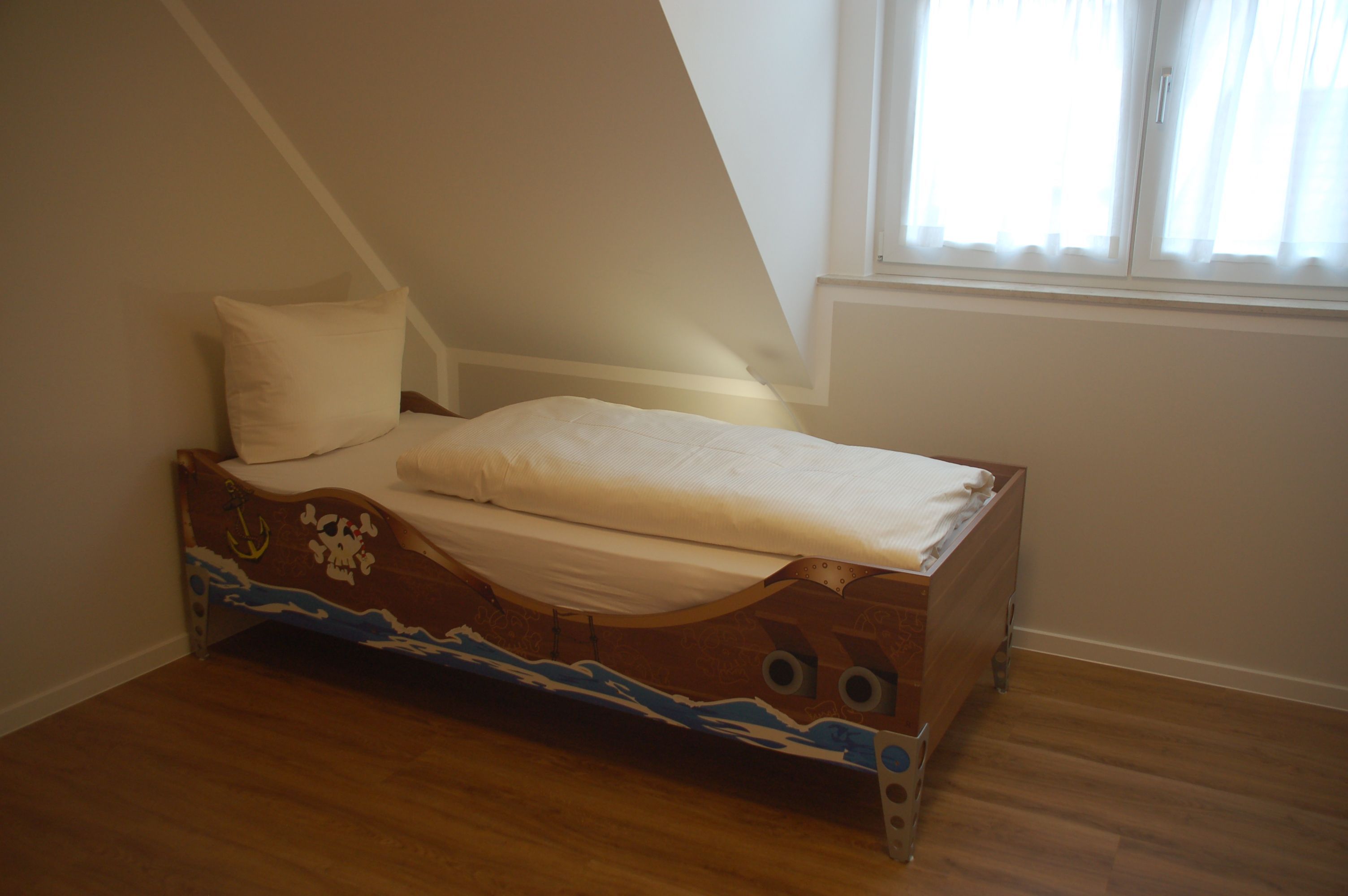 Im Kinderschlafzimmer freuen sich unsere kleinen Gäste auf ein Piratenbett (200 x 90 cm). Ein zweites Bett mit ebenfalls 200 x 90 cm komplettiert die Kinderzimmerausstattung.