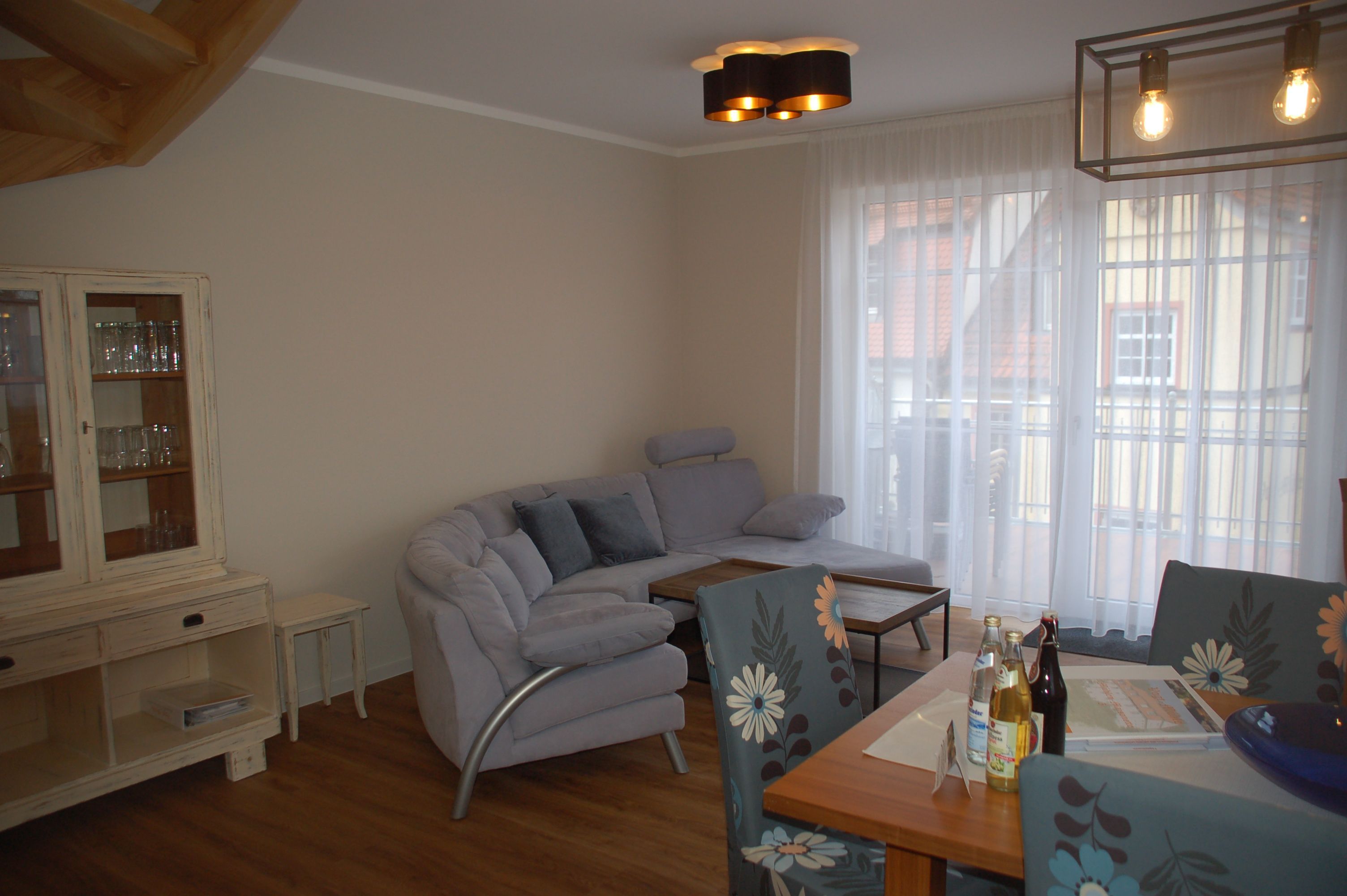 Die Maisonette Wohnungen erstrecken sich über zwei Ebenen. Im unteren Bereich befindet sich ein großzügiges Badezimmer mit schwellenloser Dusche und WC. Der große Wohn-/Essbereich ist mit einer komplett ausgestatteten Küchenzeile, einem großen Esstisch und einer gemütlichen Couch bestückt. Ein terrassenähnlicher Balkon in Süd-/West-Ausrichtung rundet die hervorragende Ausstattung ab und lädt sowohl zum Sonne genießen als auch zum Essen im Freien ein. Über eine bequem begehbare Holztreppe aus heimischem Ahorn erreichen unsere Gäste die im oberen Bereich gelegenen zwei Schlafzimmer sowie das separate WC.