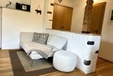 Apartment Zugspitze (2-4 Personen) 56 qm mit zwei Schlafzimmern, einer Wohnküche mit großem Esstisch und Schlafsofa. Das Bad hat eine ebenerdige Dusche, ein Bidet, ein WC, ein Waschbecken und einen Waschtrockner. Terrasse mit herrlichem Bergblick.