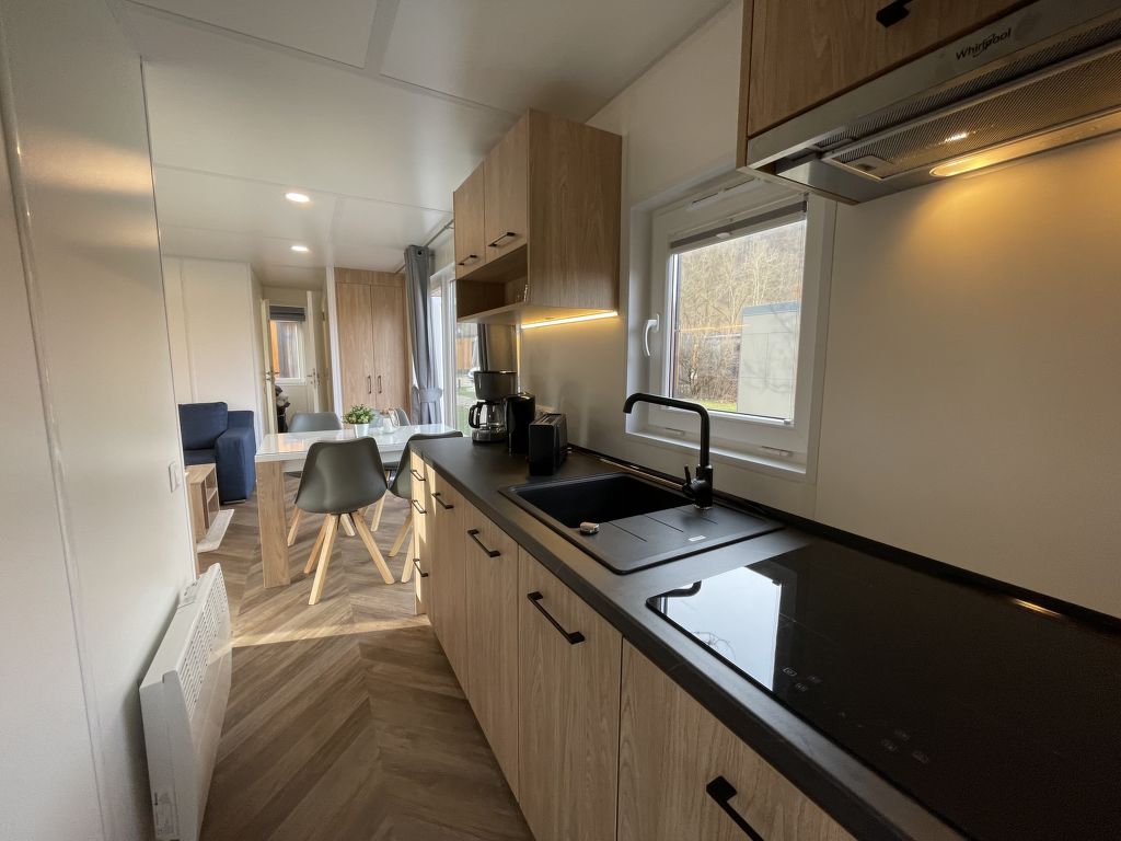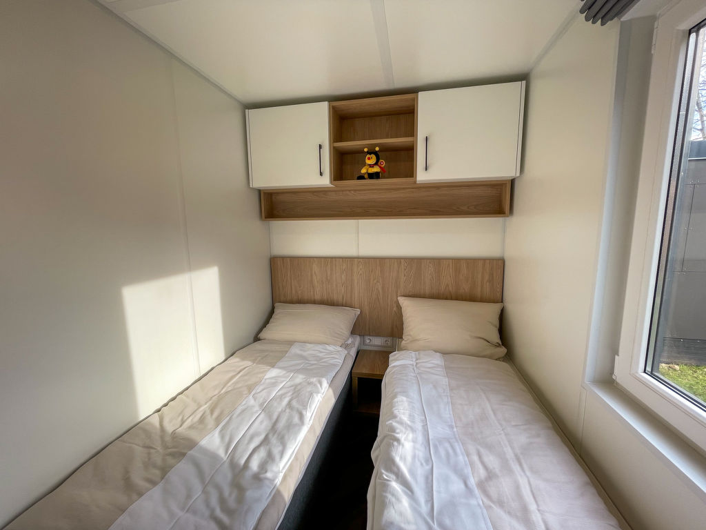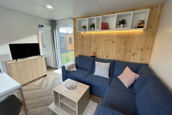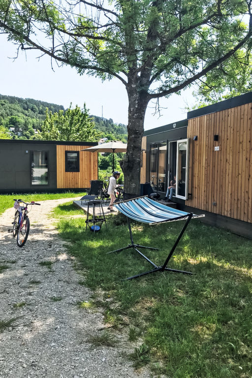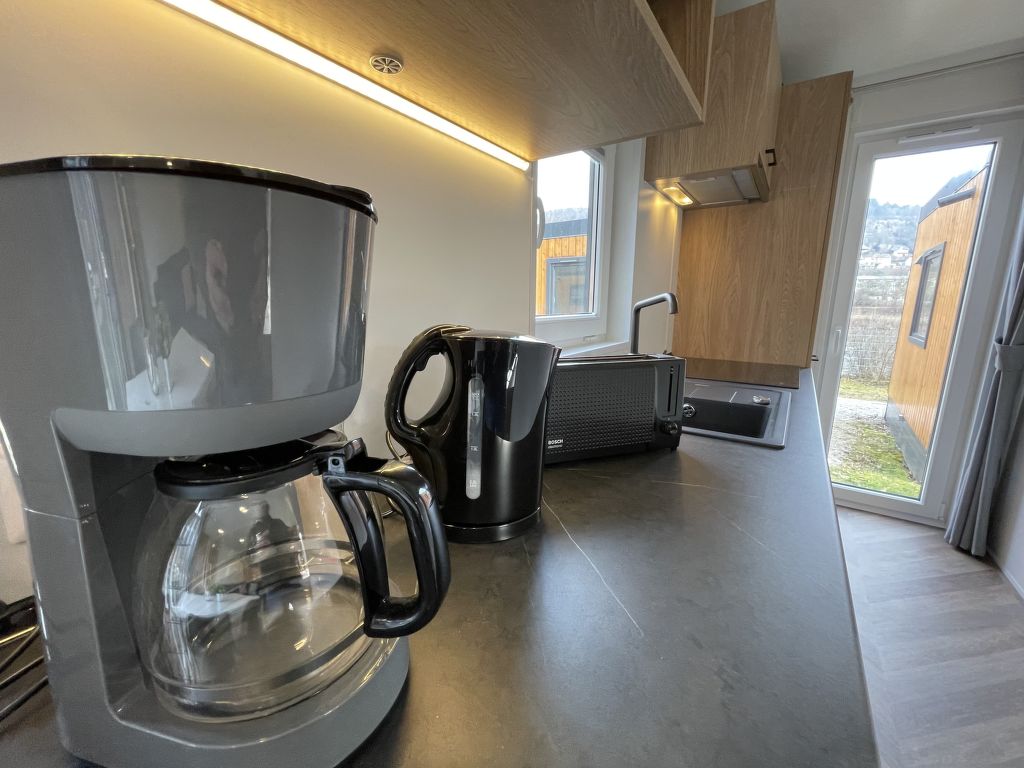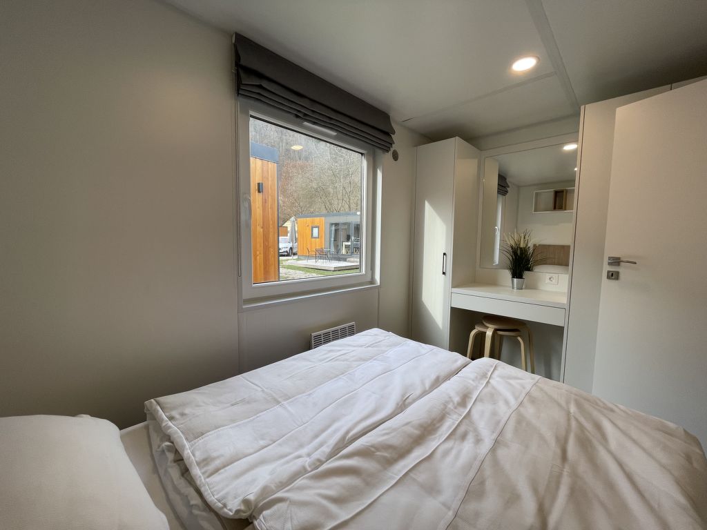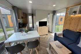 Tiny Haus Anellie, 3-Zimmer-Mobilheim 32 m2. Gemütlich eingerichtet: Wohn-/Schlafzimmer mit (120 cm, Länge 170 cm), Sat-TV. Ausgang zur Terrasse. 1 Zimmer mit 1 franz. Bett (140 cm, Länge 200 cm). 1 Zimmer mit 2 Betten (80 cm, Länge 200 cm). Offene Küche (4 Glaskeramikplatten, Wasserkocher, elektrische Kaffeemaschine). Dusche/WC. E-Heizung. Kleine Terrasse. Terrassenmöbel. Parkplatz beim Haus. Bitte beachten: Nichtraucher-Haus.