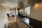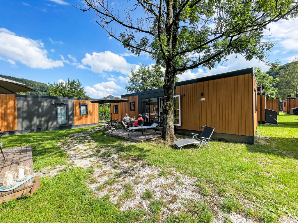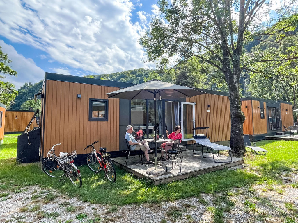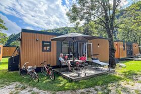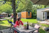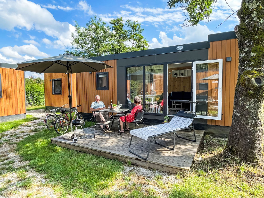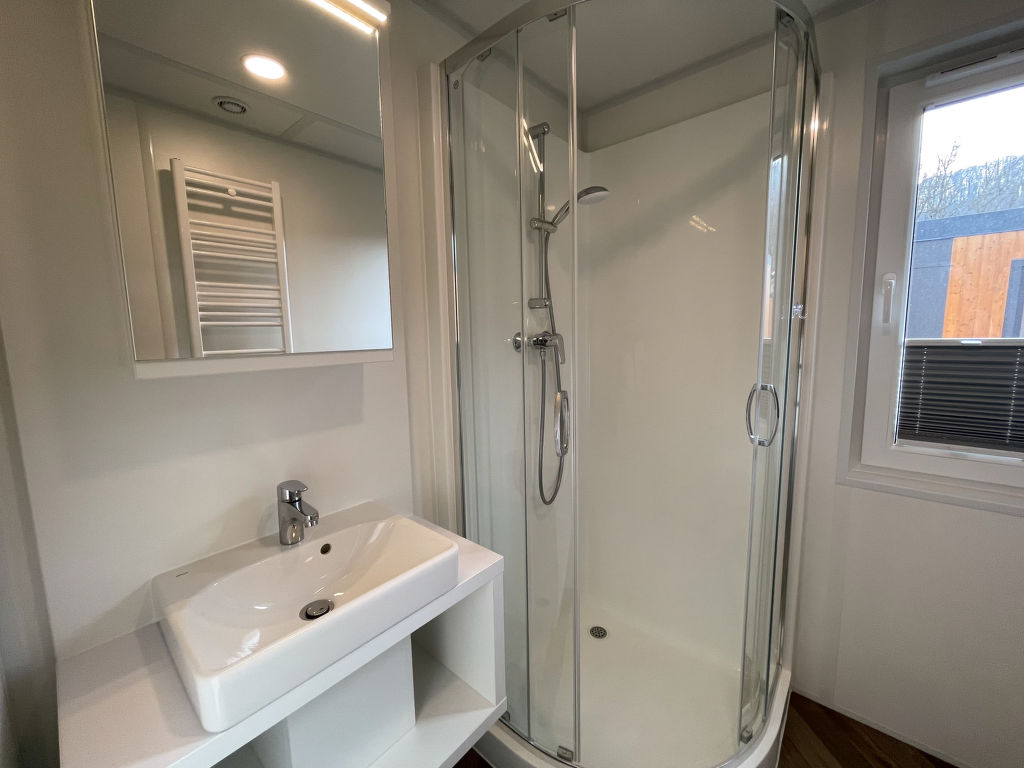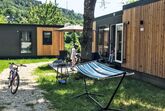 Tiny Haus Anellie, 3-Zimmer-Mobilheim 32 m2. Gemütlich eingerichtet: Wohn-/Schlafzimmer mit (120 cm, Länge 170 cm), Sat-TV. Ausgang zur Terrasse. 1 Zimmer mit 1 franz. Bett (140 cm, Länge 200 cm). 1 Zimmer mit 2 Betten (80 cm, Länge 200 cm). Offene Küche (4 Glaskeramikplatten, Wasserkocher, elektrische Kaffeemaschine). Dusche/WC. E-Heizung. Kleine Terrasse. Terrassenmöbel. Parkplatz beim Haus. Bitte beachten: Nichtraucher-Haus.