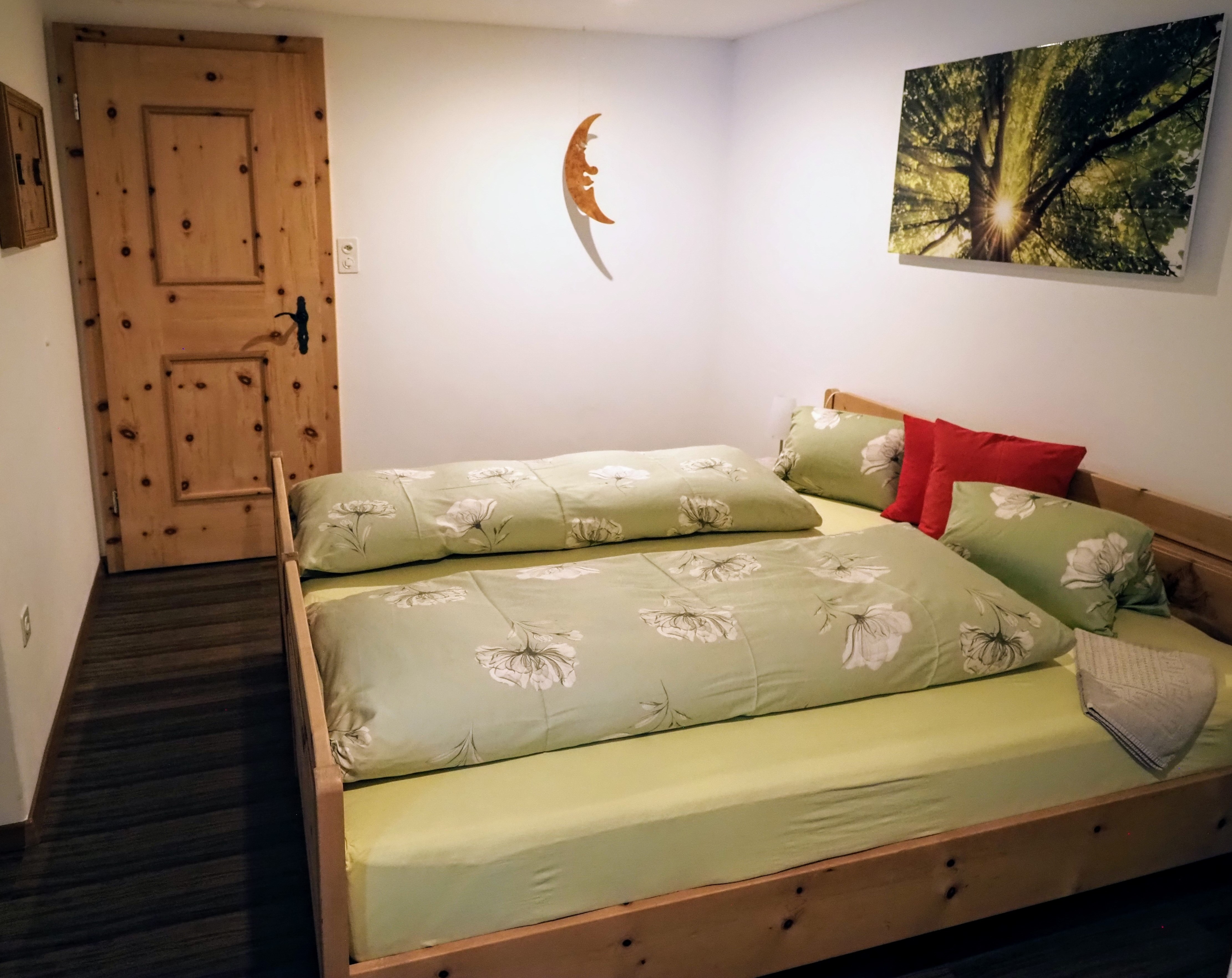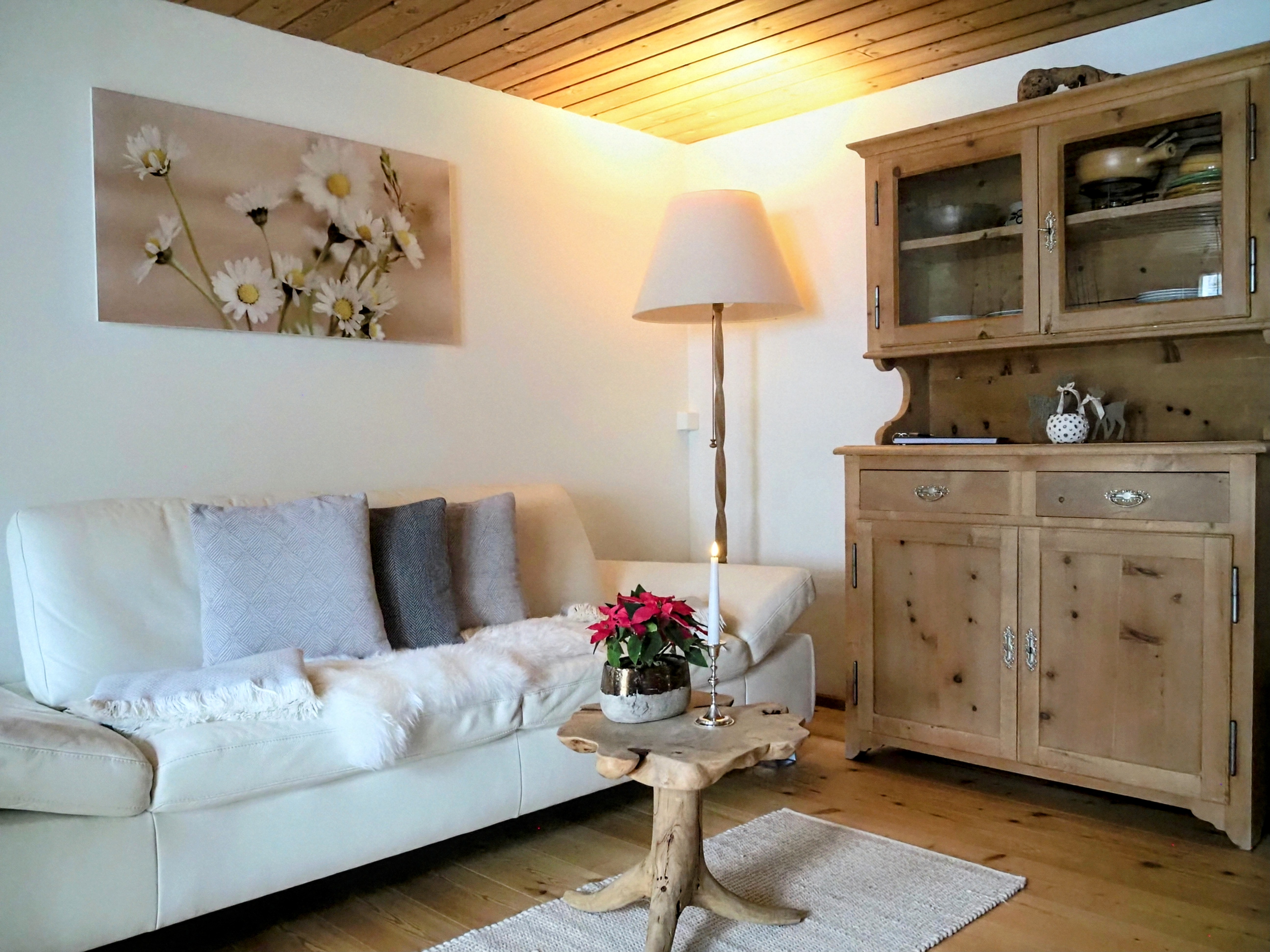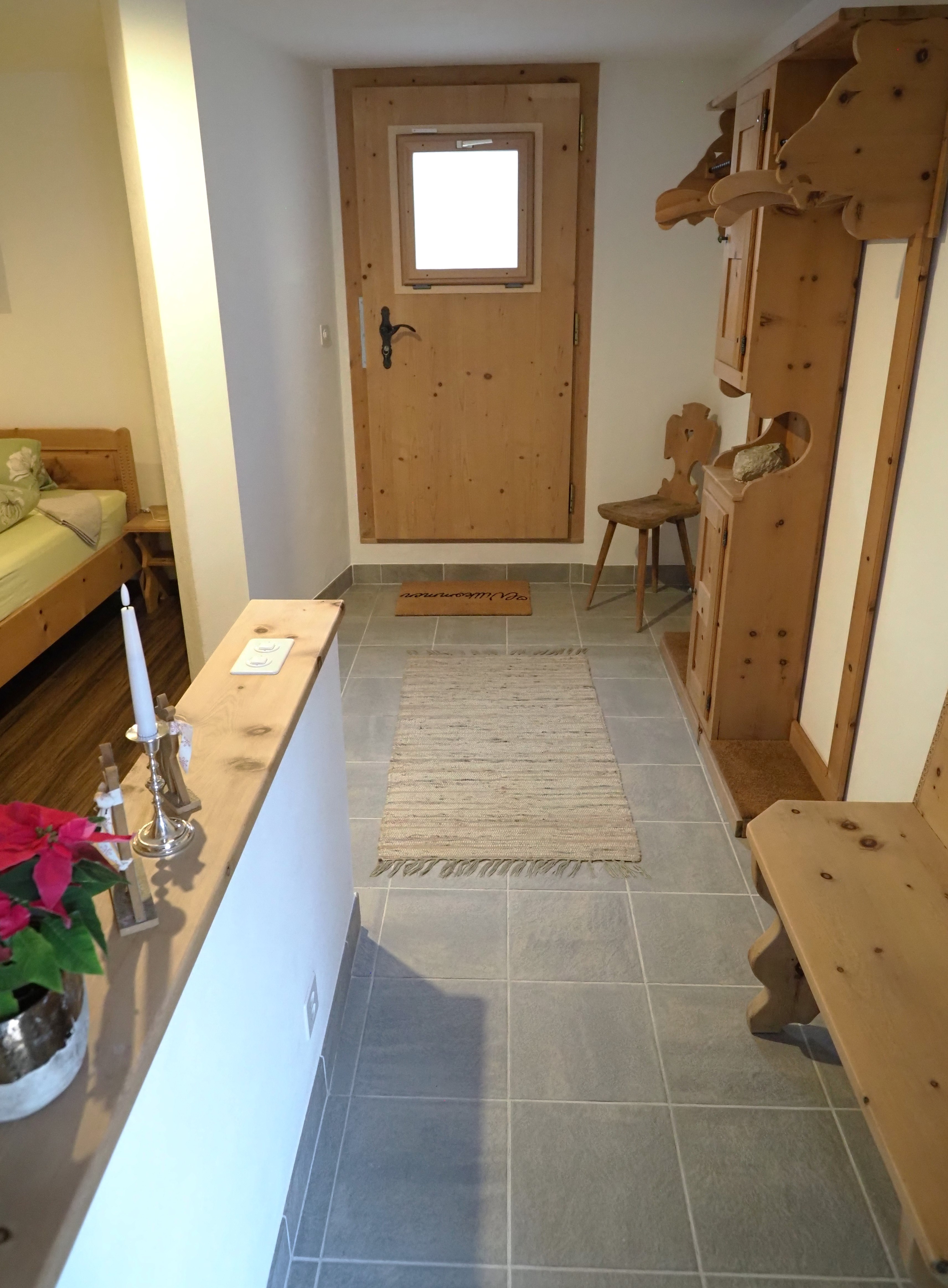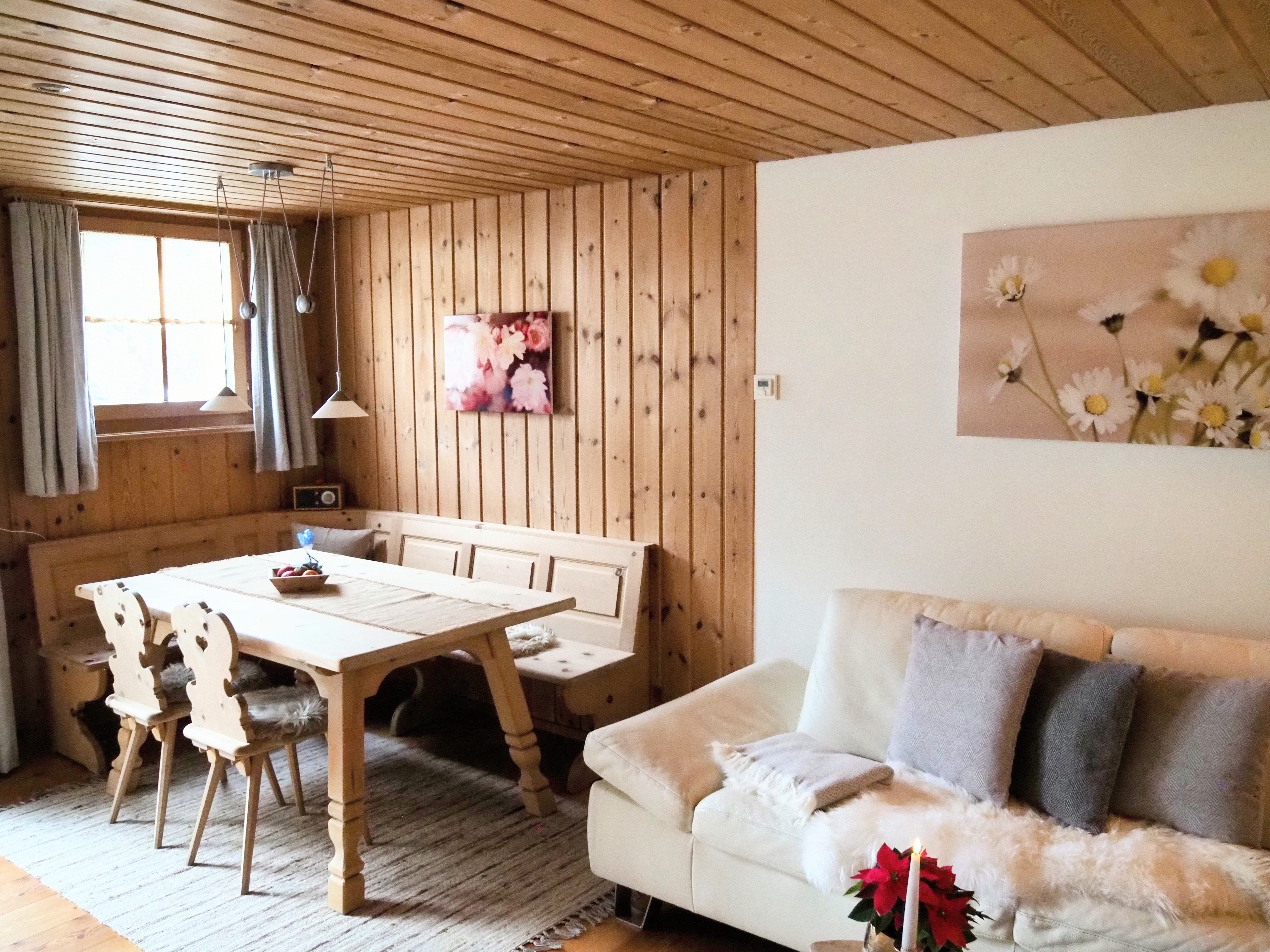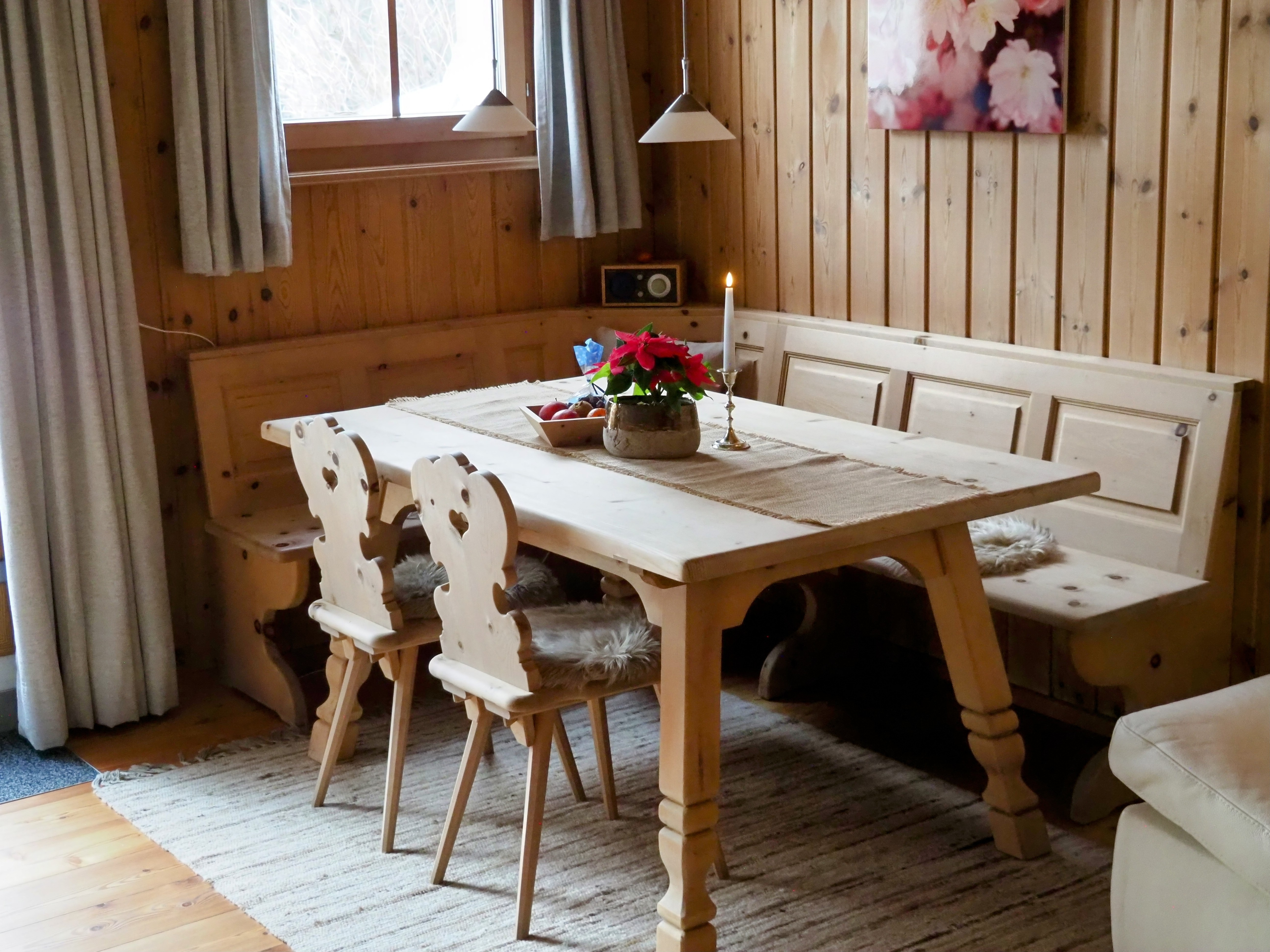 Die Wohnung für Nichtraucher ist in einer eleganten und regionaler Einrichtung mit einheimischen Arvenholzmöbeln ausgestattet. Privater Gartensitzplatz, ruhige Lage, hell und sonnige Wohnung. Grosszügige Wohnküche, Wohnbereich 26 m2 mit Polstergruppe. Schlafzimmer auf einer Fläche von 22 m2. Separater Eingang.