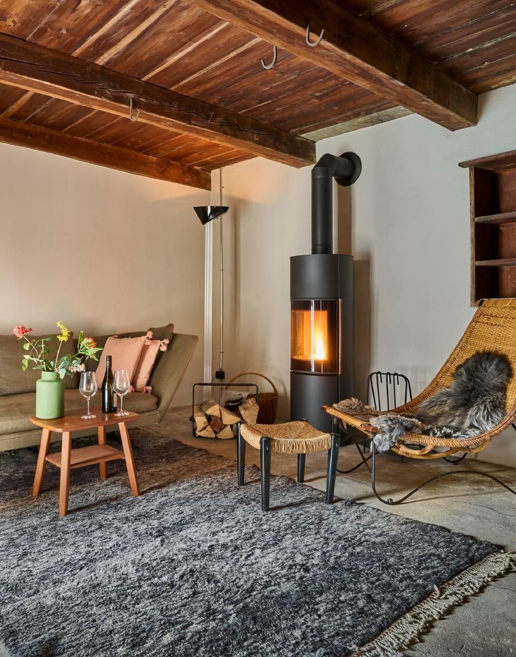 Heizung: Zwei moderne Kaminöfen - die Gäste heizen selbst mit Holz.