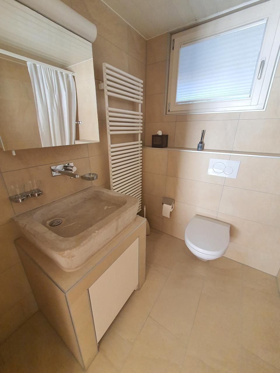 - Badezimmer mit Natursteinbecken, Dusche / Badewanne