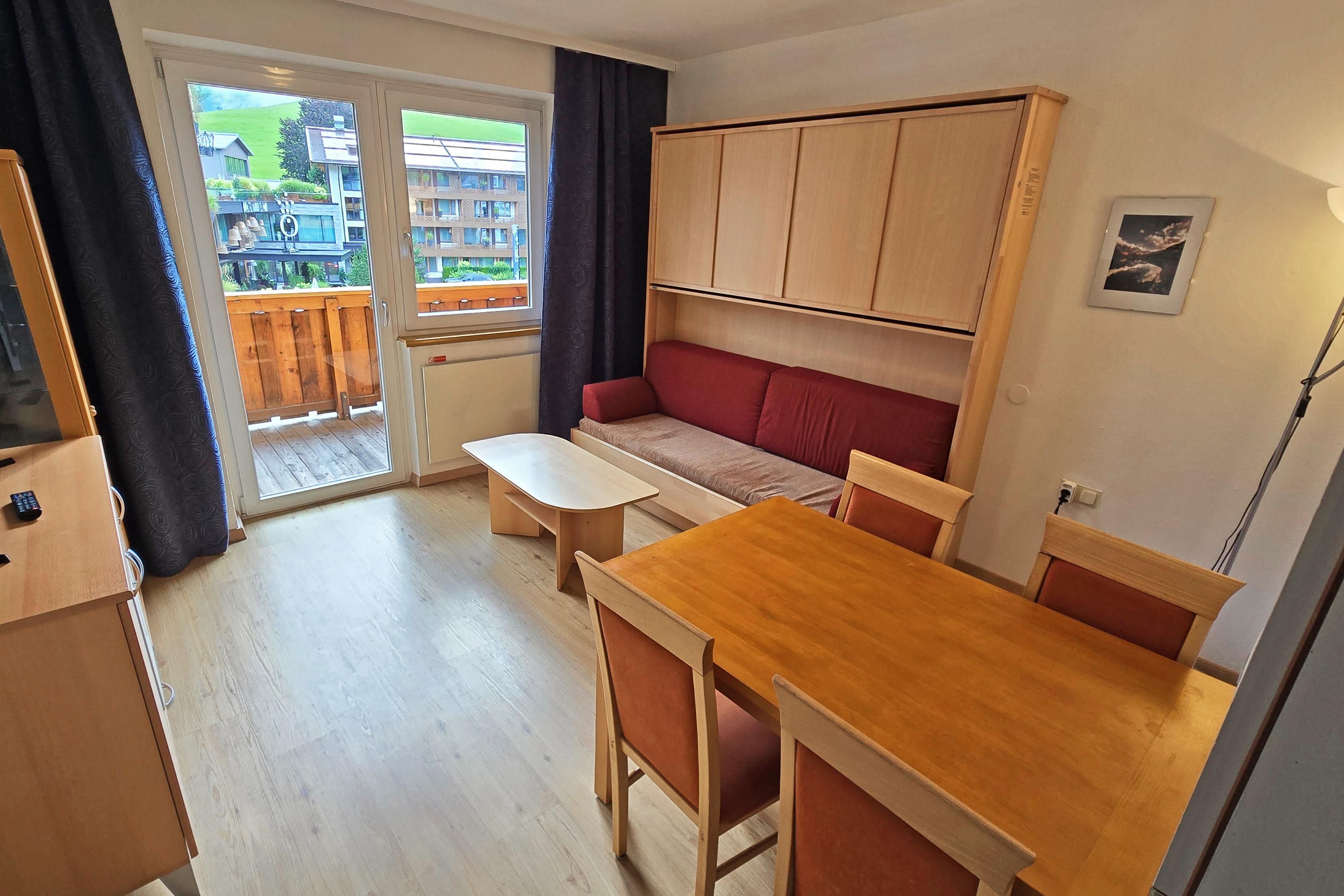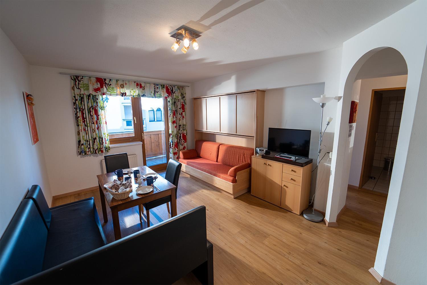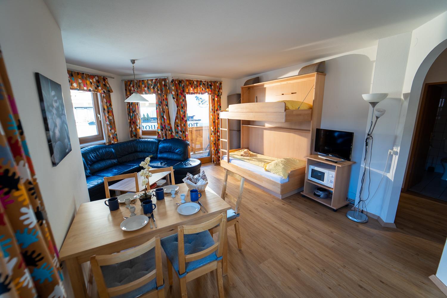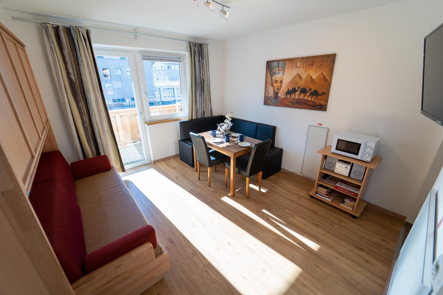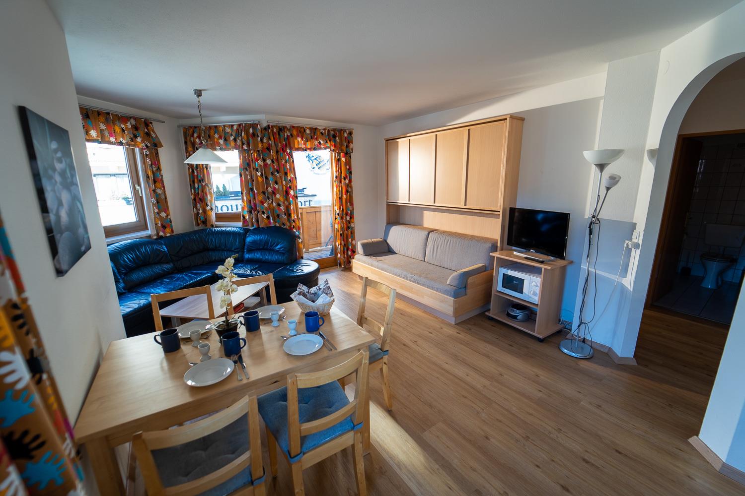 . alle Komfort Apartments verfügen über einen Balkon entweder zur sonnigen süd-west Seite oder zur ruhigen Dorfseite mit Bergpanorama'