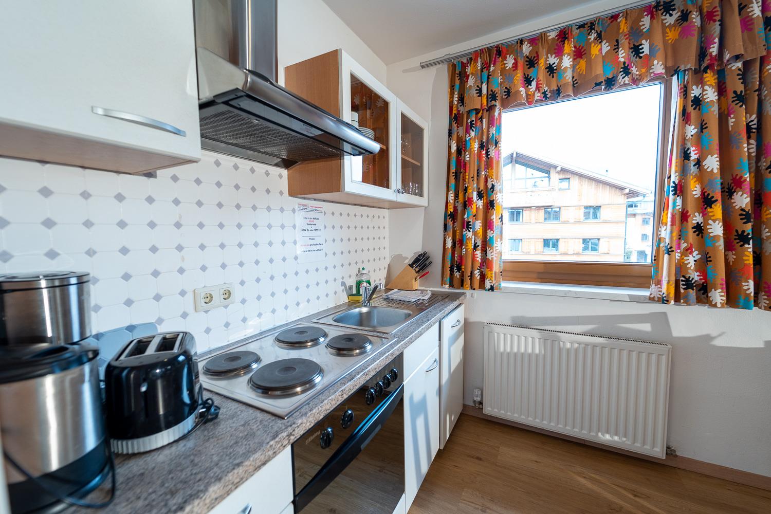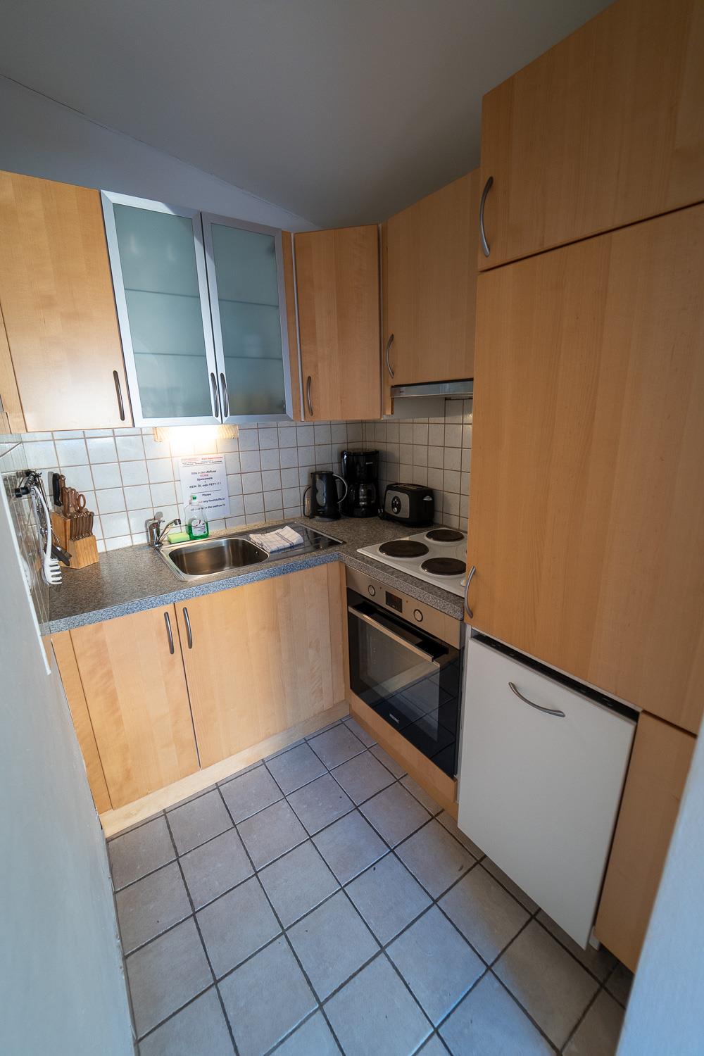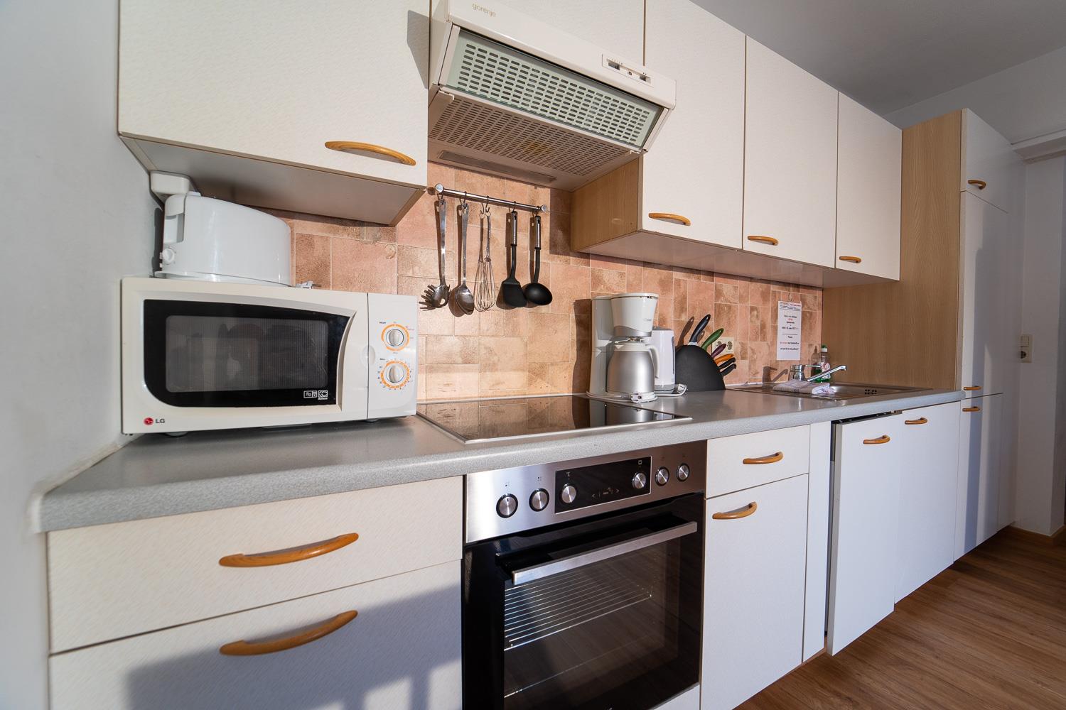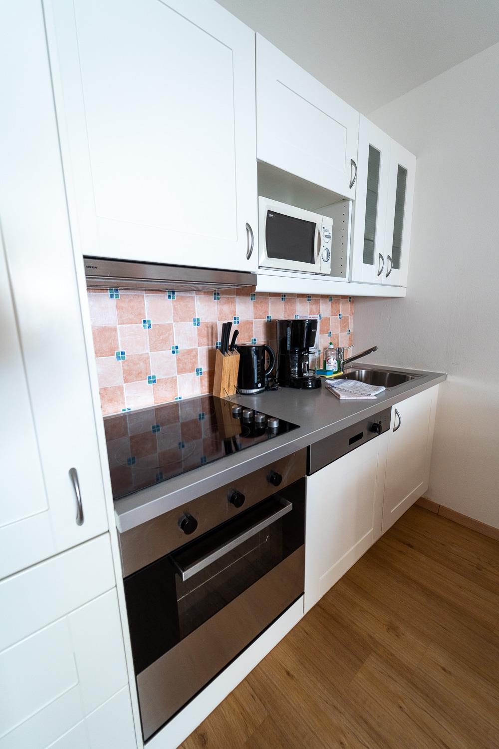 . voll ausgestattete Küche mit Geschirrspüler, 4 Ceranfeldern, Backrohr, Kühlschrank (teilw. mit Gefrierfach) sowie Mikrowelle, Kaffeemaschine, Wasserkocher und Toaster