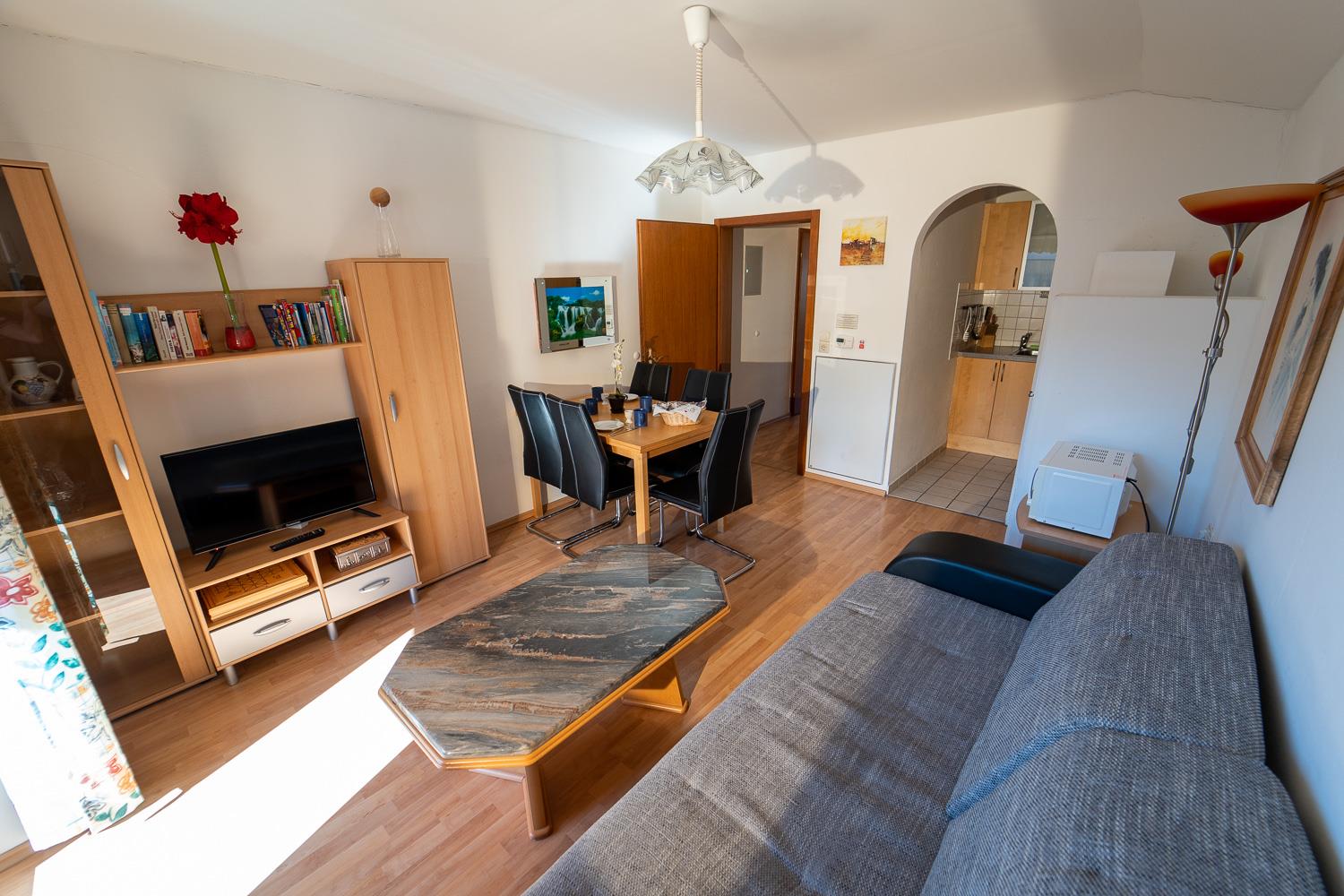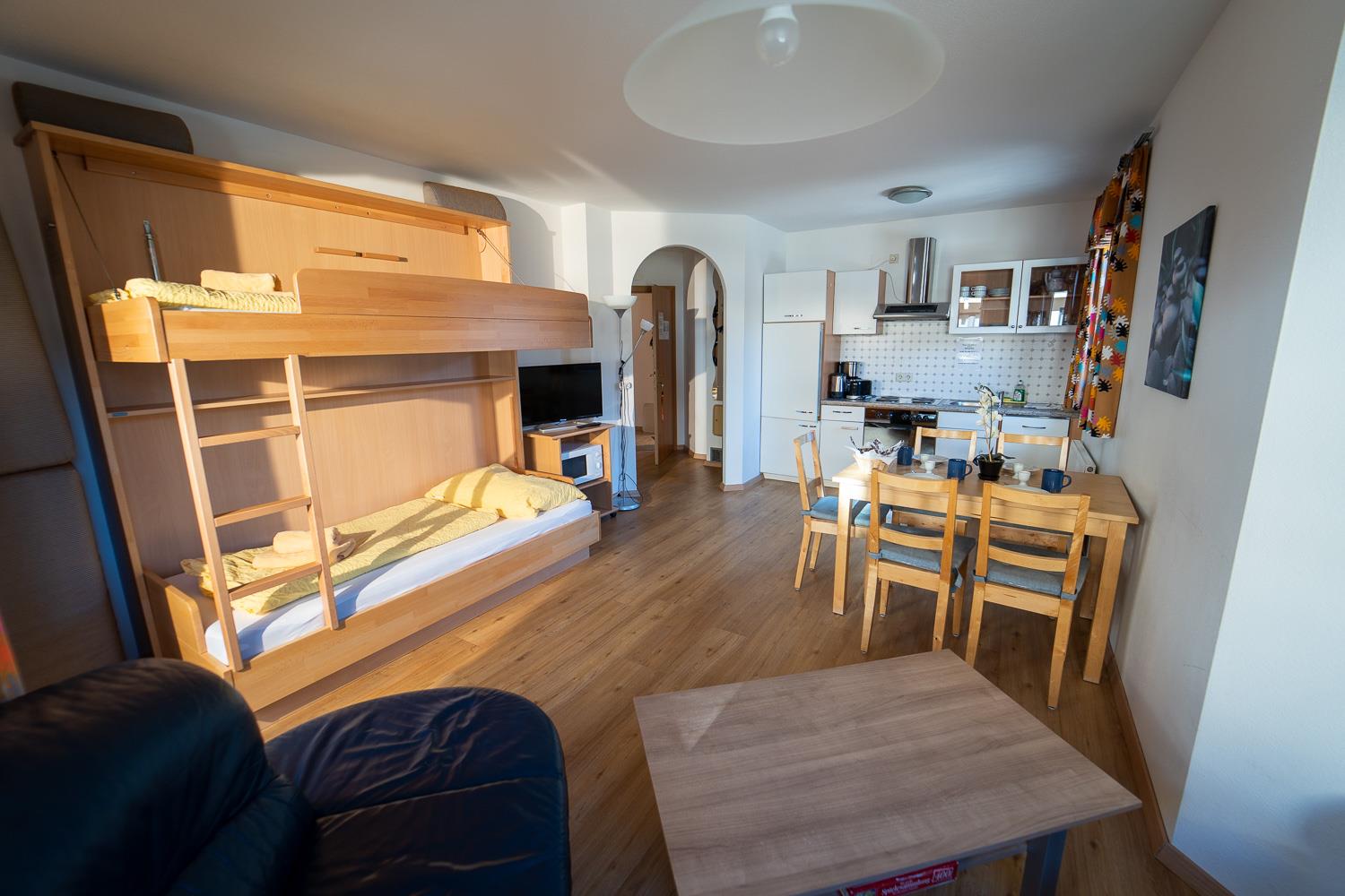 . Wohnküche mit Flexinno-Bett-System (eine Kombination aus Sitz-Couch am Tag und ausklappbar zu 1 oder 2 Betten zum schlafen) und gemütlicher Eckbank, LCD-Kabel-TV