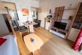 . Wohnküche mit Flexinno-Bett-System (eine Kombination aus Sitz-Couch am Tag und ausklappbar zu 1 oder 2 Betten zum schlafen) und LCD-Kabel-TV