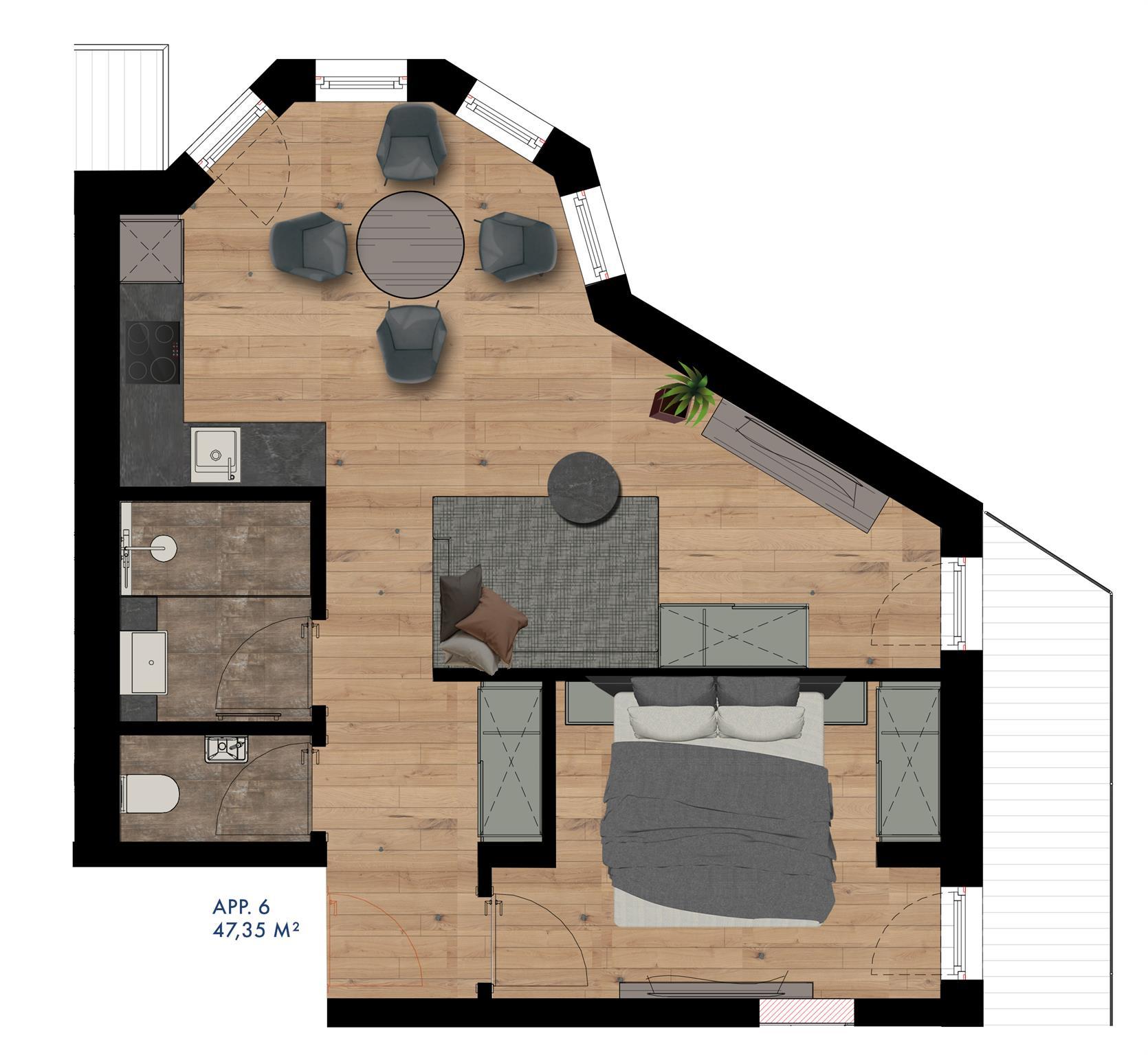 Unser Apart N°6 mit ca. 49m² bietet die perfekte Möglichkeit für 2-4 Personen für Ihren erholsamen Urlaub. Wir empfehlen das Appartement für 2 Erwachsene und bis zu 2 Kinder oder für max. 4 Erwachsene, die sich sehr mögen. Die Wohnung teilt sich in ein separates Schlafzimmer mit hochwertigem Doppelbett und Flat TV, einem Badezimmer mit Waschbecken, begehbarer Dusche, Föhn und ein separates WC. Getrennte tolle voll ausgestattete Wohnküche mit Flat TV & gemütlicher Sitzecke, die zum gemütlichen Zusammensitzen einlädt.