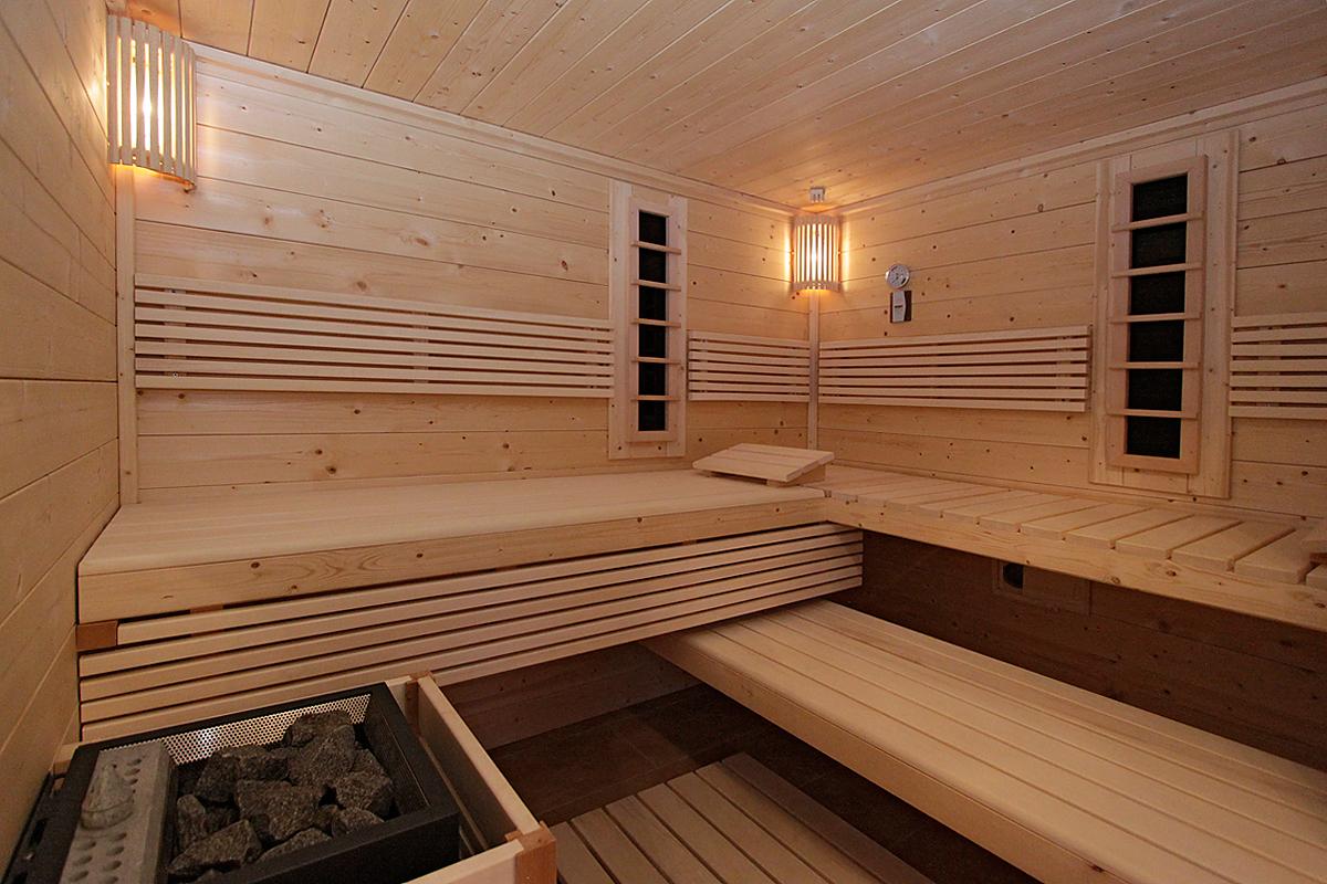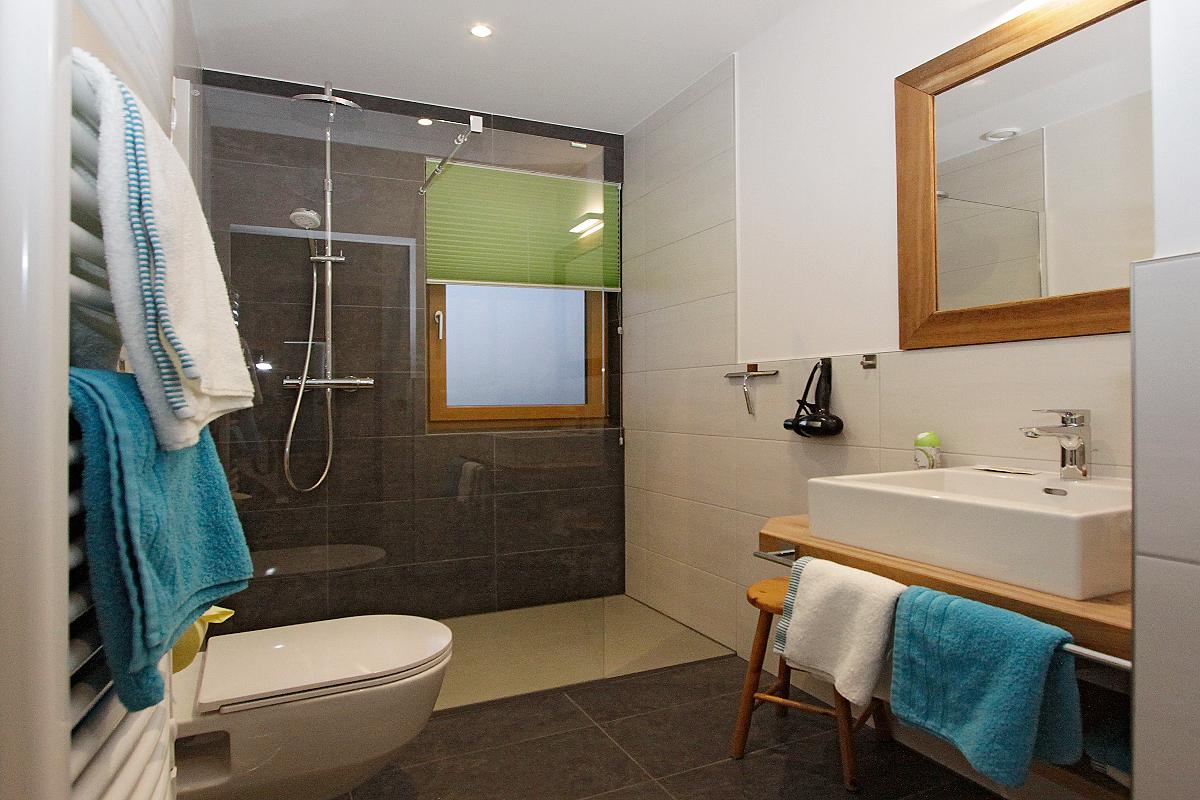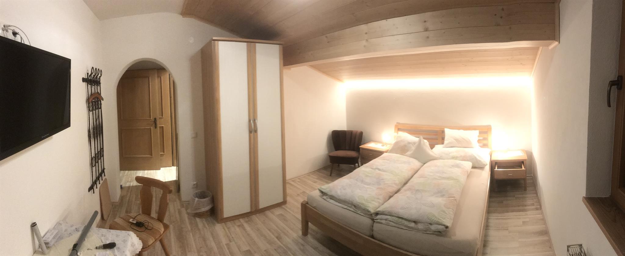 Großes Bad mit D/WC und Badewanne. Im Schlafzimmer ein Doppelbett und ein Schlafsofa.