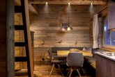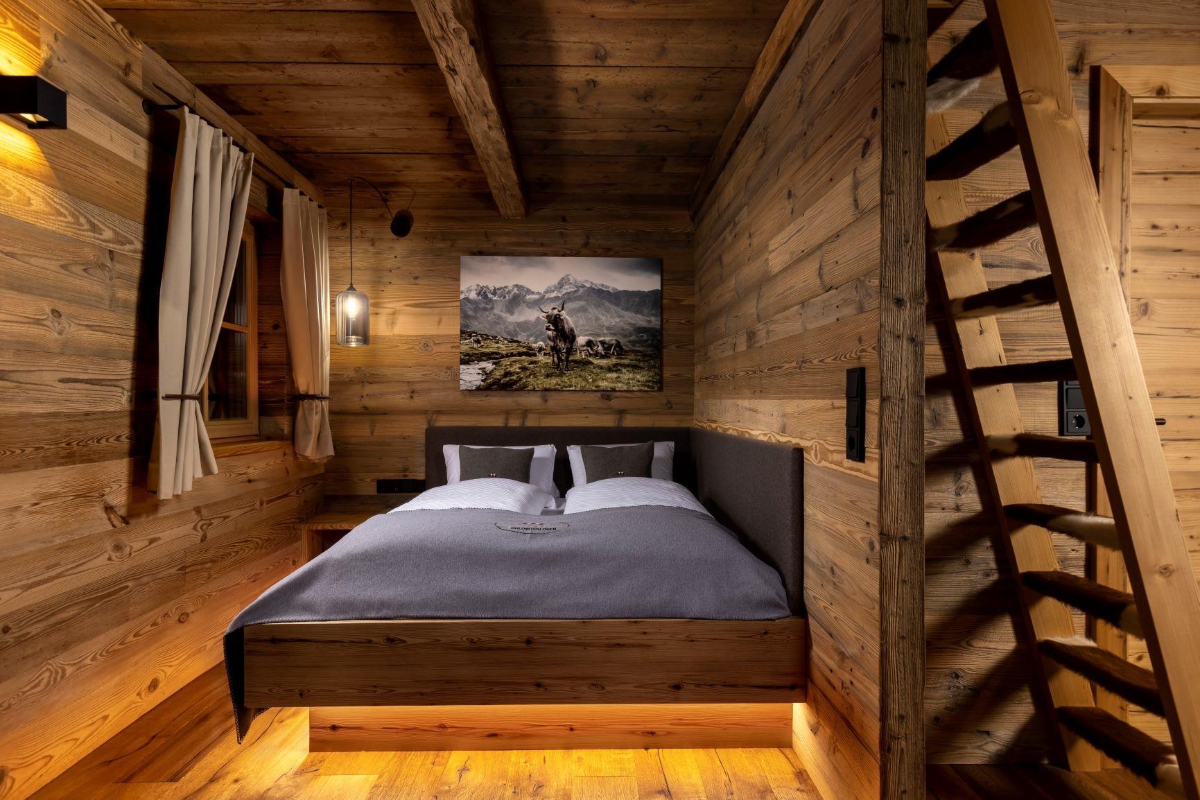 Unser romantisches Dolomiten Chalet für 2 Personen bietet 1 Schlafzimmer mit Doppelbett, Küchenzeile, Wohnbereich und Bad mit Dusche und WC. Über die Leiter findet man ein abenteuerliches Hochbett.