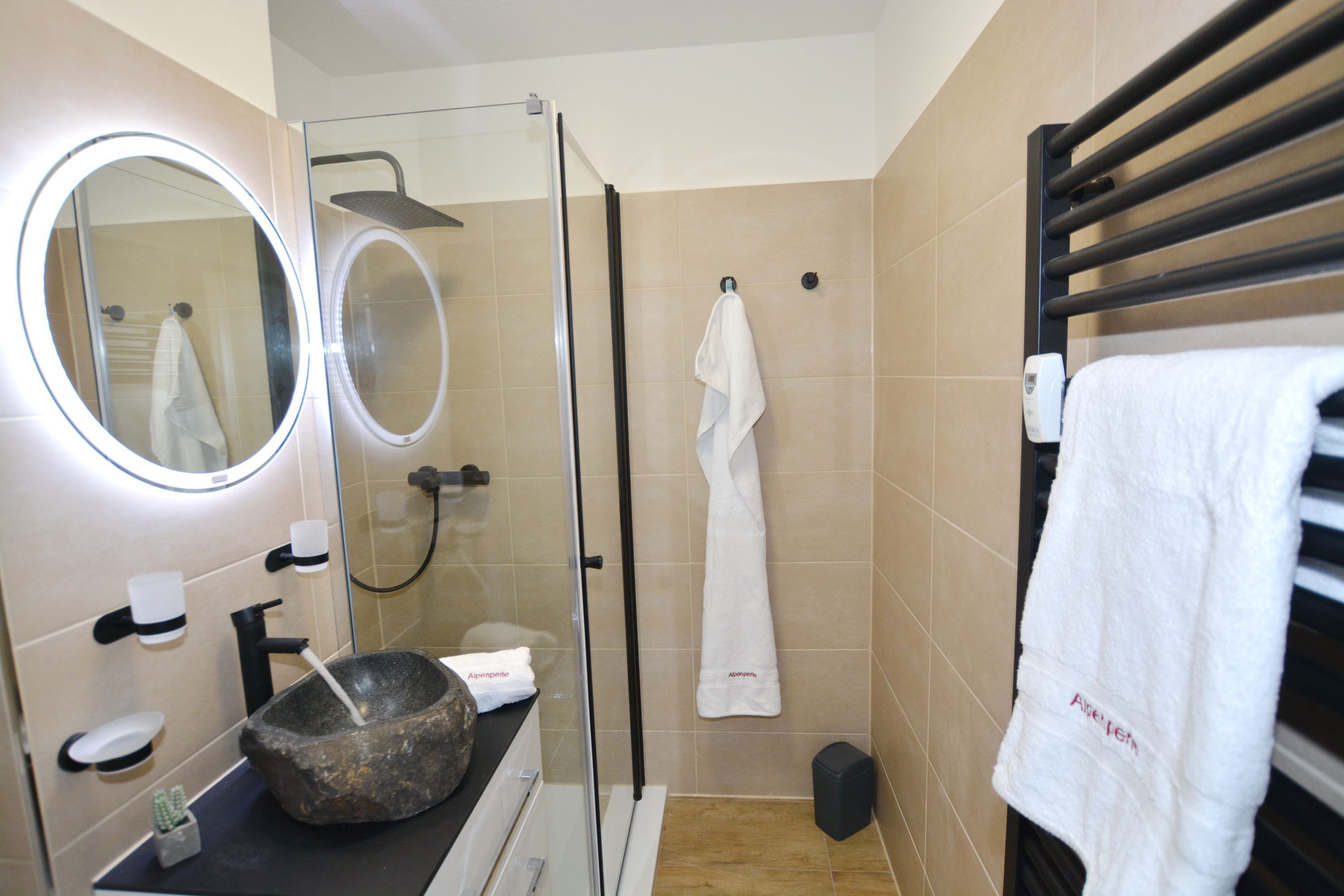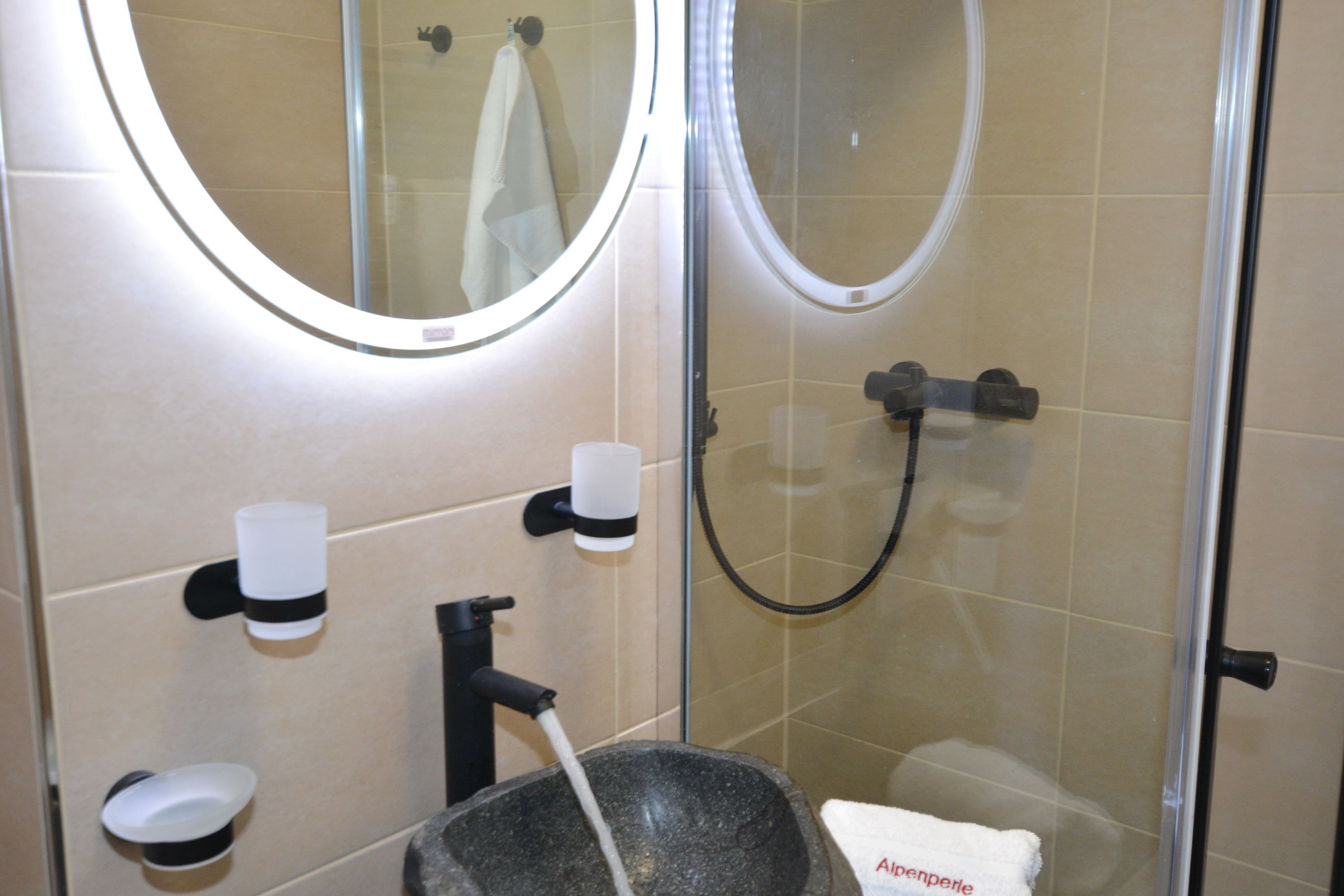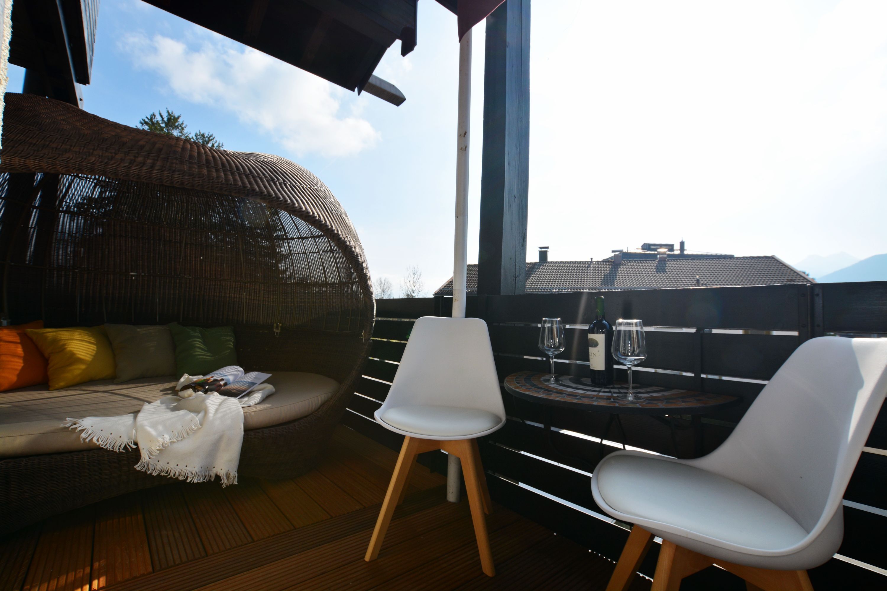 Die Ferienwohnung „Alpenperle“ befindet sich im 1. Obergeschoss (es sind jedoch zwei Stockwerke zu gehen) und bietet auf 53?m² Platz für bis zu 3 Personen. Sie verfügt über ein Schlafzimmer mit Doppelbett, einen offenen Wohnbereich mit voll ausgestatteter Küche und Schlafcouch, zwei TVs sowie ein modernes Bad mit Regendusche. Ein Highlight ist der große, umlaufende Süd-Ost-Balkon mit Outdoorküche, Gartenmuschel und verschiedenen Sitzmöglichkeiten ideal zum Entspannen mit Blick auf die Berge und den nahegelegenen Bach.