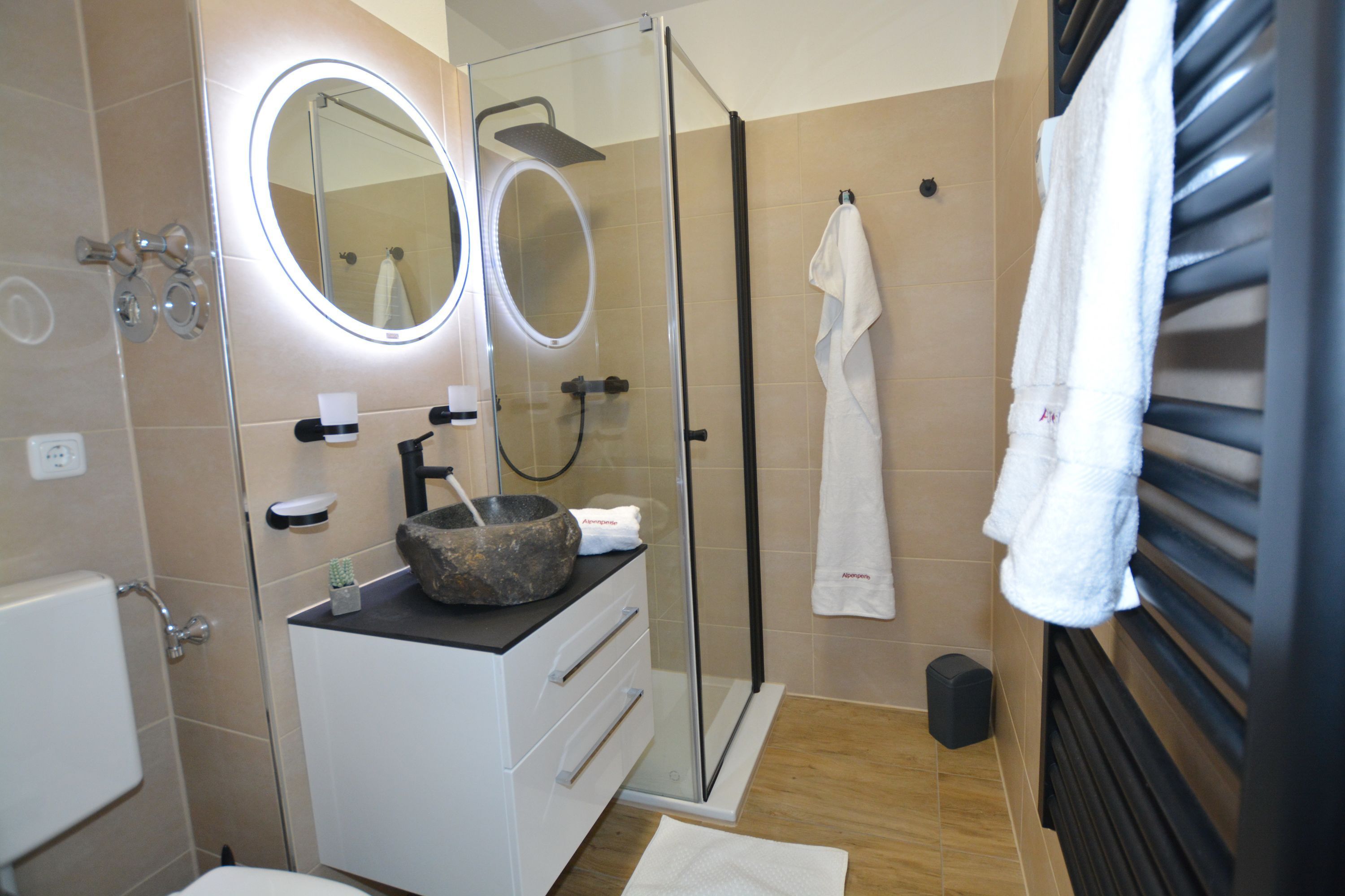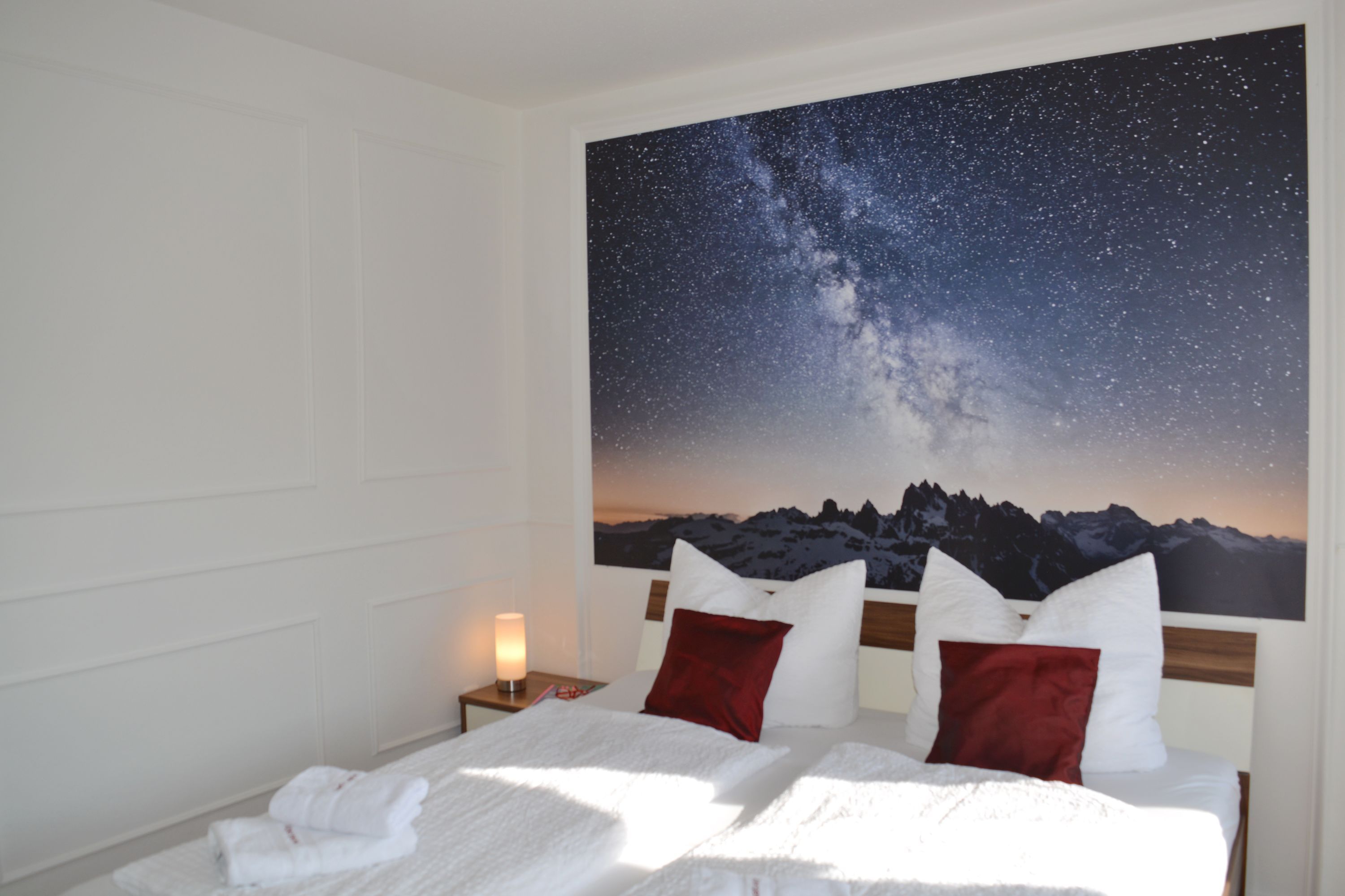 Die Ferienwohnung Alpenperle befindet sich im 1. Obergeschoss (es sind jedoch zwei Stockwerke zu gehen) und bietet auf 53?m² Platz für bis zu 3 Personen. Sie verfügt über ein Schlafzimmer mit Doppelbett, einen offenen Wohnbereich mit voll ausgestatteter Küche und Schlafcouch, zwei TVs sowie ein modernes Bad mit Regendusche. Ein Highlight ist der große, umlaufende Süd-Ost-Balkon mit Outdoorküche, Gartenmuschel und verschiedenen Sitzmöglichkeiten ideal zum Entspannen mit Blick auf die Berge und den nahegelegenen Bach.