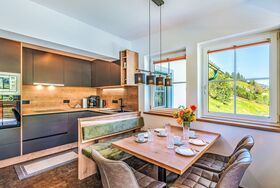 Grimming, 4-Zimmer-Wohnung 90 m2, im erhöhten Erdgeschoss. Hell, sehr gemütlich eingerichtet: Wohn-/Esszimmer mit Esstisch, Sat-TV und Internationale TV-Sender (Flachbildschirm), E-Heizung. Ausgang zum Balkon. 1 Doppelzimmer mit Sat-TV und Internationale TV-Sender (Flachbildschirm). Ausgang zum Balkon. 1 Zimmer mit 1 Bett, Sat-TV und Internationale TV-Sender (Flachbildschirm). 1 Doppelzimmer mit Sat-TV und Internationale TV-Sender (Flachbildschirm). Offene Küche (Backofen, Geschirrspüler, 4 Glaskeramikplatten, Toaster, Wasserkocher, Mikrowelle, elektrische Kaffeemaschine). Bad/Dusche, sep. WC, Doppelwaschbecken. E-Heizung. Parkettboden. Balkon. Balkonmöbel. Schöne Sicht auf die Berge. Zur Verfügung: Internet (WLAN, gratis). Bitte beachten: Nichtraucher-Unterkunft. Maximal 1 Haustier/Hund erlaubt.
