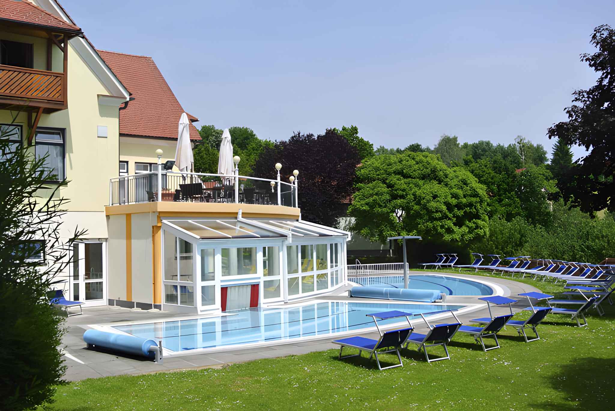 Thermalwasserpool ganzjährig im FREIN im (beheizbar, 12 m x 20 m, Tiefe 1,35 m, zur gemeinsamen Nutzung). Die Pool-Anlage ist ganzjährig nutzbar.