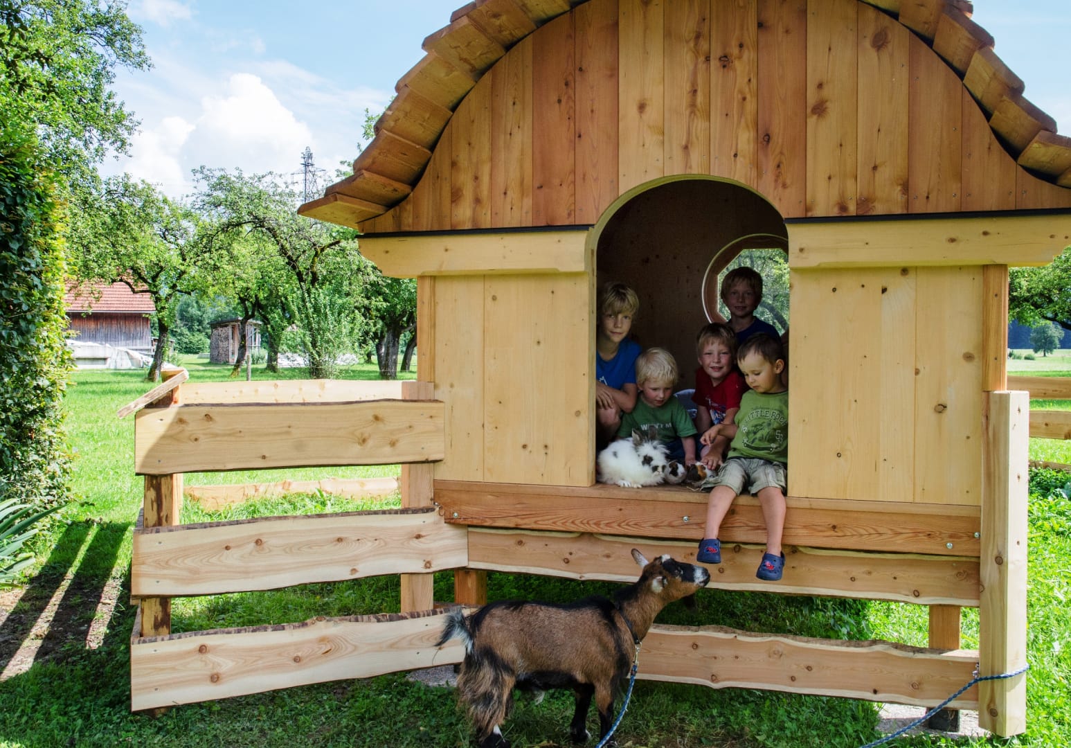 DER HOF - Kühe, Kälber, Zwergziegen, Schwein, Katzen, Hasen, Hühner, Enten hautnah erleben - streicheln, füttern oder im neuen Laufstall einfach nur beobachten. Der große Garten mit Schaukeln, Rutschen, Go-Karts, Tischfußball, Tischtennis ... Alles was das Herz begehrt!