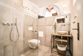 · 1 Badezimmer mit Dusche, Toilette, Waschbecken