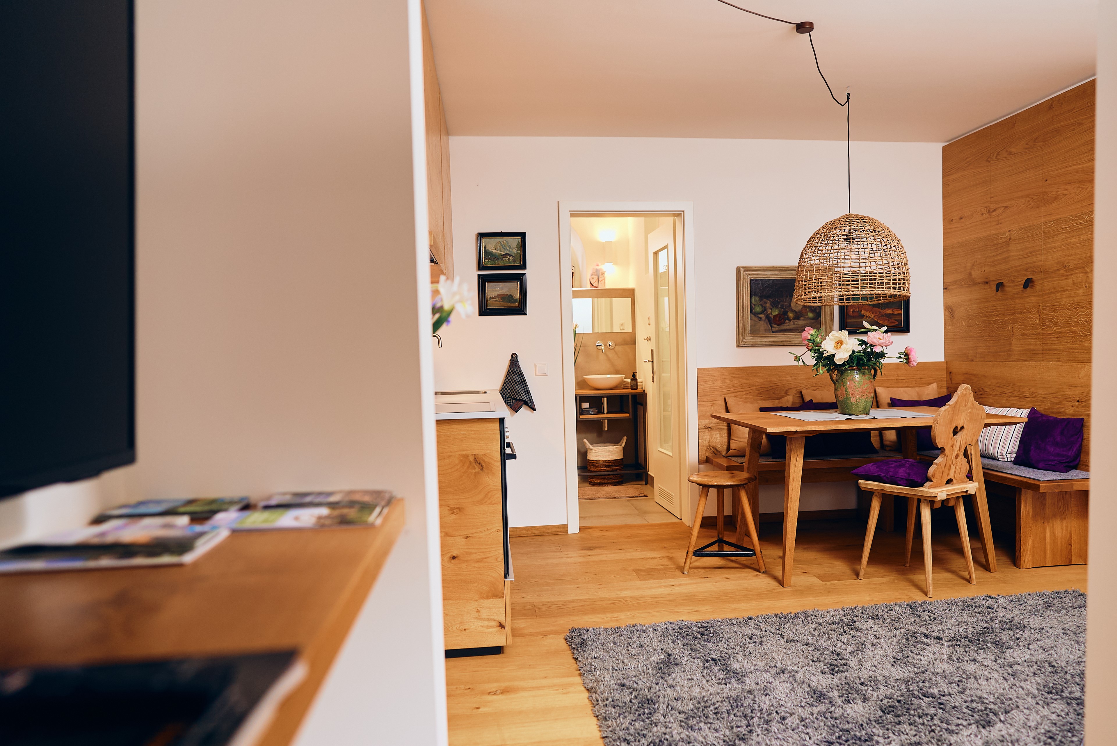 · 1 Wohn-/ Essbereich: Eckbank, Stühle, Esstisch und TV