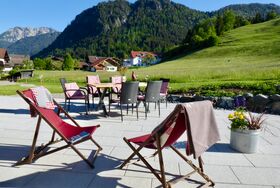 Ferienwohnung Gipfelstürmer Der Gipfelstürmer bietet mit 65 m² und einem eigenen Hauseingang ein einzigartiges Urlaubserlebnis. Im 1. Stock mit Südausrichtung gelegen, genießen Sie vom privaten 10 m² großen Balkon aus den malerischen Blick auf die Allgäuer Berge und das Zugspitzmassiv. Ein helles Wohnzimmer mit Sofa und Ohrensessel, eine große Küche mit Esstisch, ein Badezimmer, ein Schlafzimmer mit einem Zirbenholzbett und -kleiderschrank sowie ein separates WC schaffen eine Atmosphäre zum Wohlfühlen. Der Duft des Zirbenholzes verspricht erholsamen Schlaf, während Echtholzböden das Ambiente abrunden. Zu den Annehmlichkeiten gehören ein Safe, Dusche, Kosmetikspiegel, Fön, eine voll ausgestattete Küche, Smart-TV und kostenfreies WLAN. Zusätzliche Unterstellmöglichkeiten für E-Bikes sind vorhanden. Gäste haben Zugang zu unserem gepflegten Garten und der Sonnenterrasse. Bei Bedarf kann Gipfelstürmer um Großer Gipfelstürmer erweitert werden, ideal für Gruppen bis 4 Erwachsene.