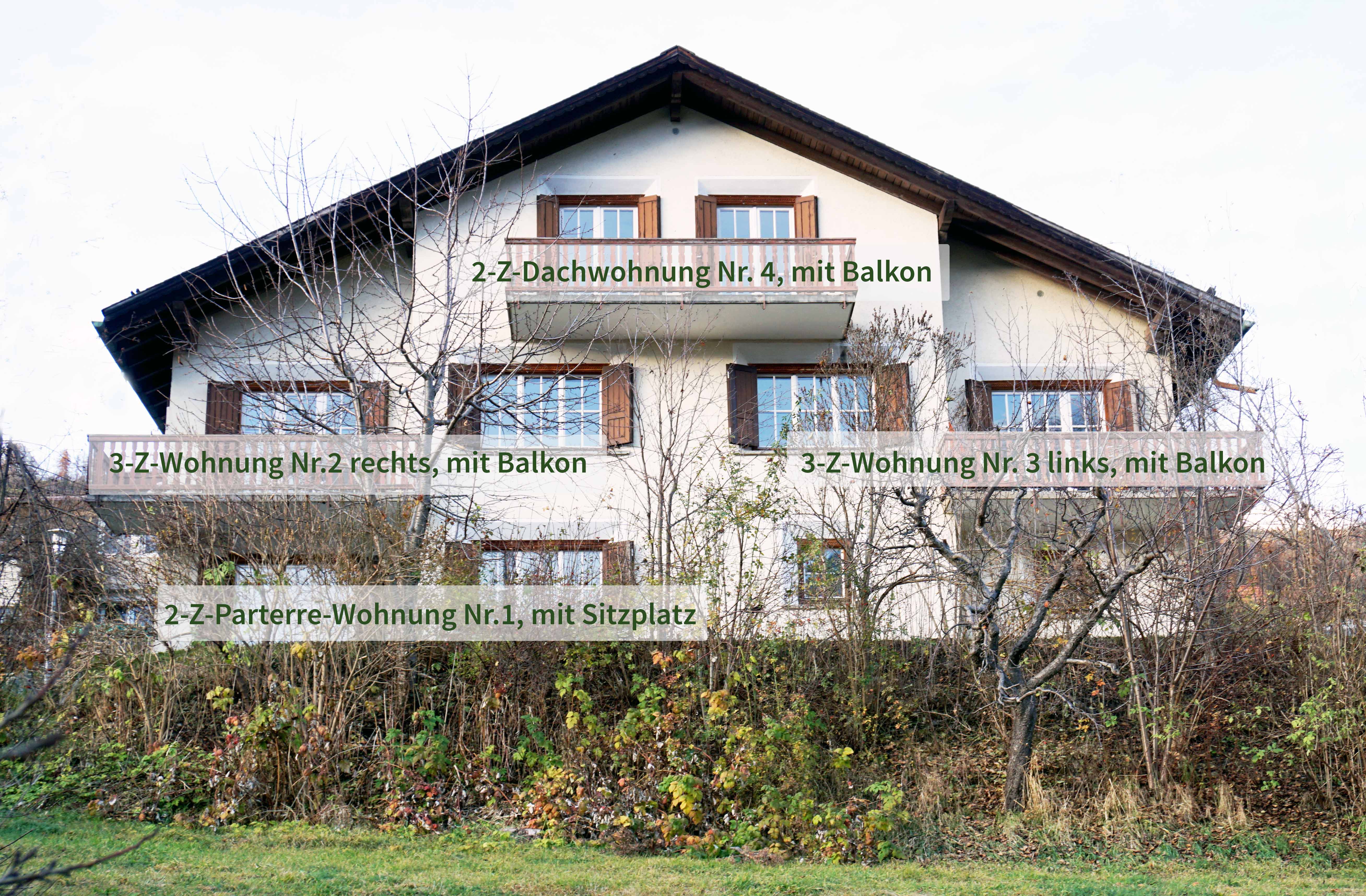 Die vier Wohnungen sind zwischen 55 und 60 m2 gross. Die oberen Wohnungen haben einen grossen Balkon, diejenige im Parterre einen Sitzplatz. In beiden Dreizimmerwohnungen verfügen Sie über zwei Schlafzimmer und ein Wohnzimmer mit einem Sofa, in den Zweizimmerwohnungen über ein Schlafzimmer weniger. Die Küche ist zweckmässig eingerichtet. Das Badezimmer entspricht heutigen Ansprüchen. Die Bettwäsche wird nach zwei Wochen gewechselt. Die Garage kann im Winter als Skiraum genutzt werden.