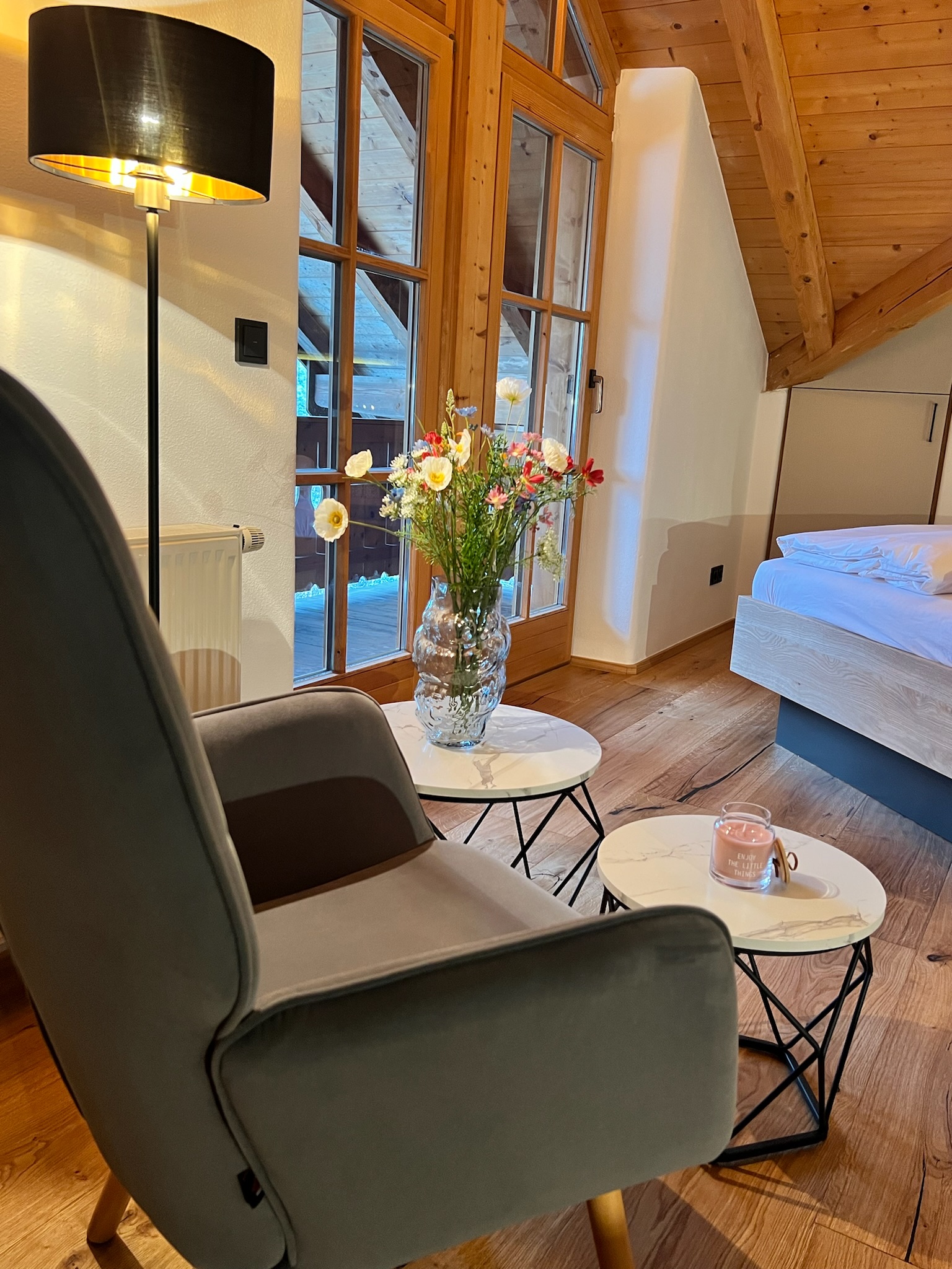 Die Wohnung verfügt über großzügige und geschmackvoll eingerichtete Zimmer, die eine gemütliche Atmosphäre schaffen. Große Fenster bieten einen herrlichen Blick auf die umliegende Berglandschaft und lassen viel Tageslicht herein.