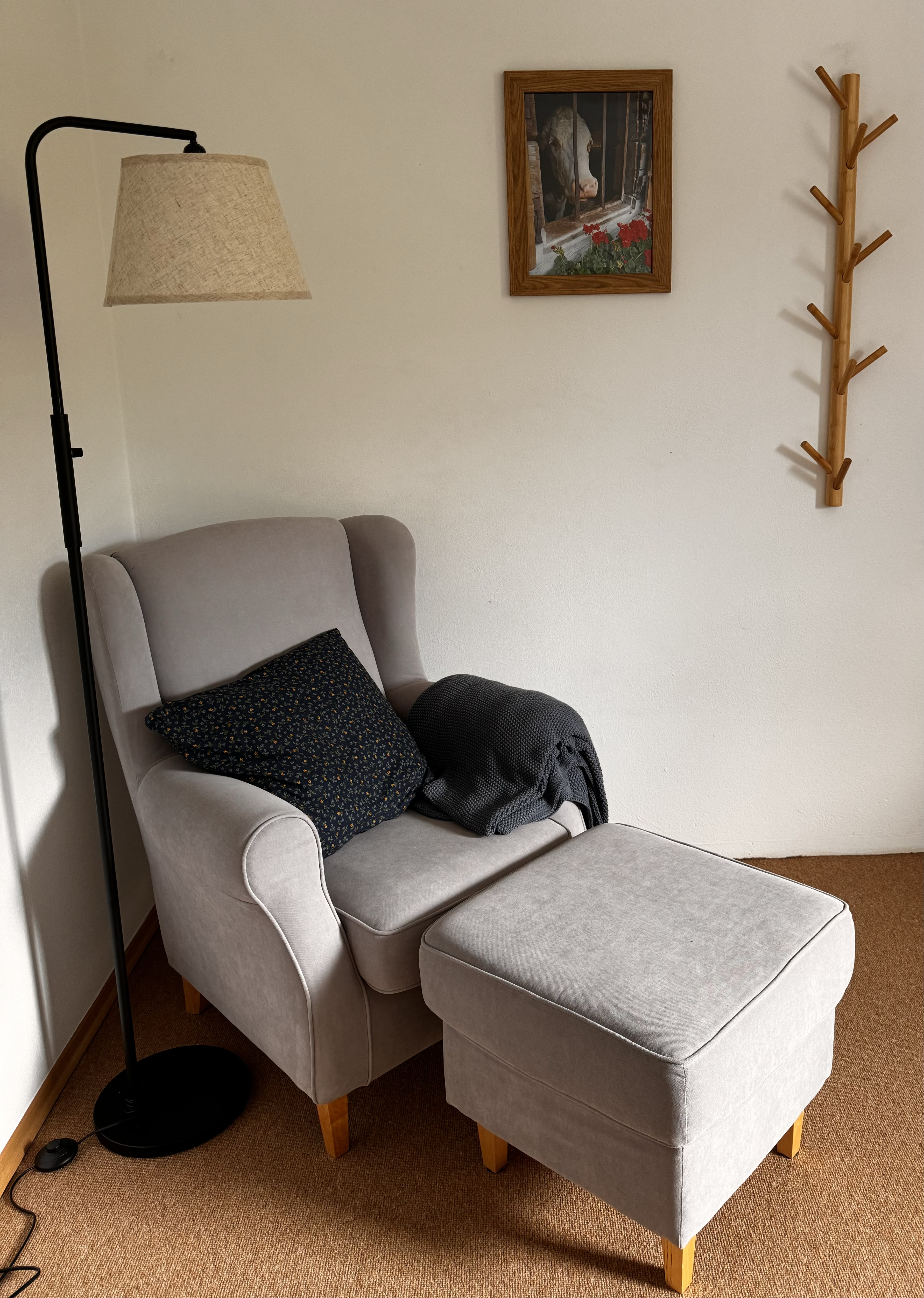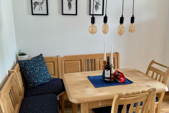 Klein aber fein: Unsere Ferienwohnung Gretel im 1. OG ist für 1-2 Personen eingerichtet und verfügt über einen Wohn/Schlafraum mit Doppelbett inkl. Bettwäsche, Sessel, TV, Kleiderschrank und Garderobe. Angrenzend befindet sich die Küche mit einer gemütlichen Eckbankgruppe und einer voll ausgestatteten Mini Küche mit Backofen und Kühlschrank. Eine Abstellkammer bietet Platz für z.B. Koffer, Kletterausrüstung und Ihr weiteres Gepäck.