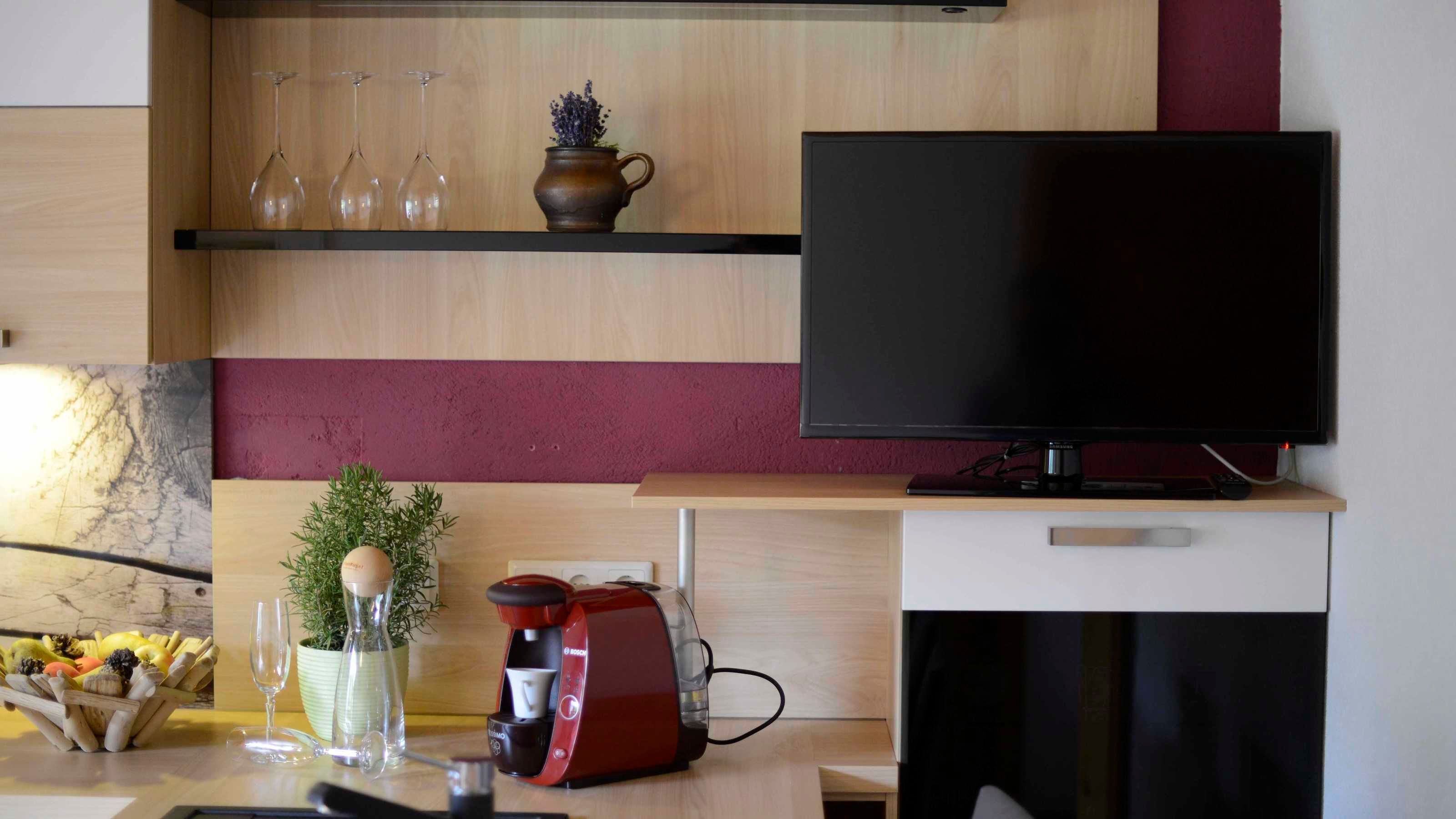 ca. 70 qm groß für 2 Personen, mit 2 getrennten Räumen, 1 Wohn-Schlafzimmer mit Himmelbett, Zierkachelofen, Kuschelrundcouch und Kleiderschrank in XXL, Farb-TV und DVD-Player sind auch in diesem Zimmer, 1 separate Wohnküche mit großem Esstisch , komplett eingerichtete Ferienküche mit Backofen, Spülmaschine, Mikrowelle, Kaffeemaschine, Espressomaschine, Wasserkocher usw... Bad mit Doppelwaschbecken, kombinierte Dusch/Badewanne/WC/Föhn und Kosmetikspiegel. Safe, kostenloser Internetzugang sowie viele Wandmalereien und Holzschnitzarbeiten machen diese Ferienwohnung zu etwas ganz Besonderem.