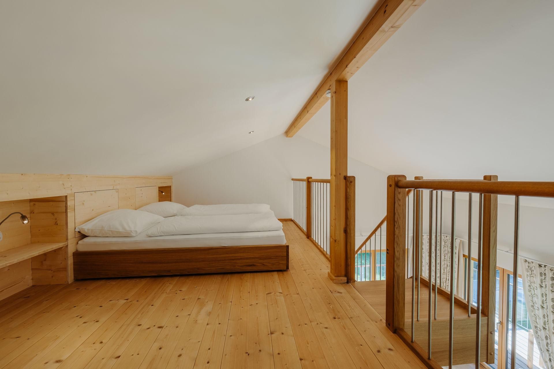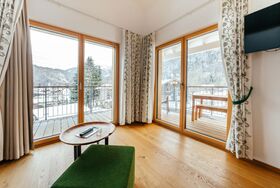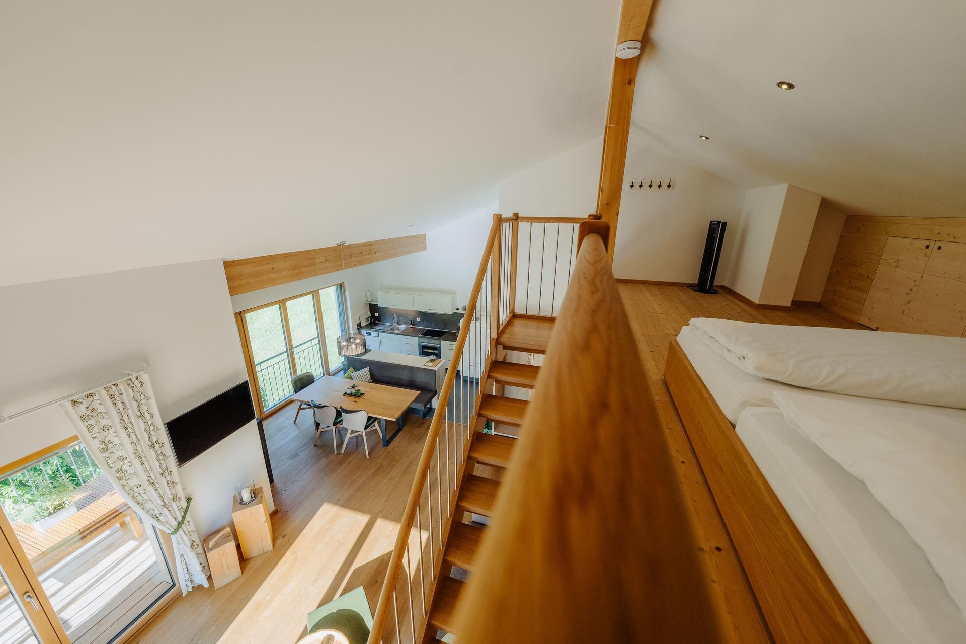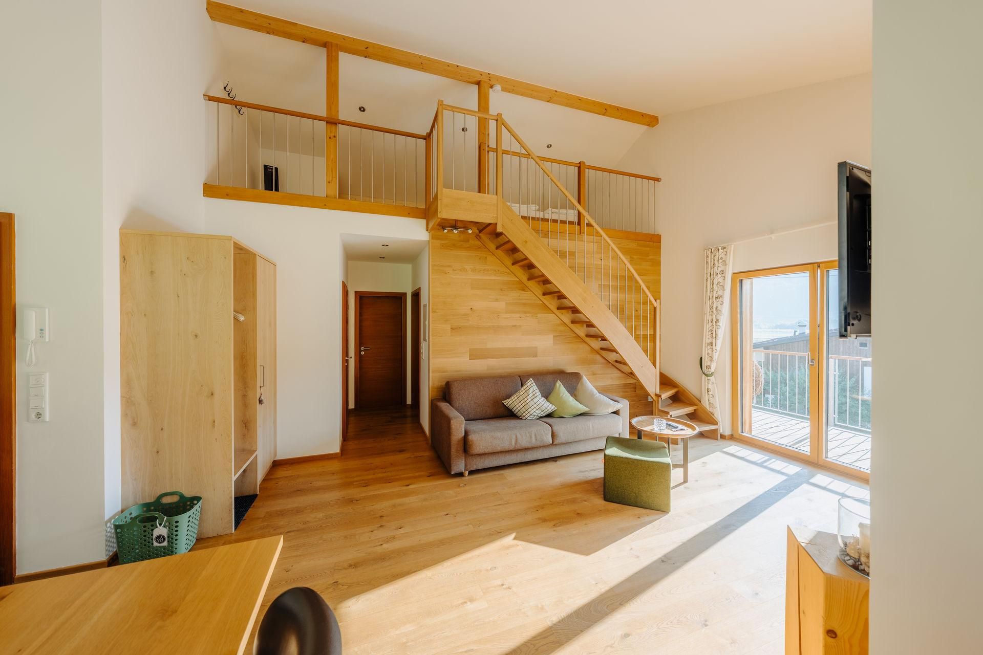 Einzigartige Wohlfühlmomente mit fantastischem Ausblick. Diese Wohnung liegt im Obergeschoss und besticht mit einem großen Balkon und einer Galerie. Das offene Obergeschoss mit seiner integrierten Galerie schafft Offenheit und Leichtigkeit für 6 Personen. Der Balkon hat 28m² und ist ein echter Outdoor Experte.