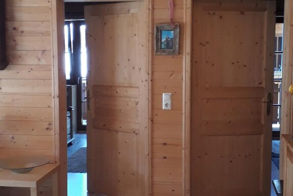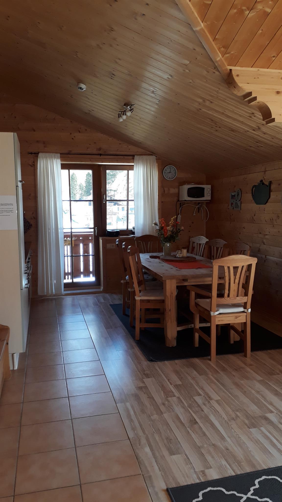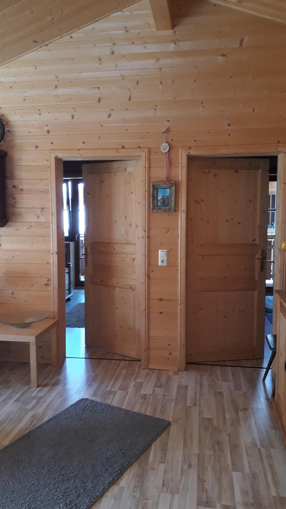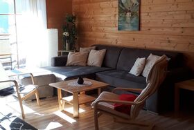 In gemütlicher Holzhausatmosphäre gelegene geräumige Ferienwohnung (95 m²) mit 3 Schlafzimmer, Duschbad mit WC, Gästetoilette, großer Wohn/Essbereich mit vollständig eingerichteter Einbauküche, Liegewiese, TV, Internetanschluß, 3 Balkone.