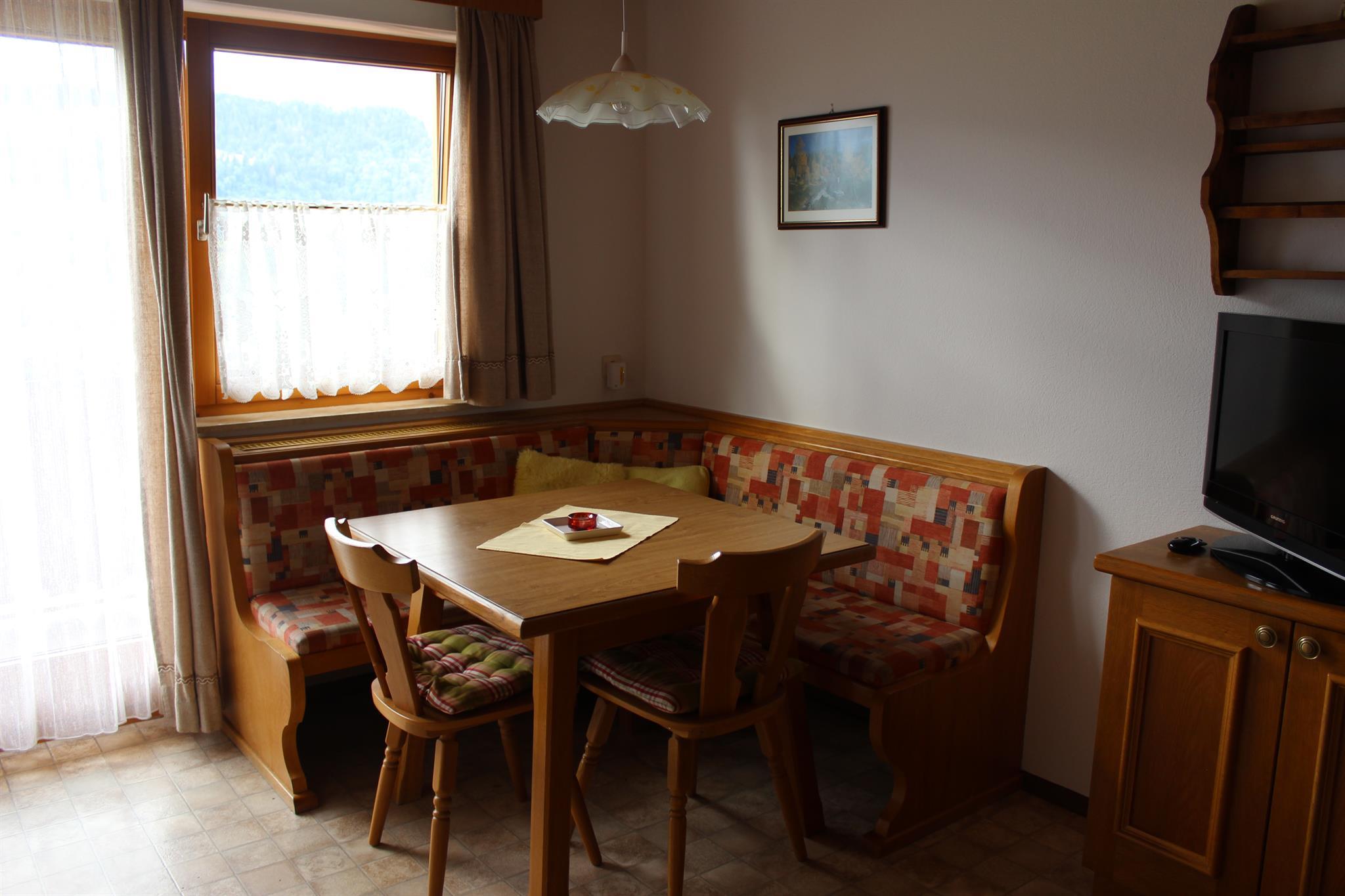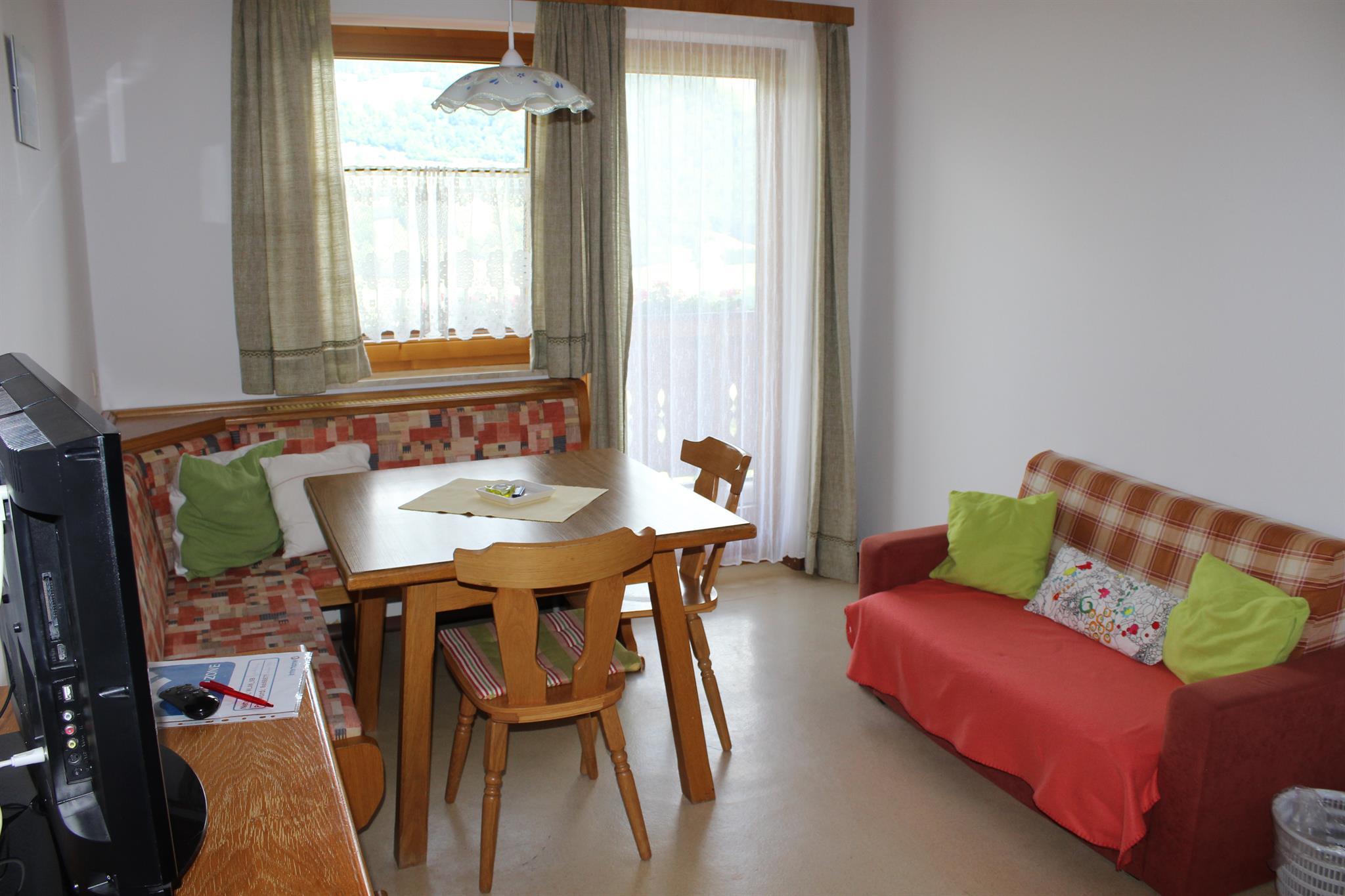 Appartement Typ B, die Wohnung befindet sich im 2. Stock (gegenüberliegend zur Wohnung C) mit Balkon und einem herrlichen Ausblick über das obere Ennstal wo man sein Frühstück morgens und das Abendessen nach einem abenteuerreichen Tag auf dem Berg genießen kann. Das Appartement ist ausgestattet mit einer Wohnküche mit TV, einem Schlafzimmer mit 2 getrennte Betten, einem Schlafzimmer mit Doppelbett und einem Sofa zum Ausziehen. Badezimmer und Toilette sind nicht getrennt.
