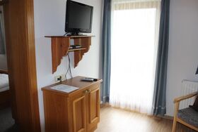 Appartement A, Die Wohnung liegt im Paterre, für 2 Personen; komfortabel für Gäste die nicht gerne Stiegen gehen. Wohnküche mit TV und einer Ausgangstüre auf die Terrasse. Die Terrasse bietet einen wunderschönen Ausblick und genügend Platz für Kinder zum spielen im Freien. Dusche mit WC extra, Schlafzimmer mit Doppelbett und Kinderbett.