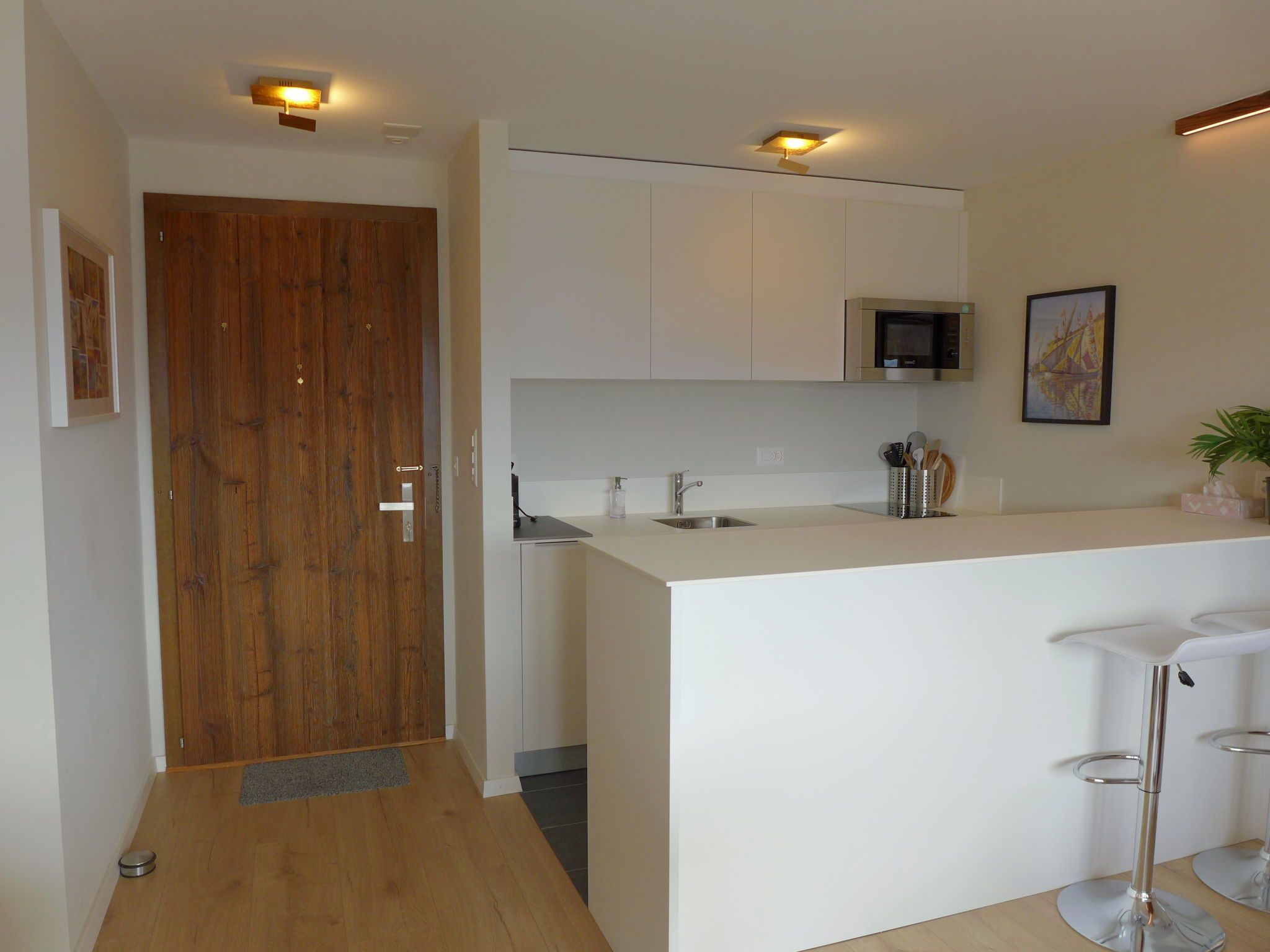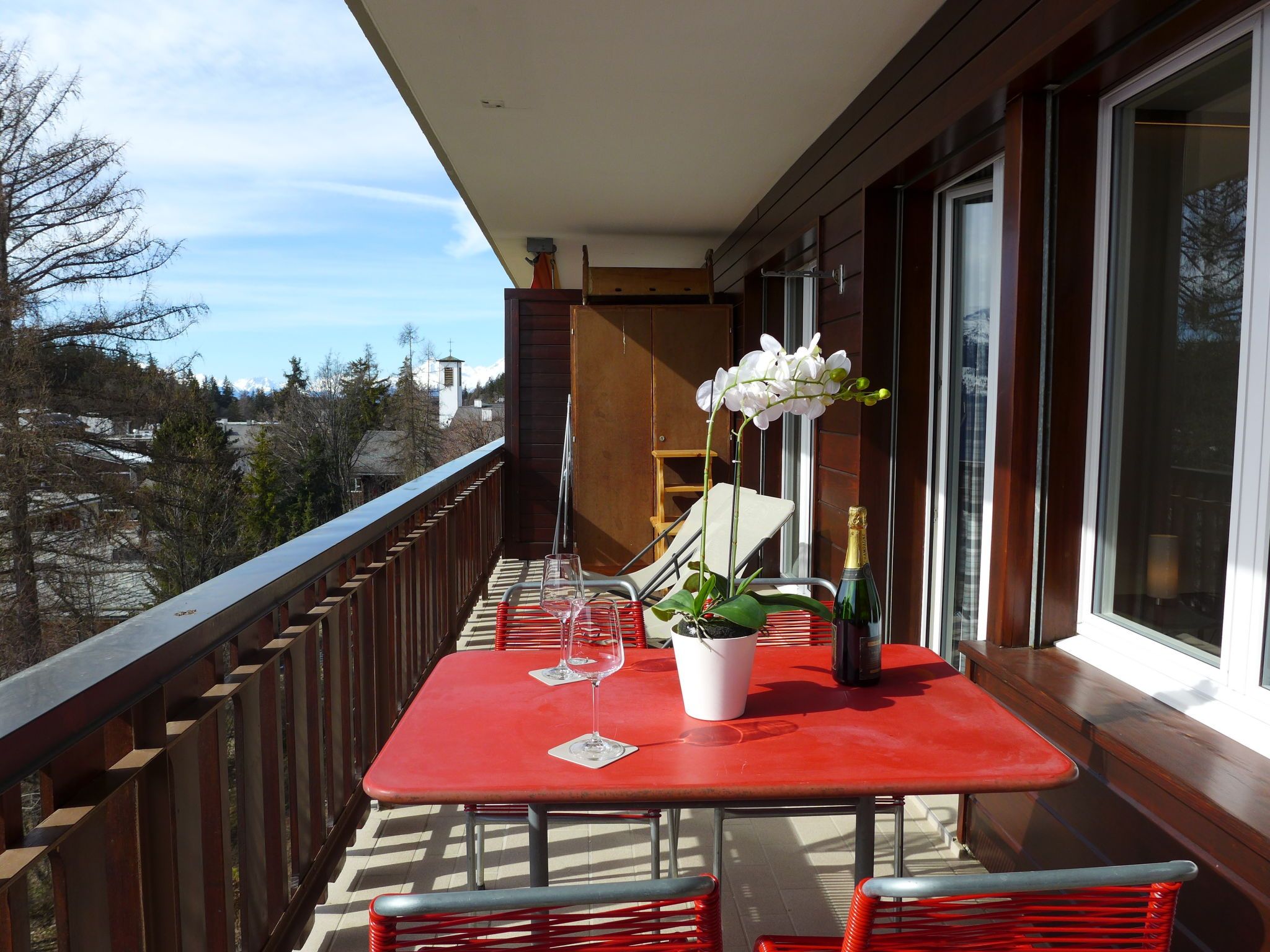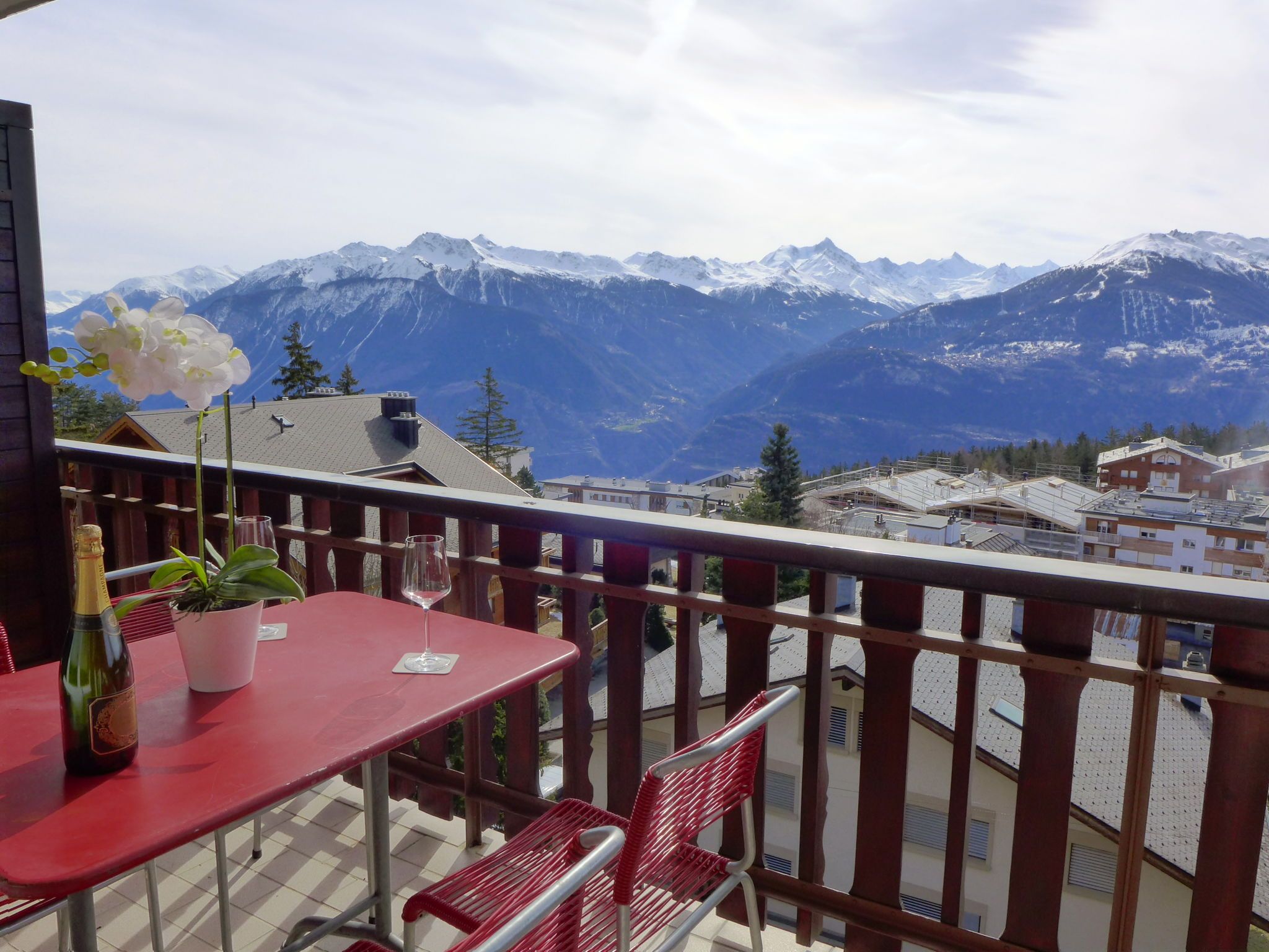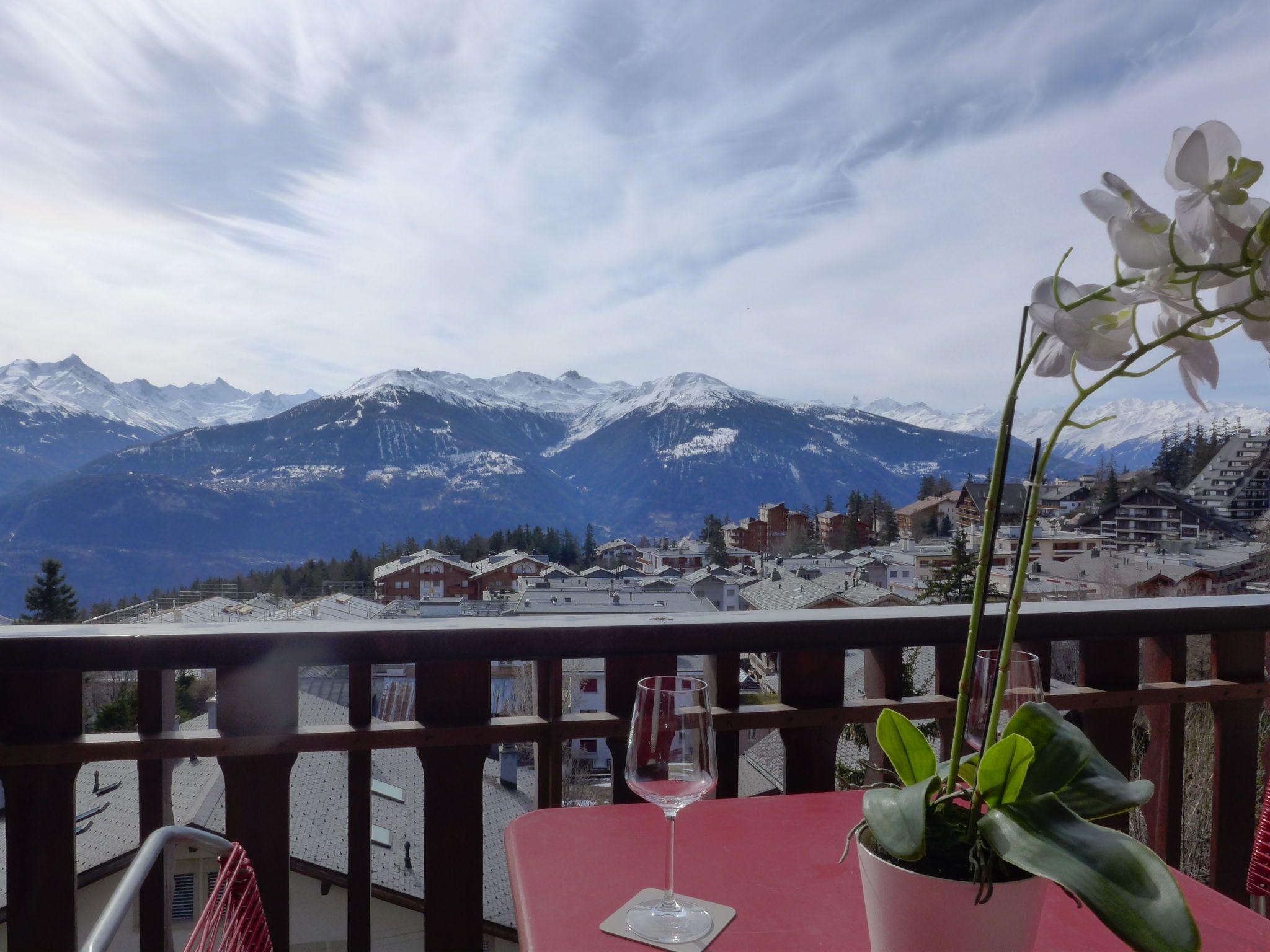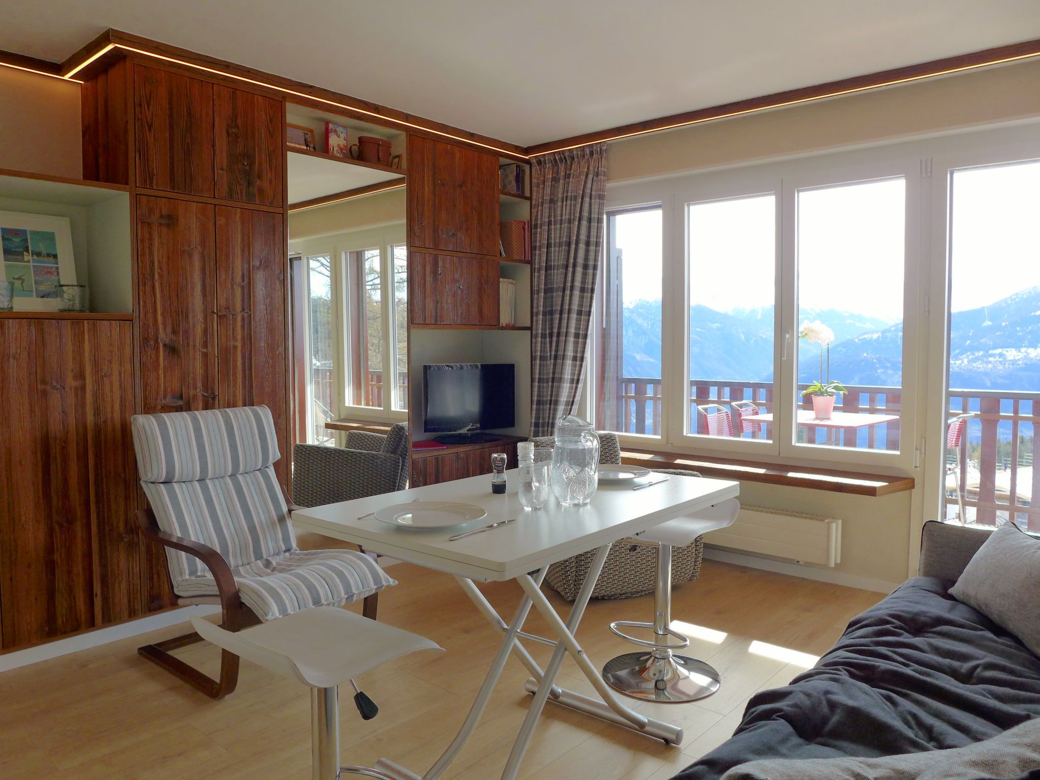 Elysée 29, 2-Zimmer-Wohnung 45 m2 im 1. Stock. Vollständig renoviert im Jahre 2023, komfortabel und schön eingerichtet: Wohn-/Esszimmer mit Kabel-TV. Ausgang zum Balkon. 1 Zimmer mit 1 franz. Bett (180 cm, Länge 200 cm). Ausgang zum Balkon. Offene Küche (Backofen, Geschirrspüler, 2 Glaskeramikplatten, Toaster, Wasserkocher, Mikrowelle, elektrische Kaffeemaschine, Kapseln für die Kaffeemaschine (Nespresso) extra, Racletteofen, Fondue Set (Chinoise, Käse)). Bad/WC. Grosser Balkon, Südlage. Balkonmöbel. Sehr schöne Sicht auf die Berge und die Landschaft. Zur Verfügung: Haartrockner. Internet (Wireless LAN). Bitte beachten: Nichtraucher-Unterkunft.