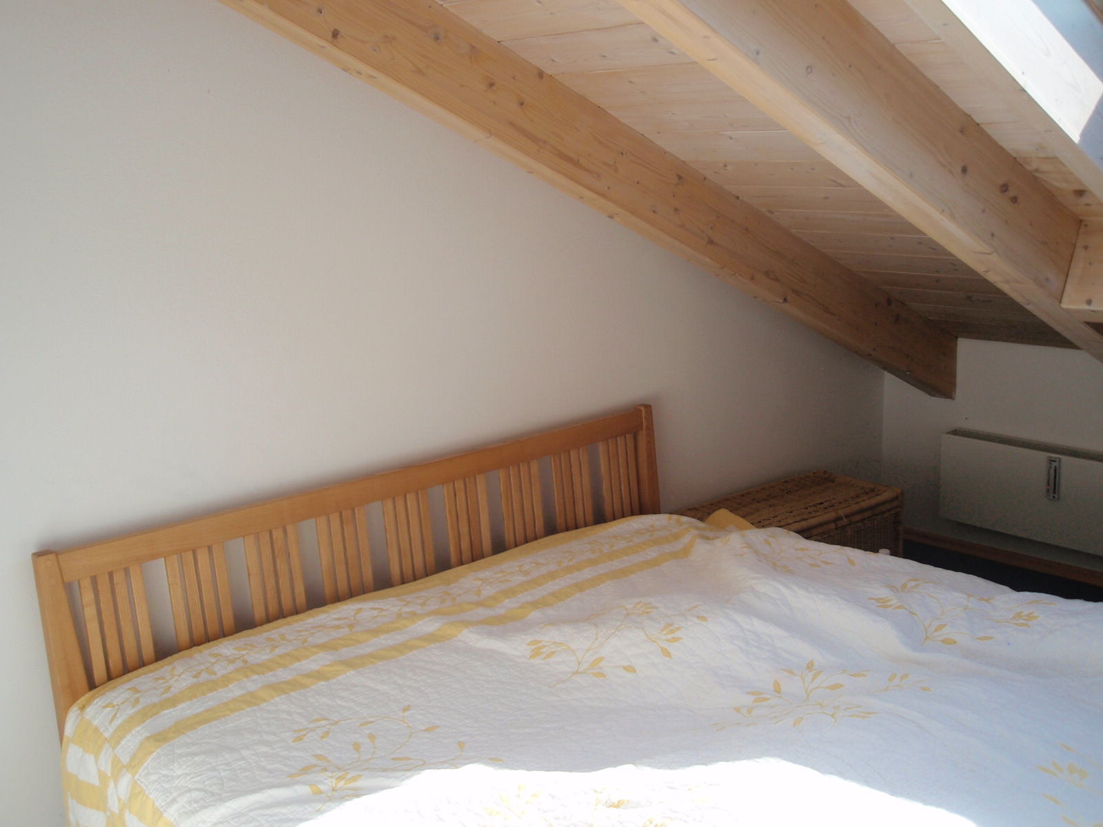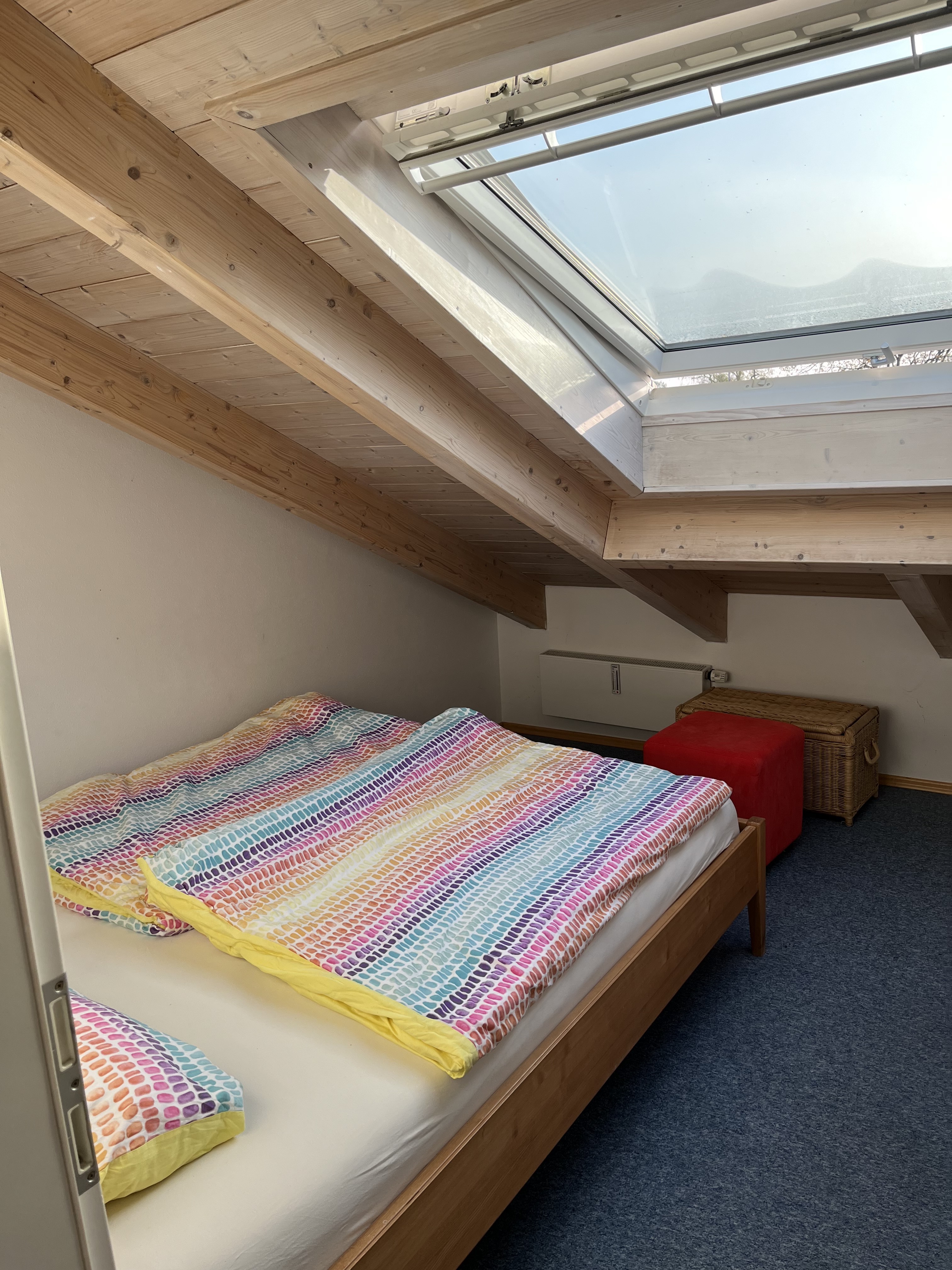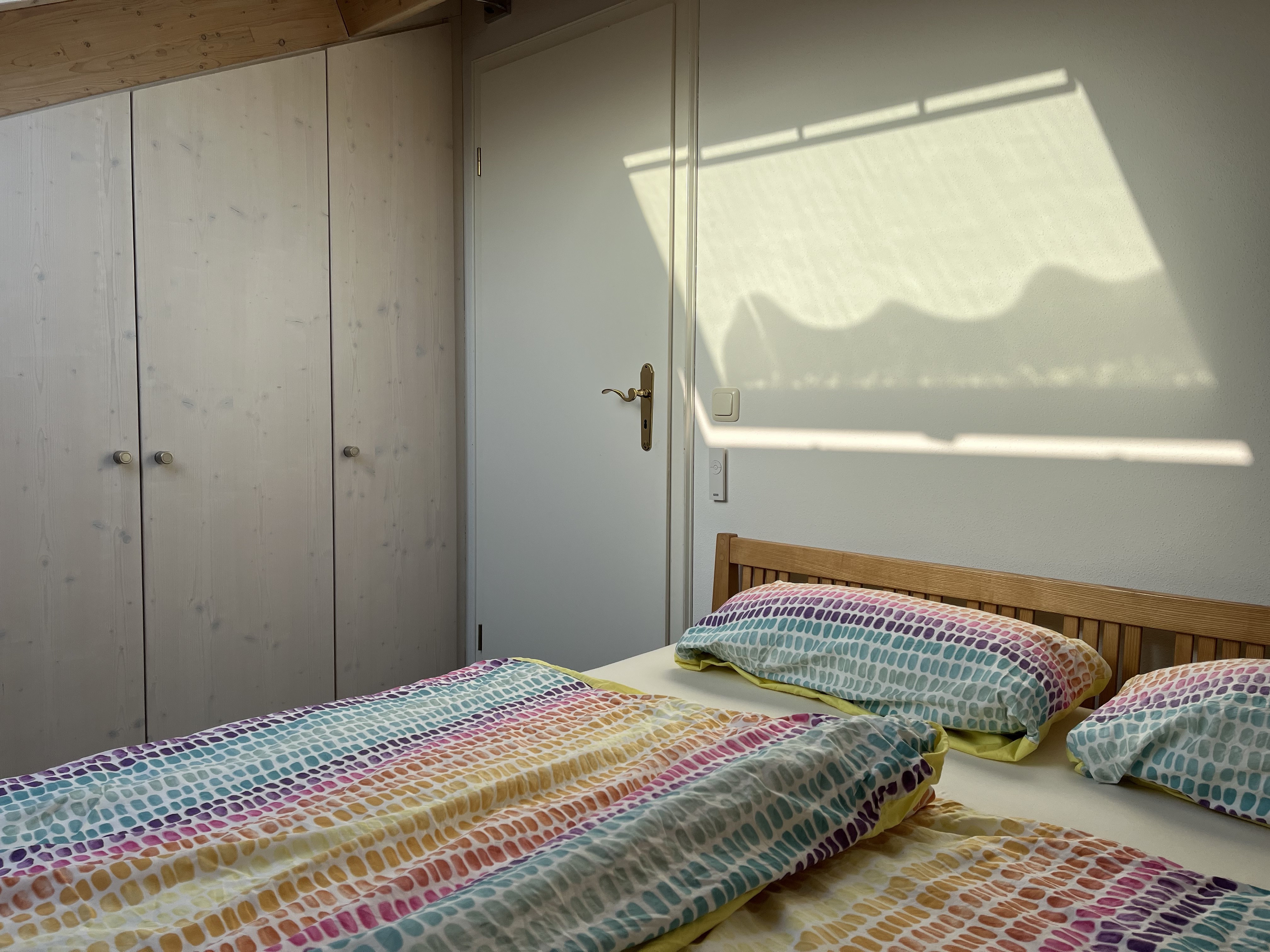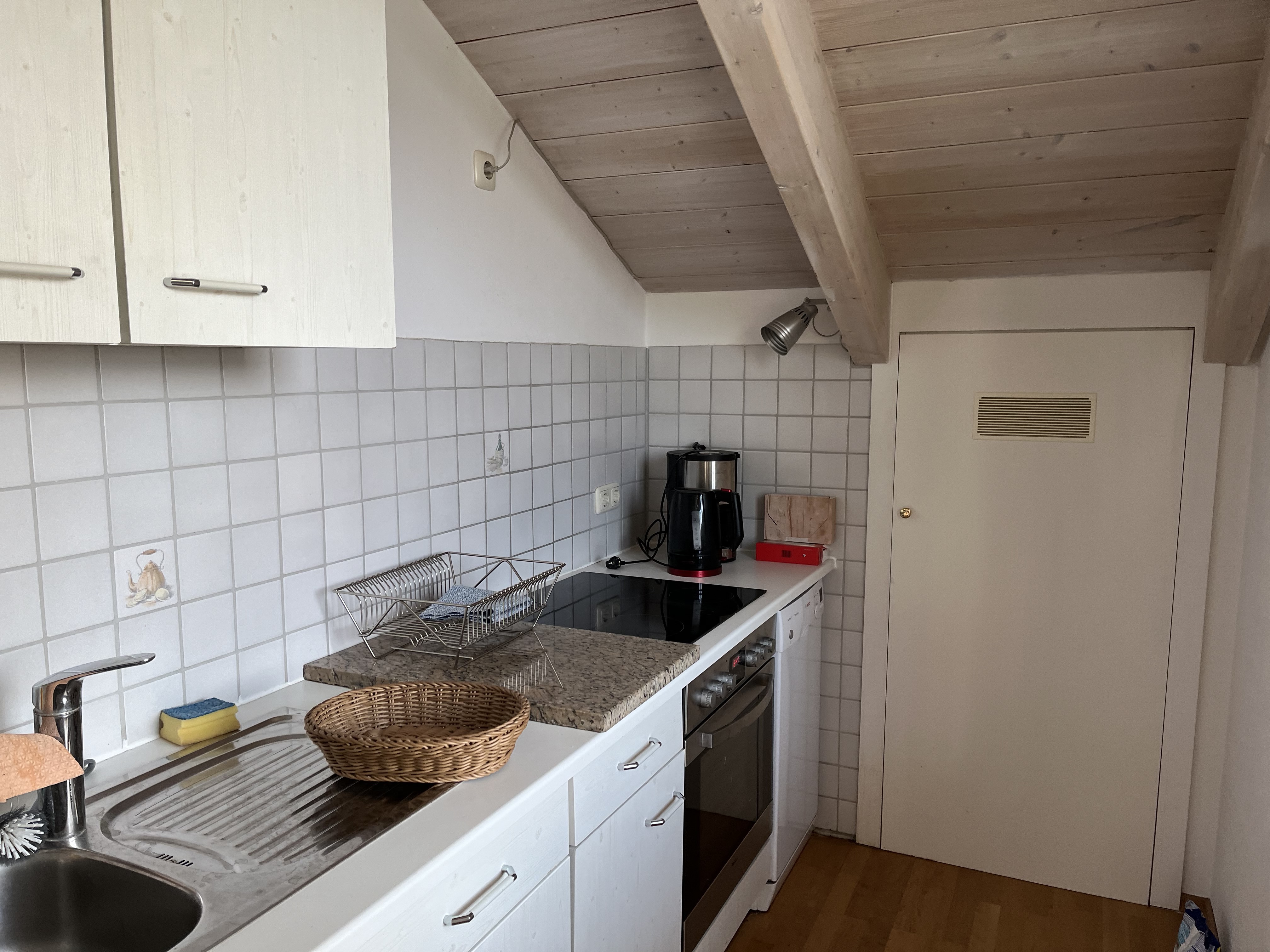 schöne, ruhige, lichtdurchflutete 2- Zimmerwohnung im Dachgeschoss mit großem Südbalkon. Wohnzimmer mit Schlafcouch, großem Flachbild-TV, Radio, großem Esstisch mit Bergblick. Vollausgestattete Küche mit 3 Platten Herd, Backofen, Spülmaschine, Kühlschrank, Gefriertruhe. Schlafzimmer mit Doppelbett 160 x 200 cm, Echtholzeinbauschränke, viel Stauraum. Neu renoviertes Bad mit Naturstein, großer Dusche. W-Lan, elektrische Rollos. Waschmaschine und Trockner im Keller zur Mitbenutzung.
