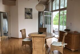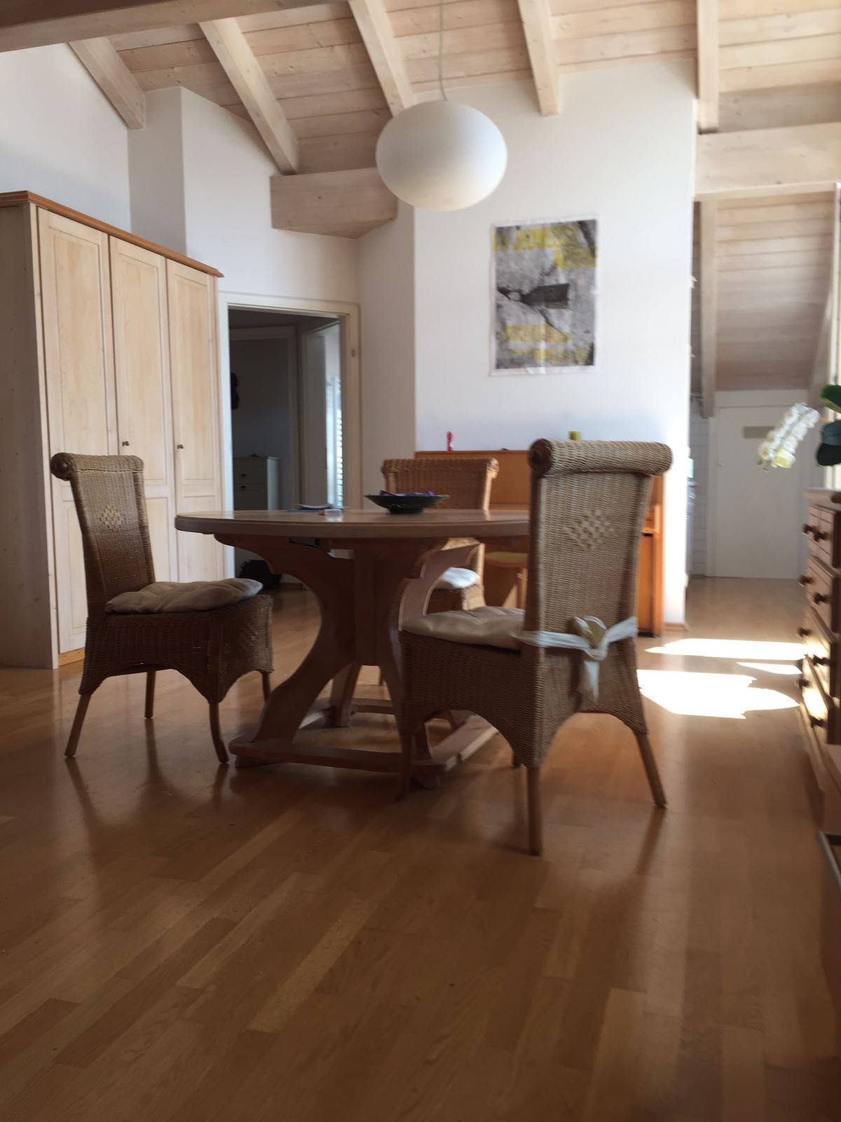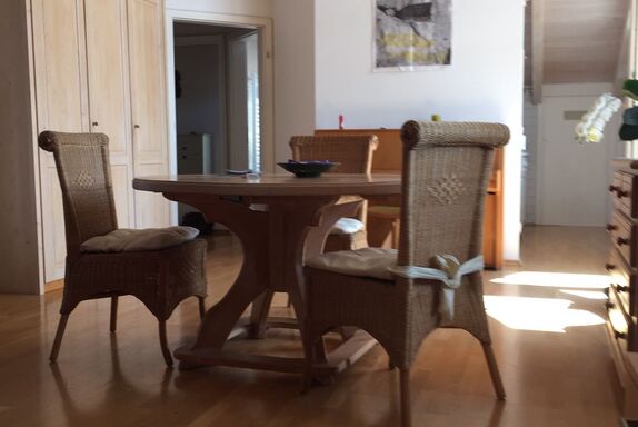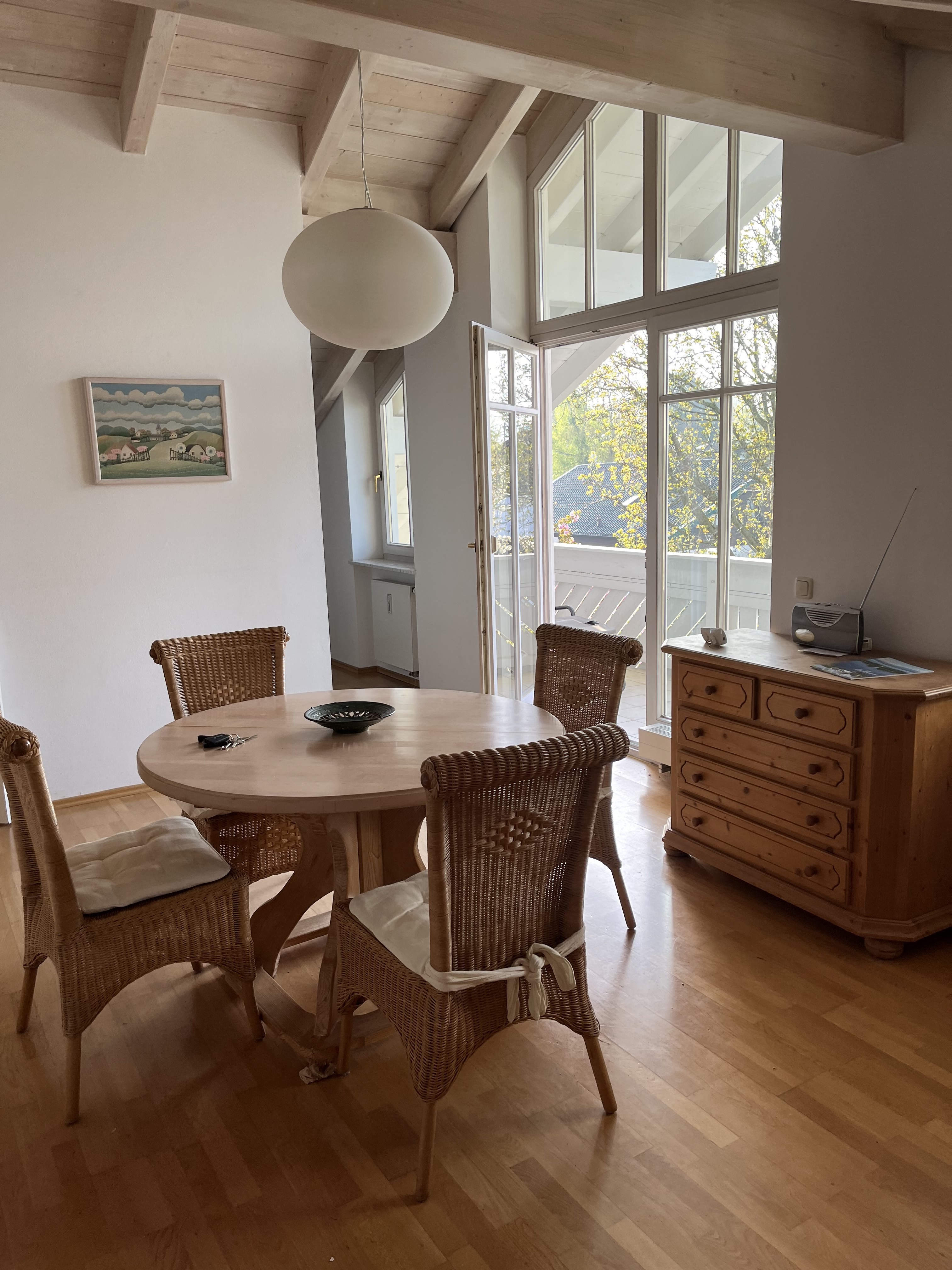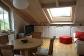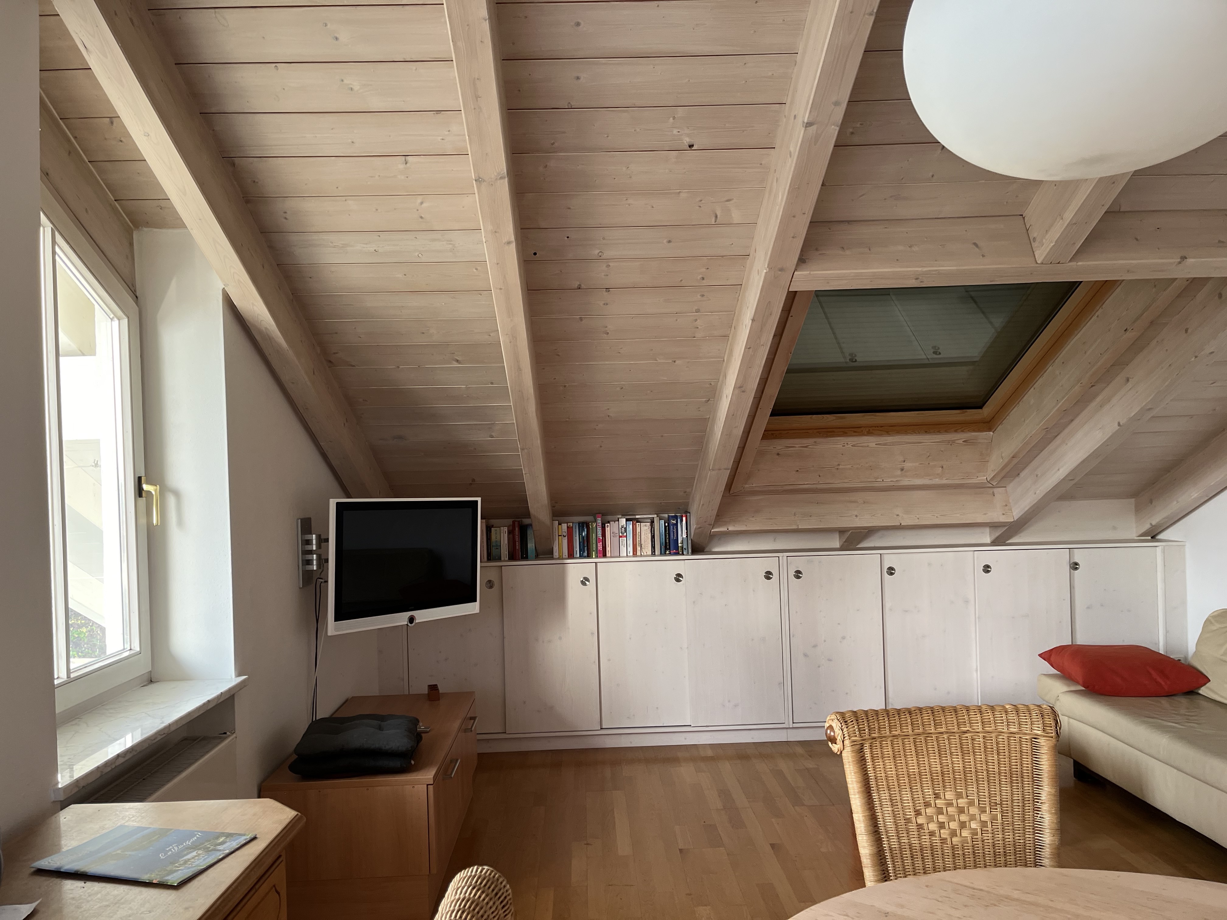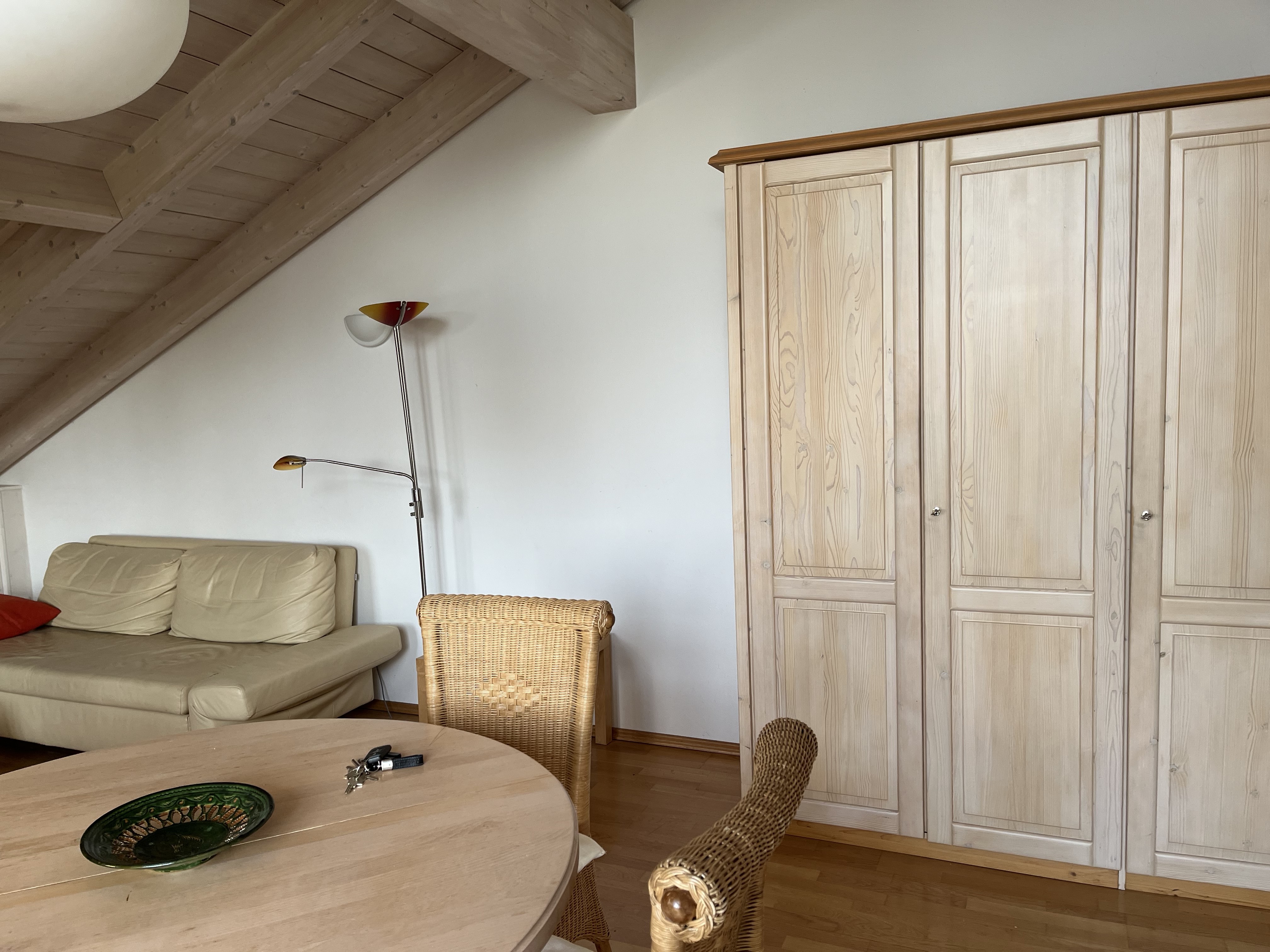 schöne, ruhige, lichtdurchflutete 2- Zimmerwohnung im Dachgeschoss mit großem Südbalkon. Wohnzimmer mit Schlafcouch, großem Flachbild-TV, Radio, großem Esstisch mit Bergblick. Vollausgestattete Küche mit 3 Platten Herd, Backofen, Spülmaschine, Kühlschrank, Gefriertruhe. Schlafzimmer mit Doppelbett 160 x 200 cm, Echtholzeinbauschränke, viel Stauraum. Neu renoviertes Bad mit Naturstein, großer Dusche. W-Lan, elektrische Rollos. Waschmaschine und Trockner im Keller zur Mitbenutzung.
