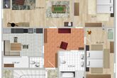 Die Wohnung hat ein geräumiges Wohnzimmer, zwei Schlafzimmer und eine Küche.