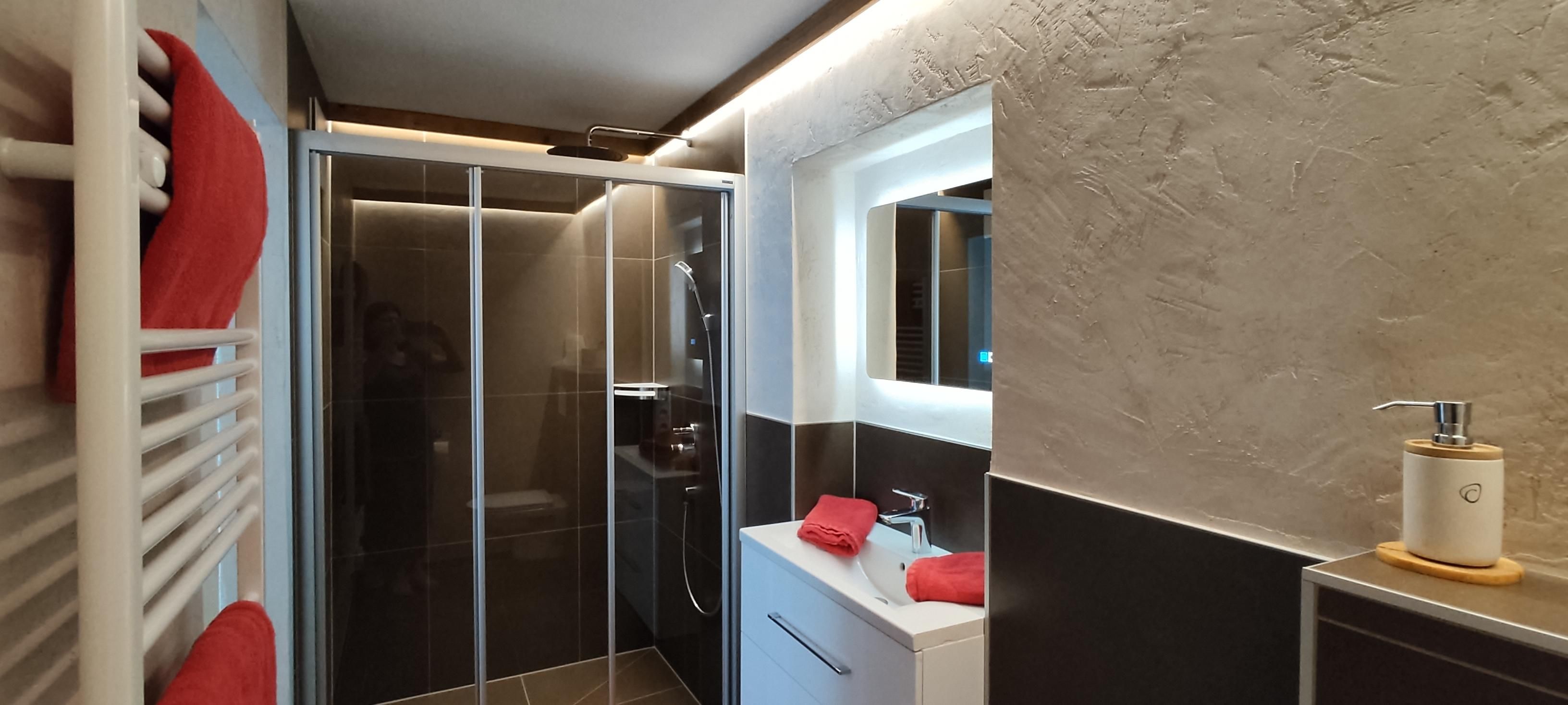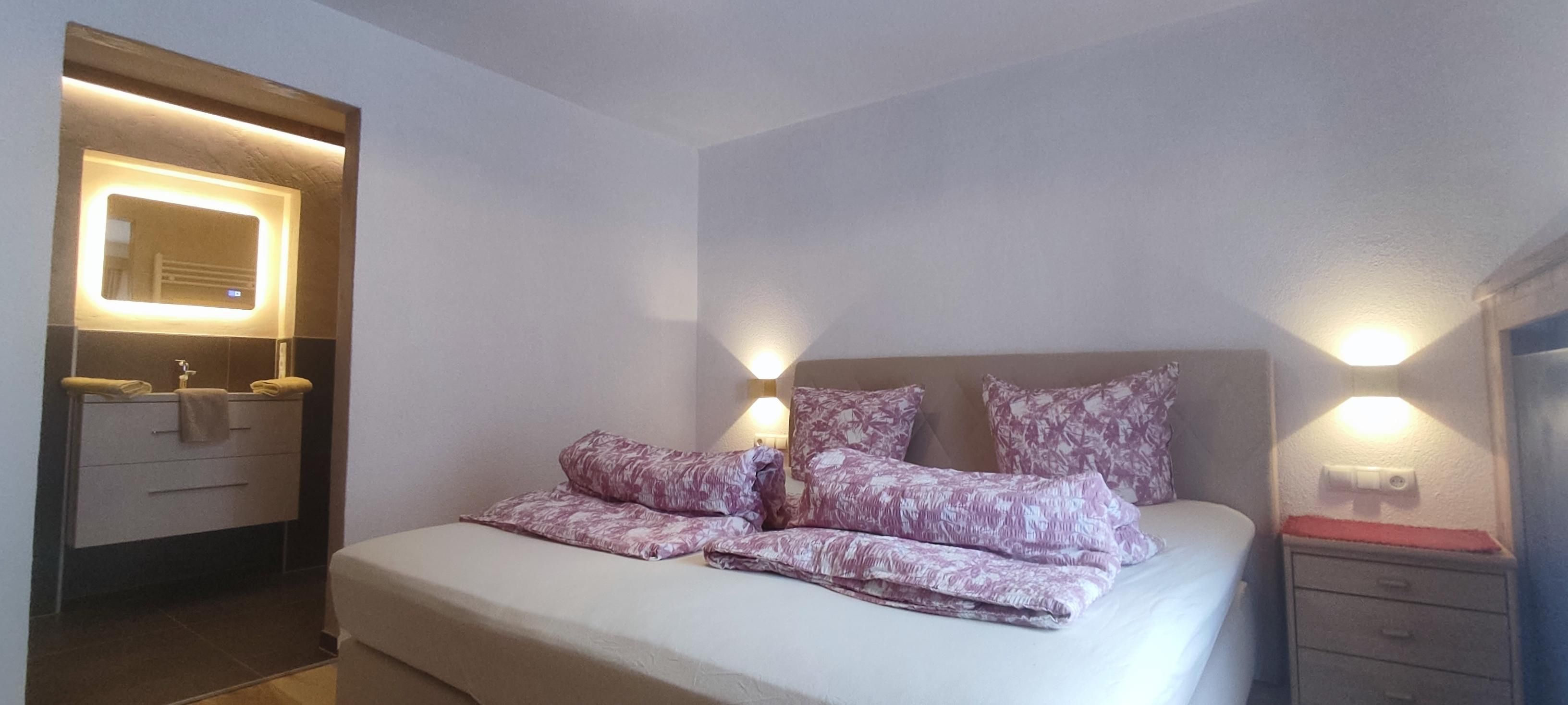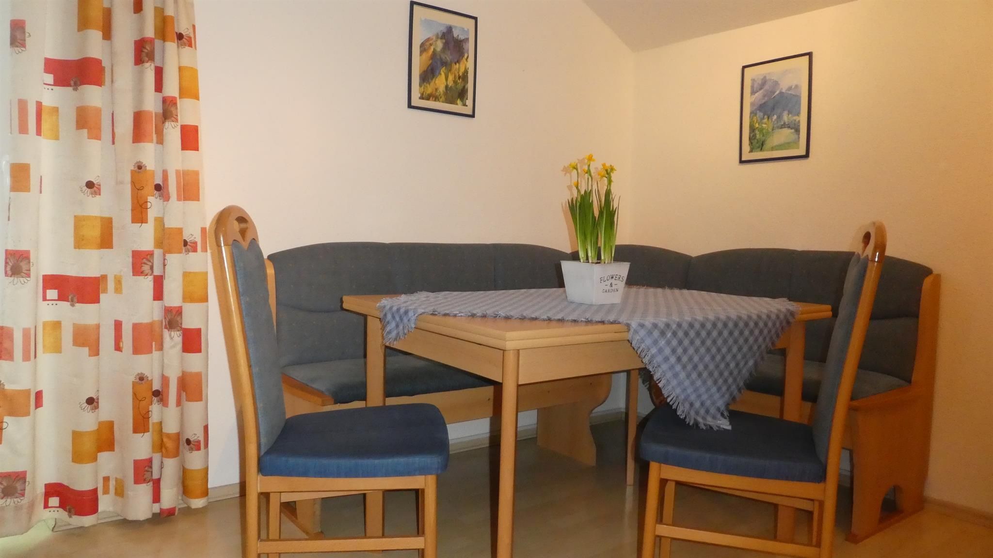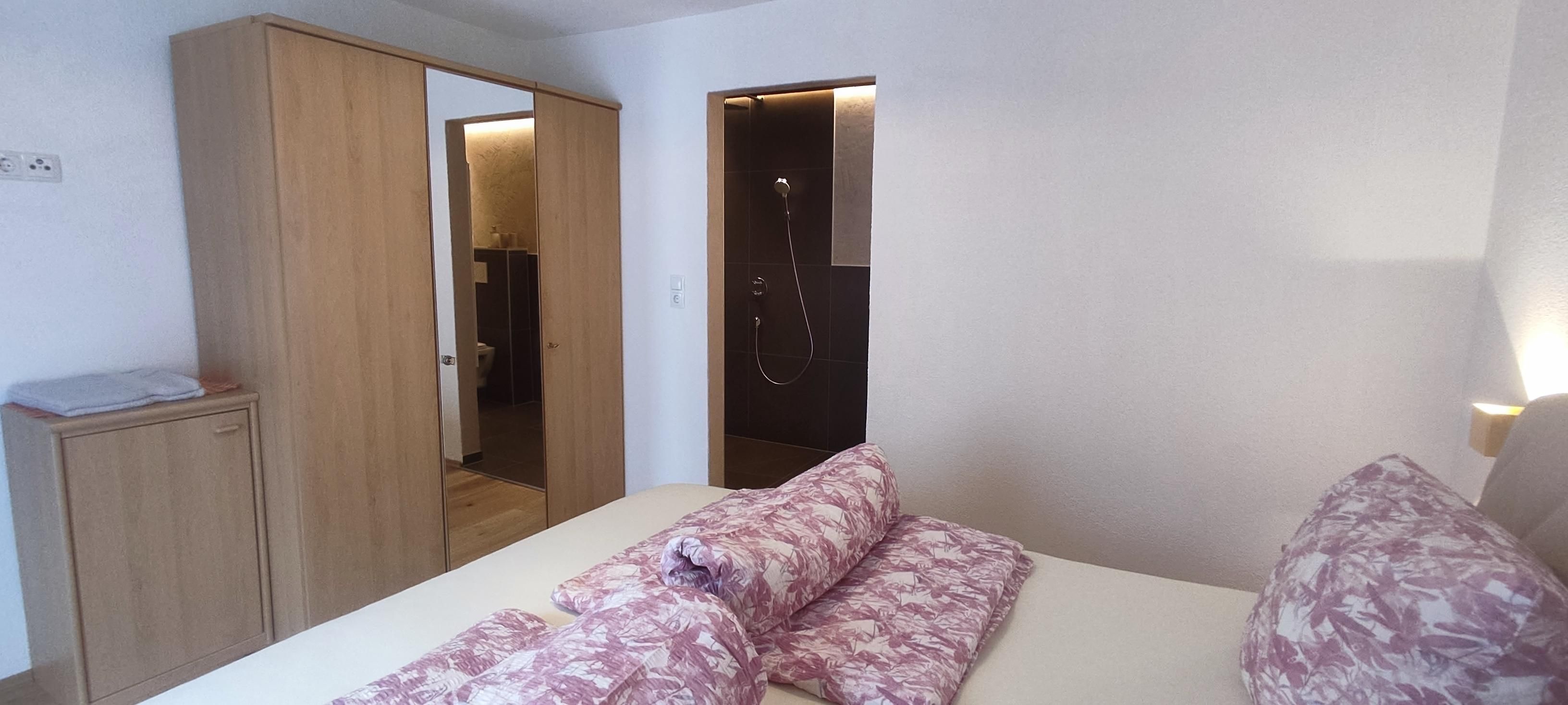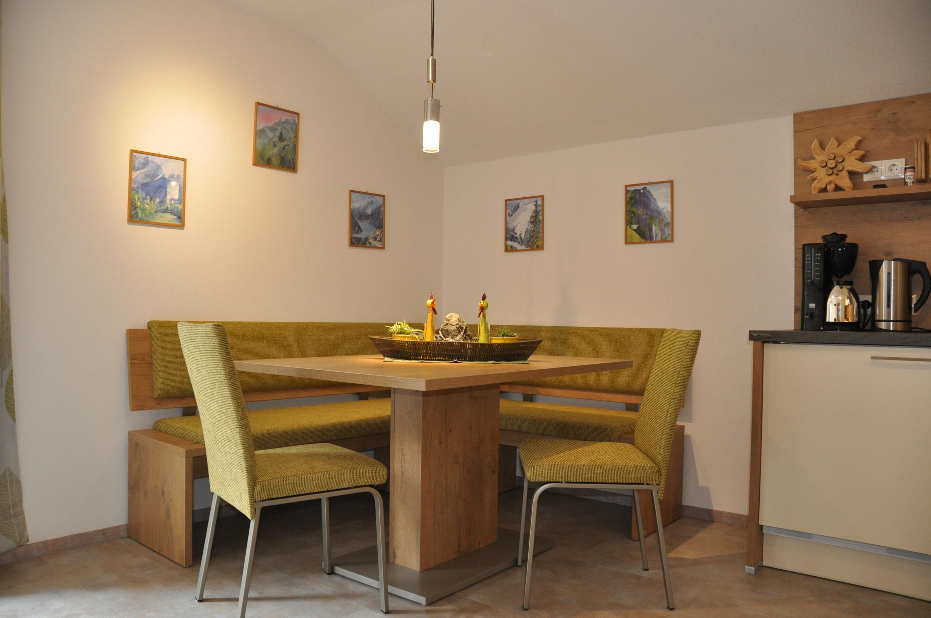 Appartement Alpenrose bestehend aus Wohnküche mit E-Herd und 4 Cerankochplatten, Geschirrspülmaschine, Kühlschrank, Kaffeemaschine und Wasserkocher, Toaster und Eierkocher sowie gemütlicher Sitz-Essecke, ausziehbare Couch für 1 Person, Flat-SAT-TV und Radio, Balkon sowie separates Doppelbettschlafzimmer mit Dusche/WC und Balkon.