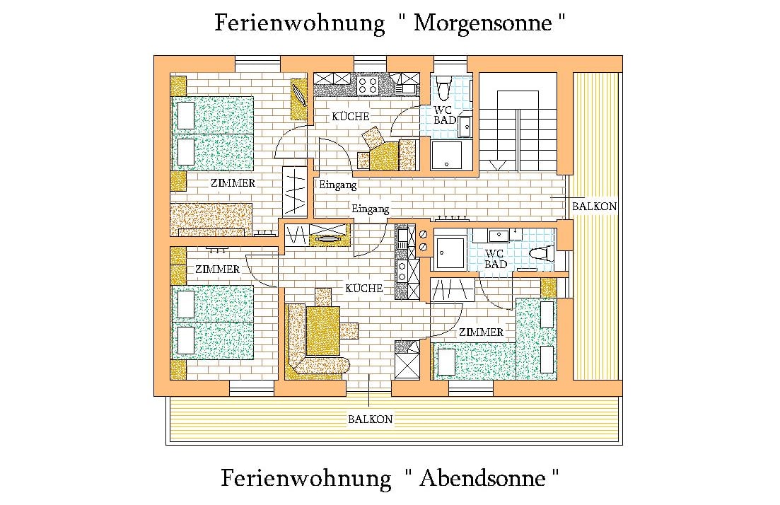 • Ferienwohnung Abendsonne (48 m²) mit 2 Schlafzimmern (eines mit Doppelbett, eines mit zwei Einzelbetten), Wohnküche und Balkon