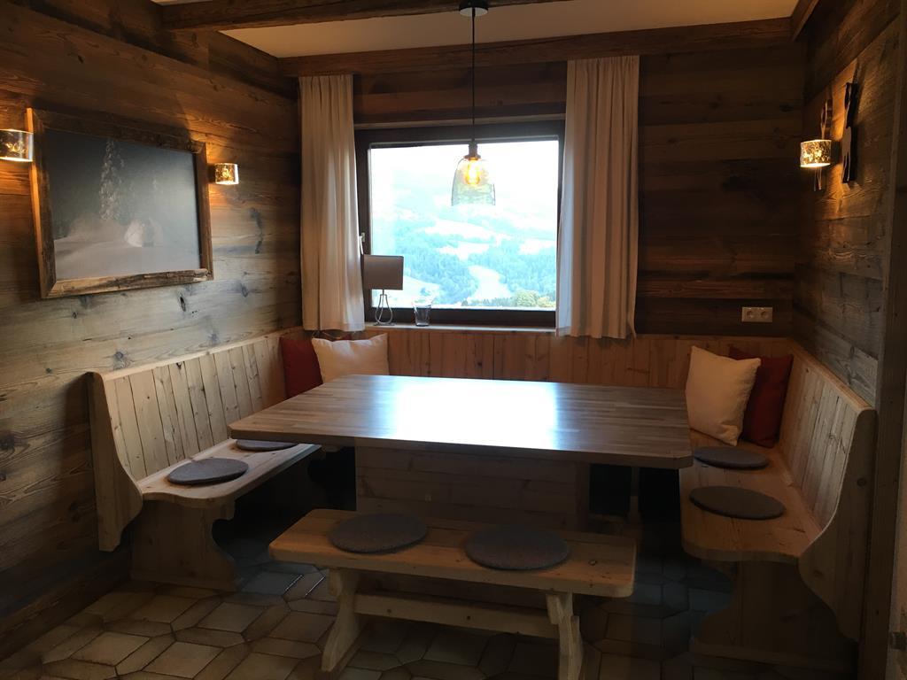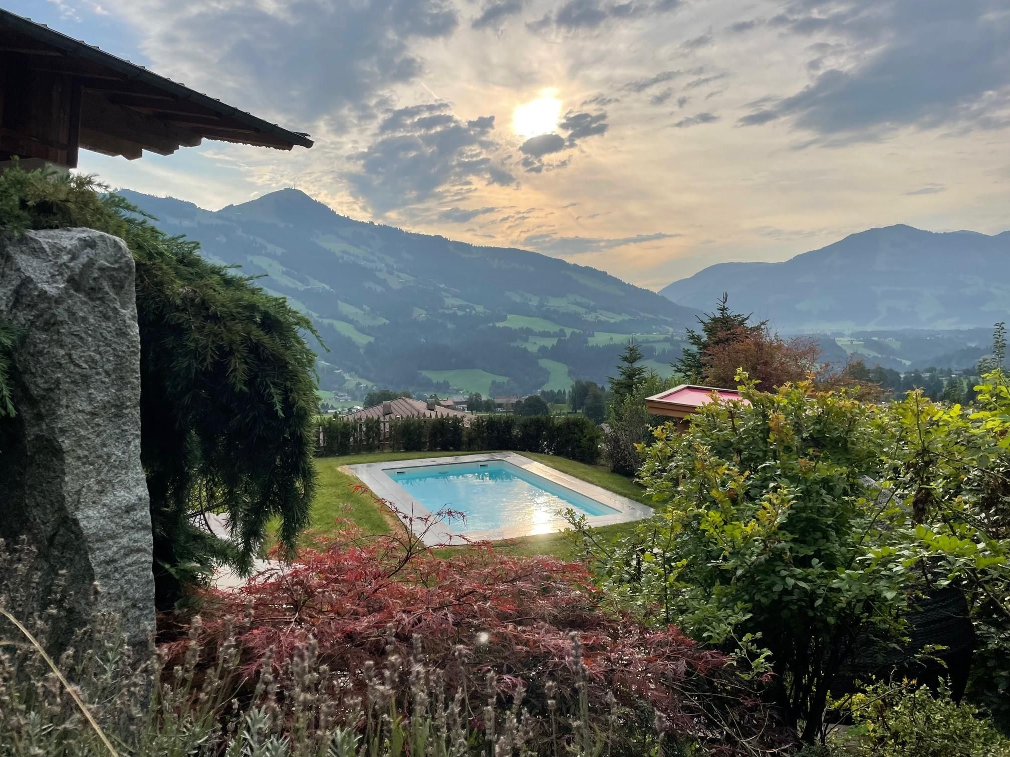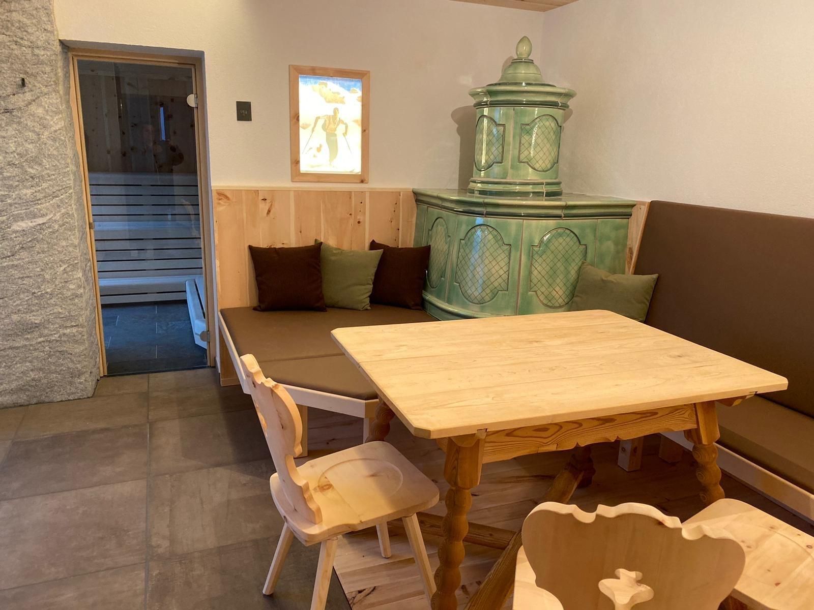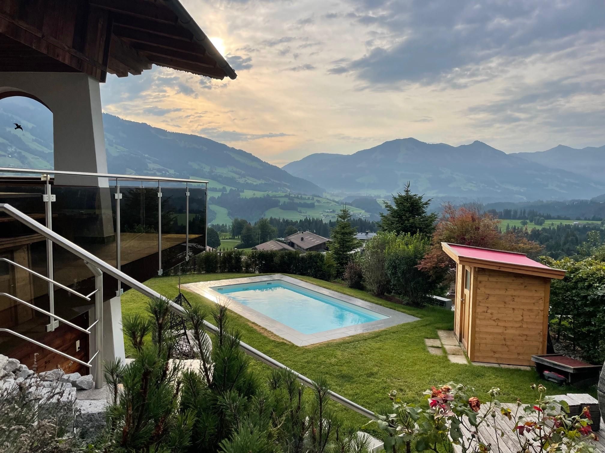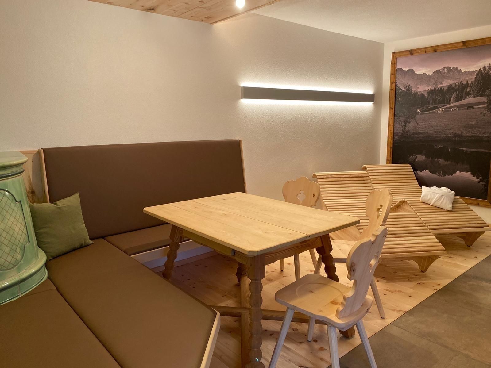 Genießen Sie Ihre Auszeit in unserer Panorama-Zirben Sauna mit Ausblick auf die Kitzbühler Alpen und gemütlichem Ruheraum der keine Wünsche offen lässt.